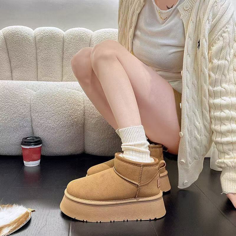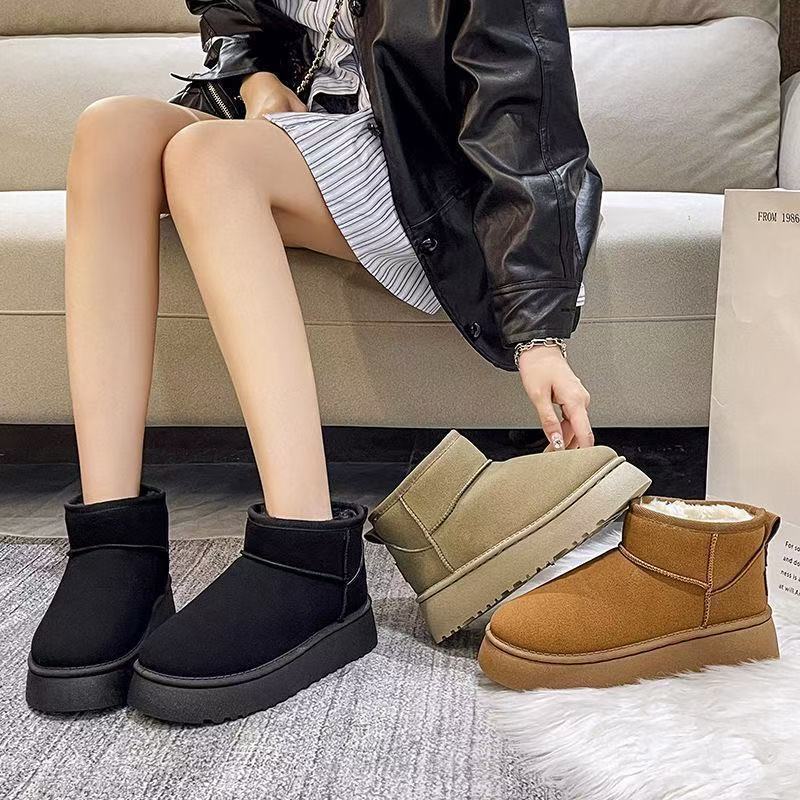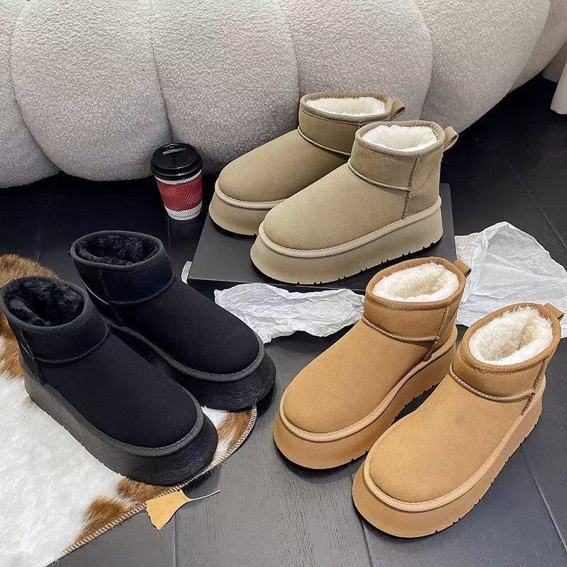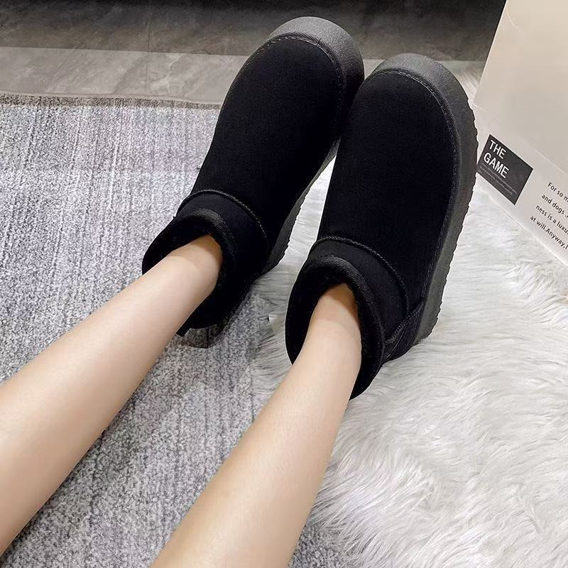 Thick soled snow boots for women, 2025 new style, warm winter with plush fur and short tube, thickened and raised, anti slip cotton shoes