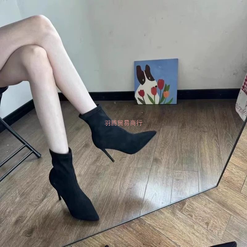 Thin heels, high heels, short boots, children's new style for autumn and winter 2025, pointed suede elastic slimming boots, slimming mid length socks boots