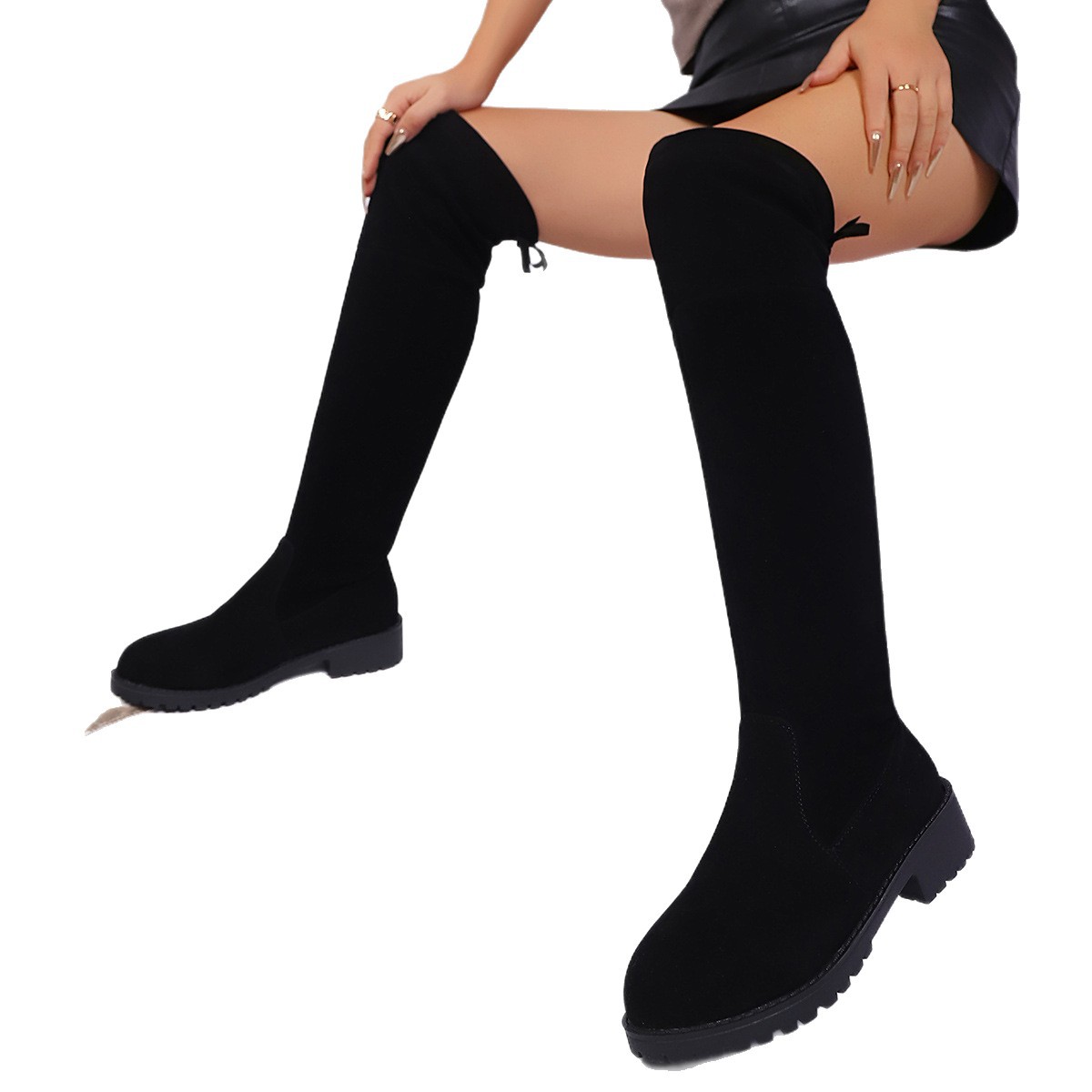Осень - зима 2025 Новые европейские и американские задние шнурки Высокие коленные сапоги Женщины тонкие толстые с круглыми упругими сапогами