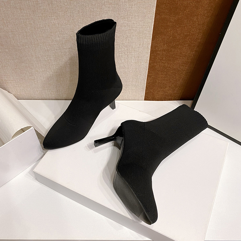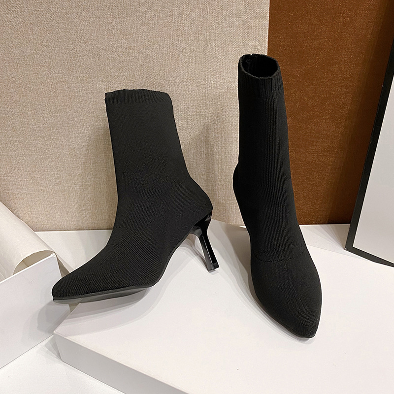 Носки Женские сапоги Осень - зима 2025 Новые острые каблуки Сетька красные тонкие сапоги эластичные короткие сапоги средняя женская обувь
