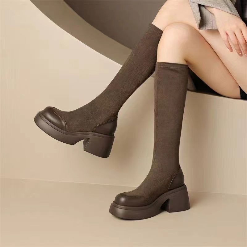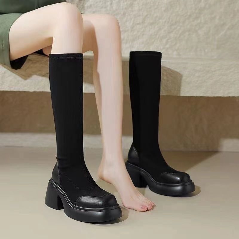 Martin boots elastic boots 2024 autumn and winter height increasing casual slim boots black thick soled women's knee high boots women's boots