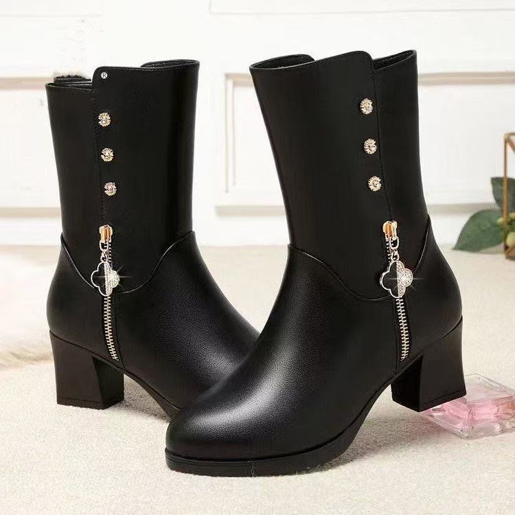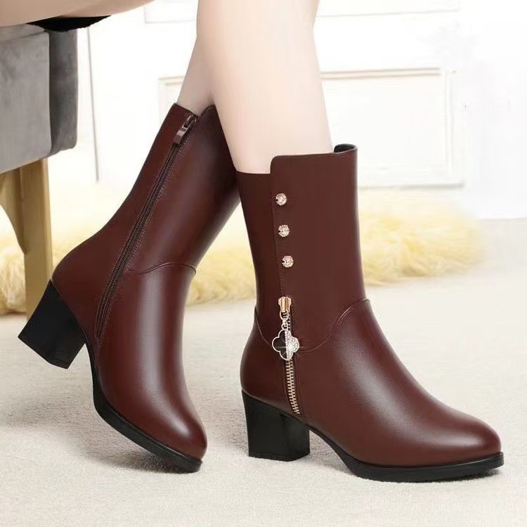 2025 Winter Warm Mid Top Women's Boots with Velvet Soft Leather Coarse Heel Anti slip Mom Cotton Boots Fashion Versatile High Heel Leather Boots