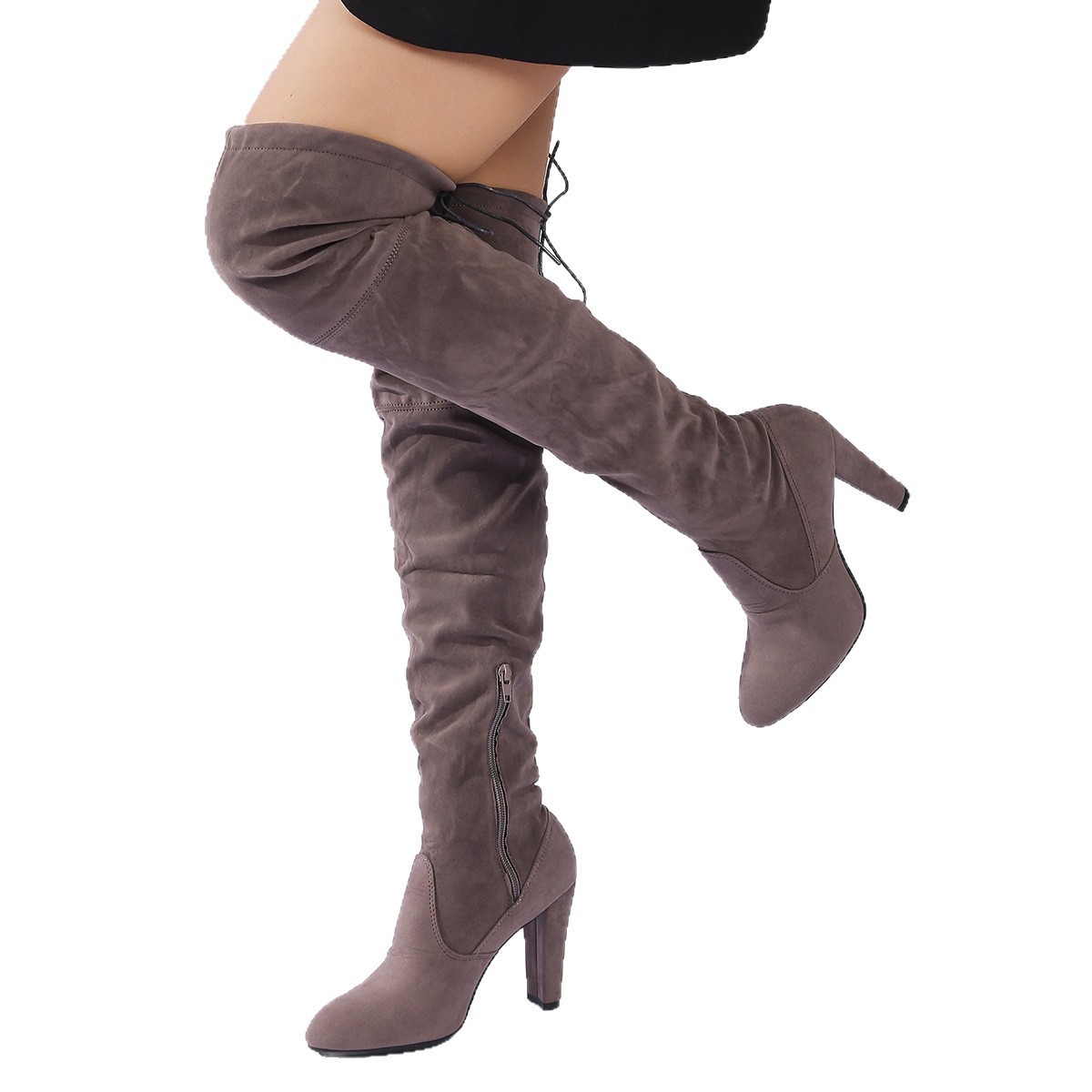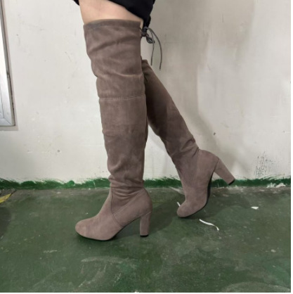 Autumn and winter new foreign trade plus size knee high elastic boots with high heels, thick heels, pointed toes, solid color long tube suede women's boots in stock