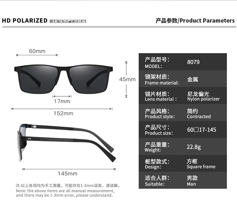 8079 Нейлоновые поляризованные солнцезащитные очки мужская металлическая рамка движущиеся квадратные солнцезащитные очки