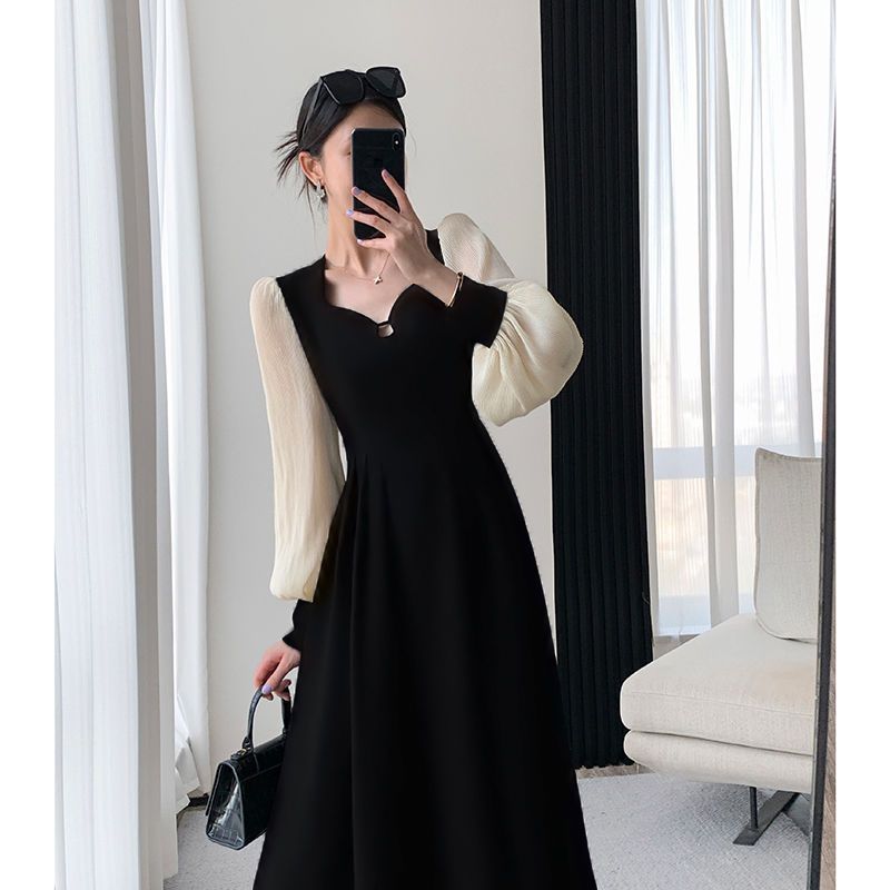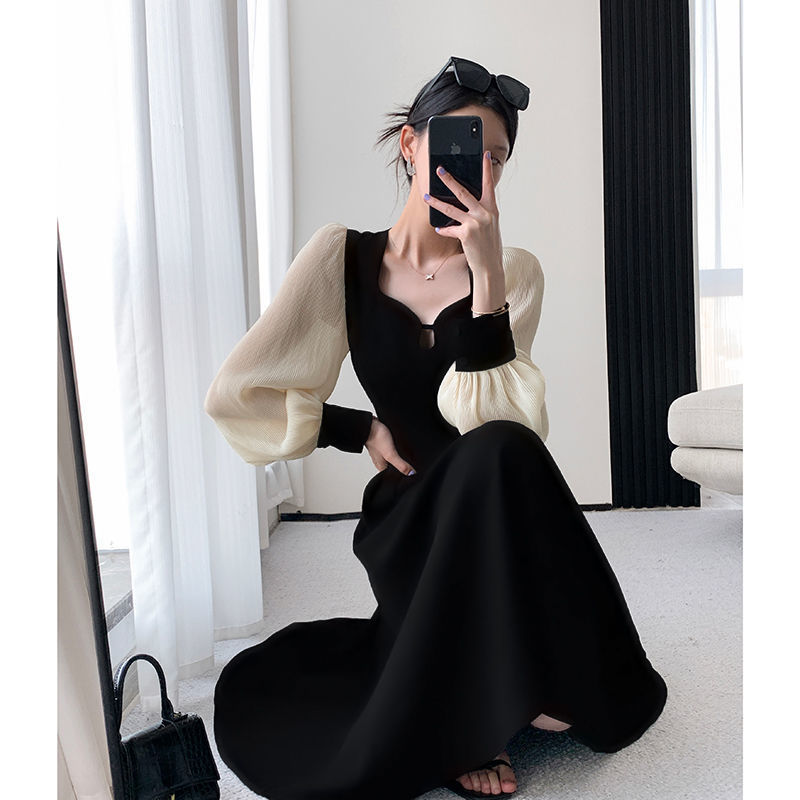 Large French Hepburn style chic long sleeved dress for women in spring, chubby little sister, covering her belly to show off her thinness, spliced long skirt