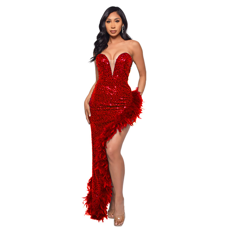| 流行元素 | 抹胸,亮片,珠片,羽毛,深V透视网纱,系带,露背,拉链 |