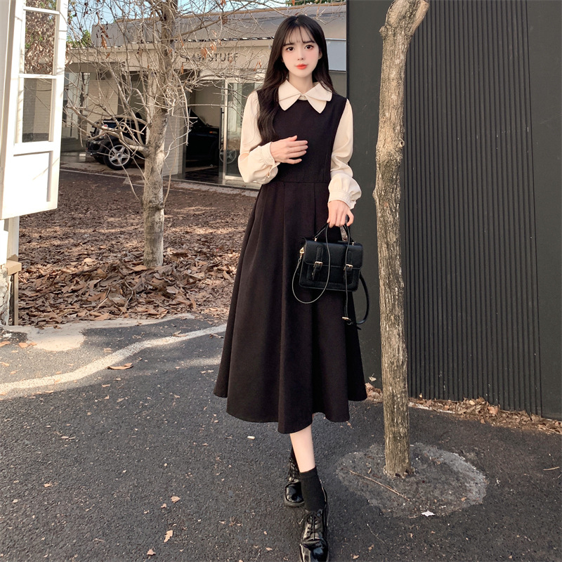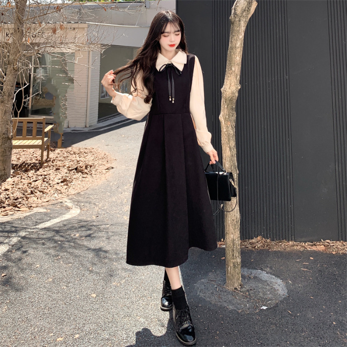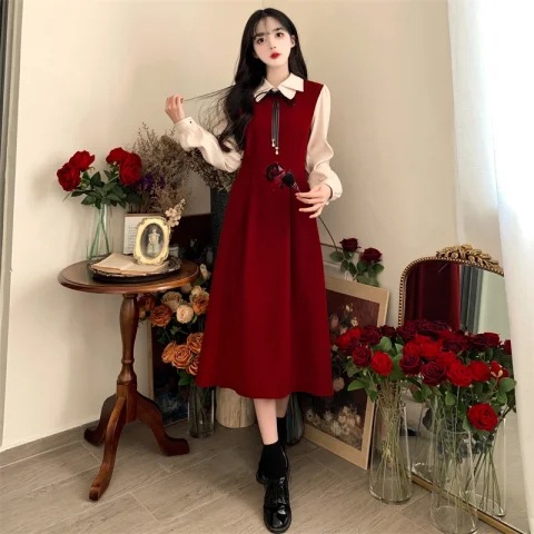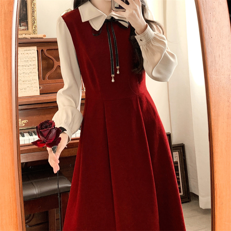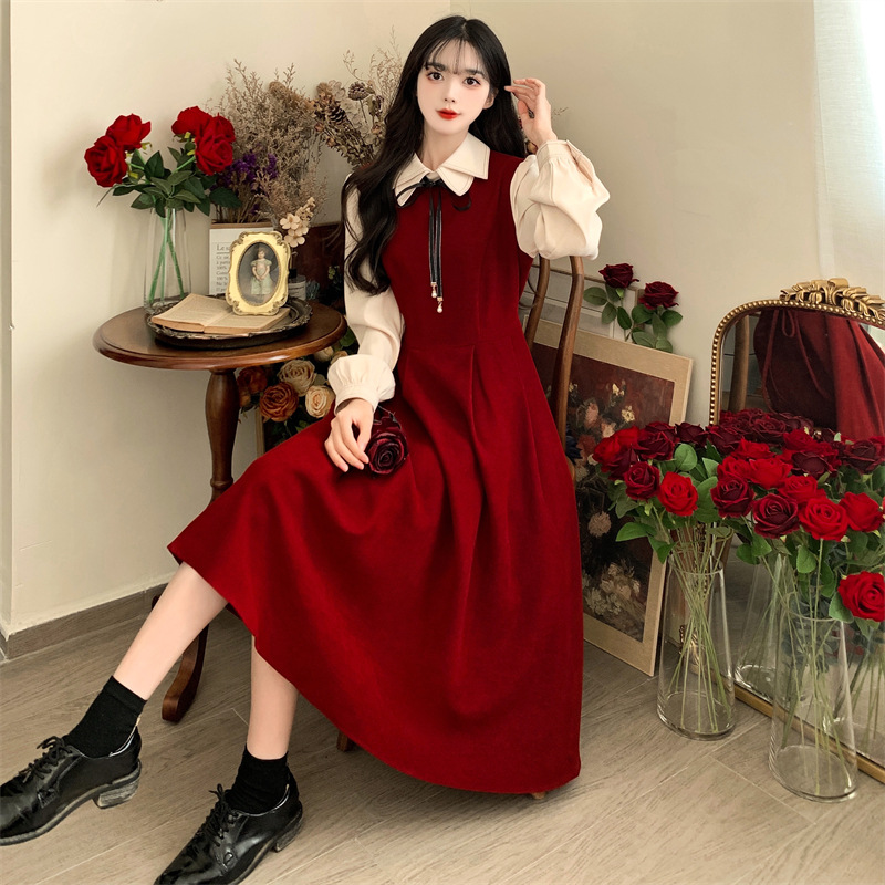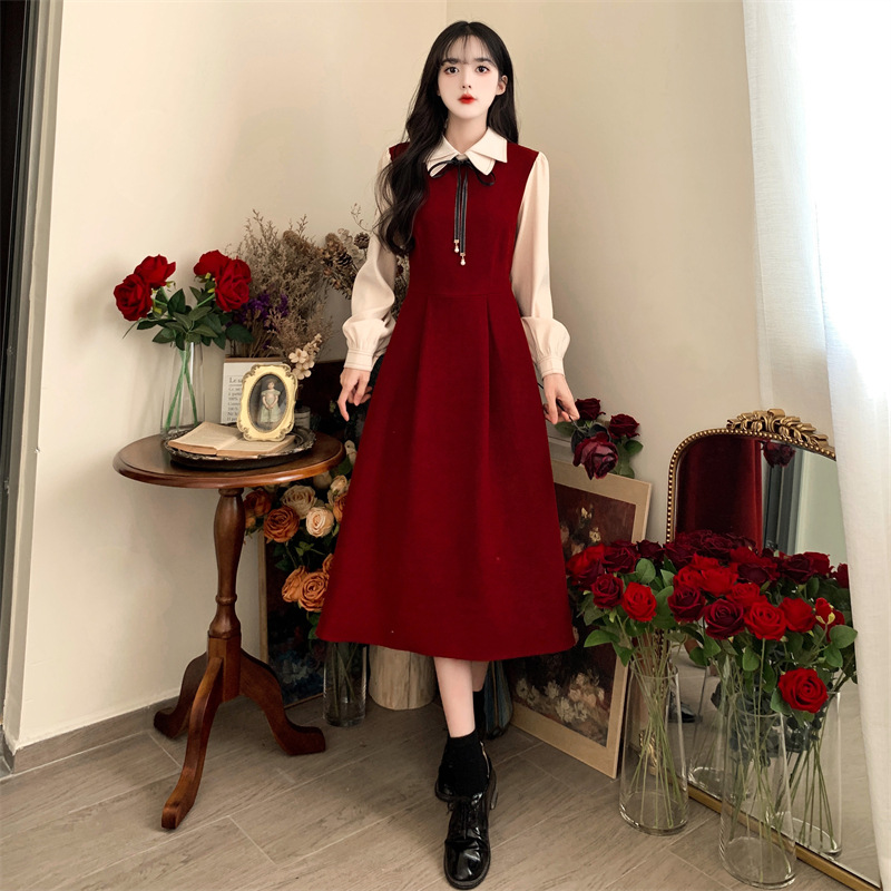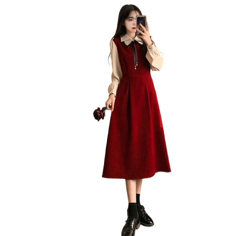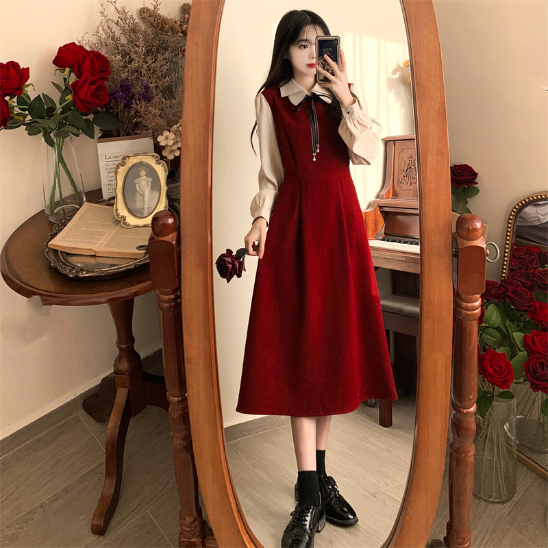 French retro college style double-layer collar red dress autumn and winter plus size Hepburn style fake two piece corduroy long dress