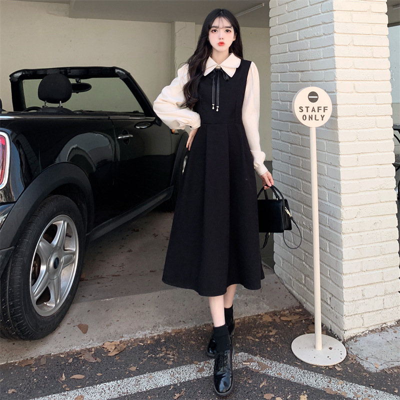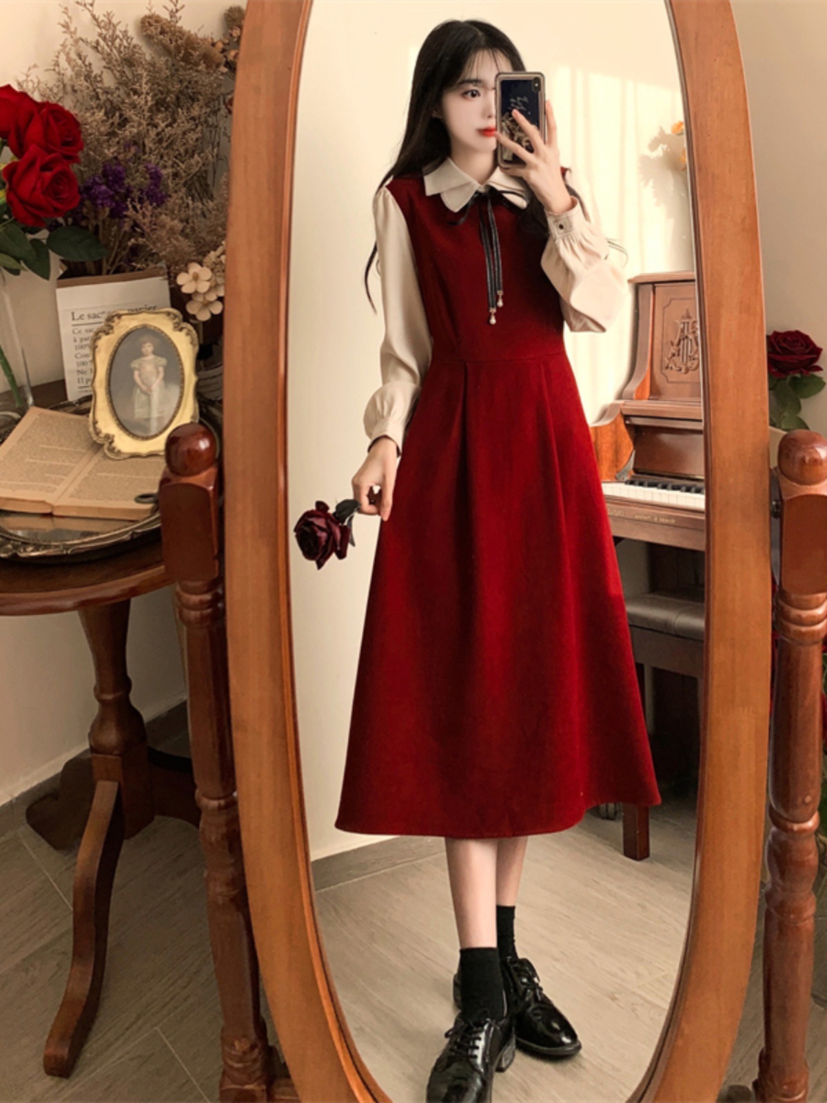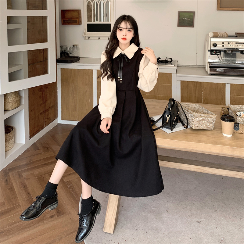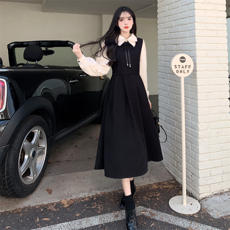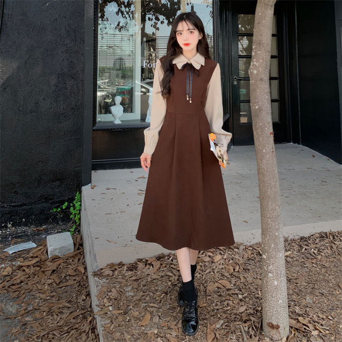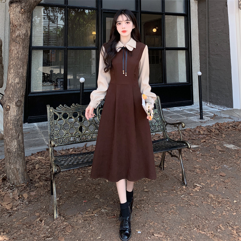 French retro college style double-layer collar red dress autumn and winter plus size Hepburn style fake two piece corduroy long dress