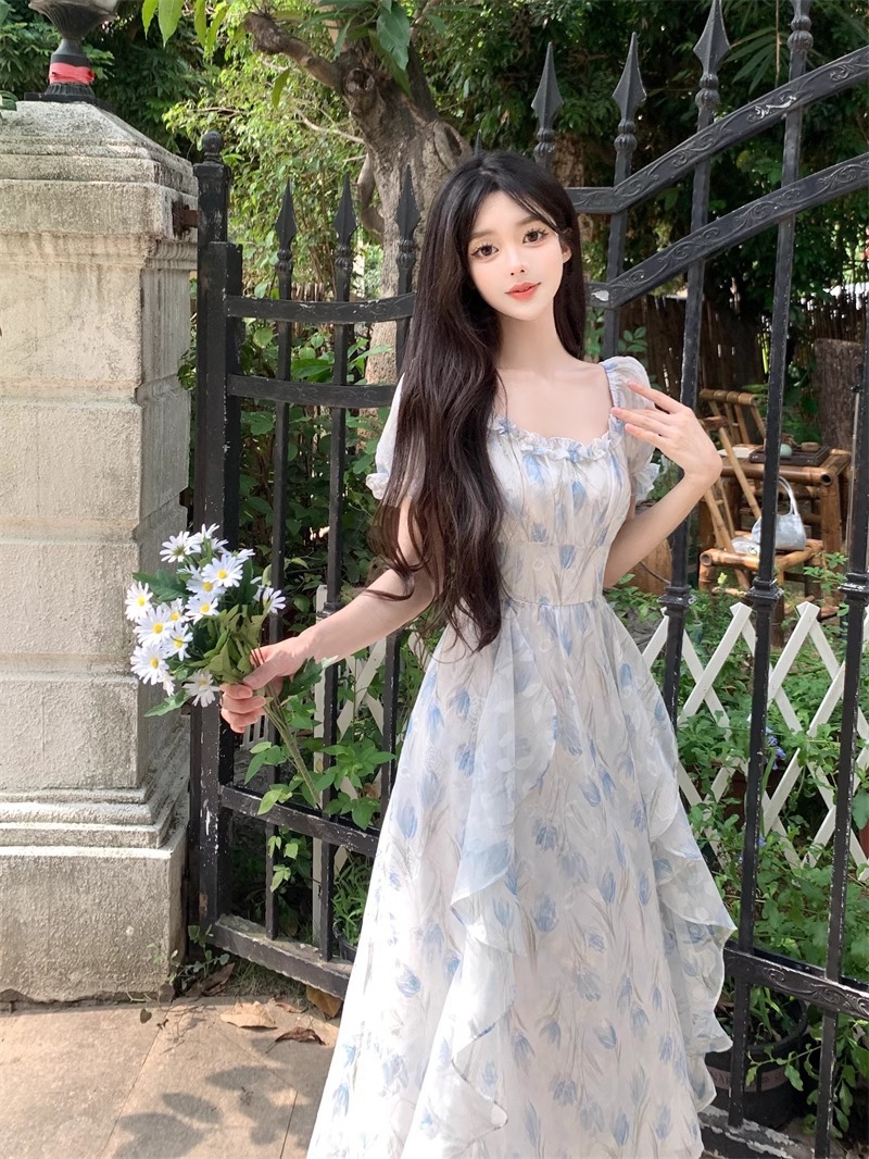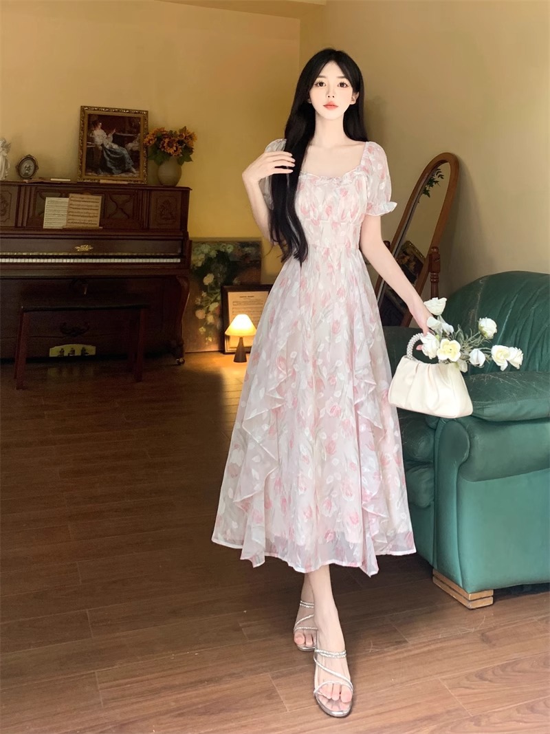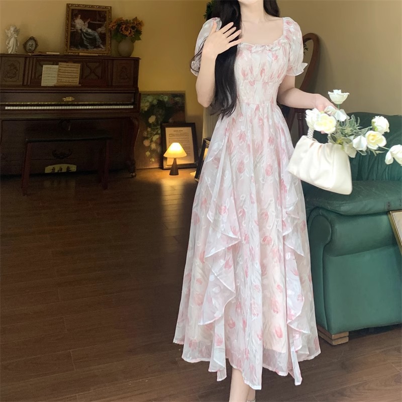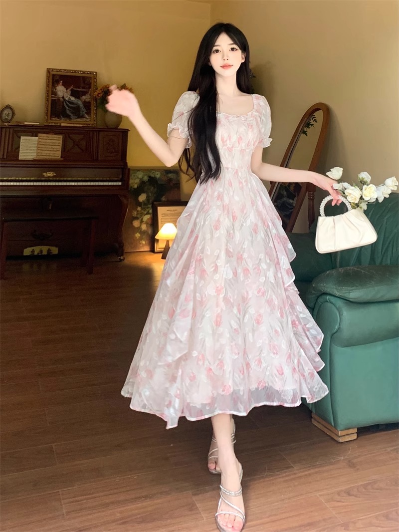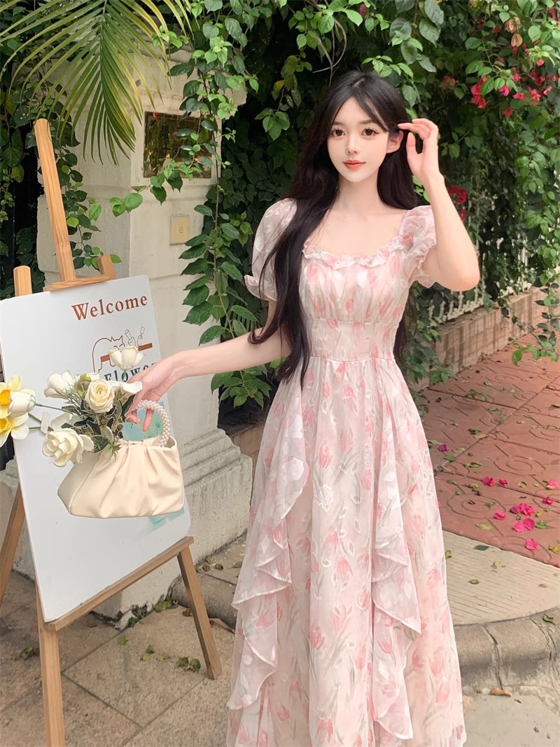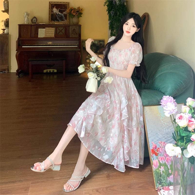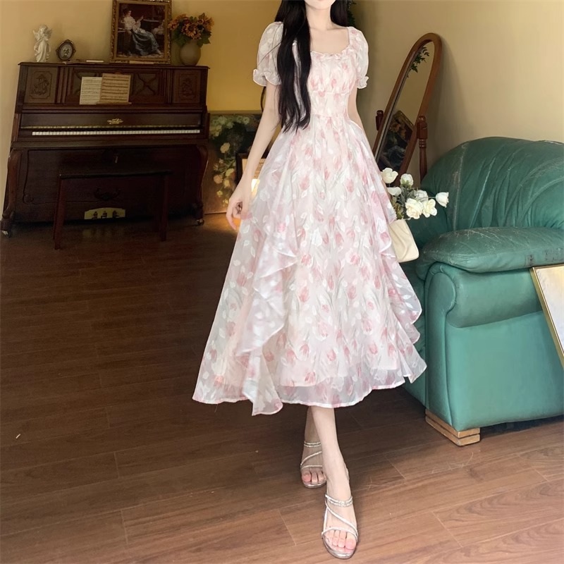 Первая любовь французский воротник романтический цветок платье из шелка женский летний темперамент толстая фея длинное платье