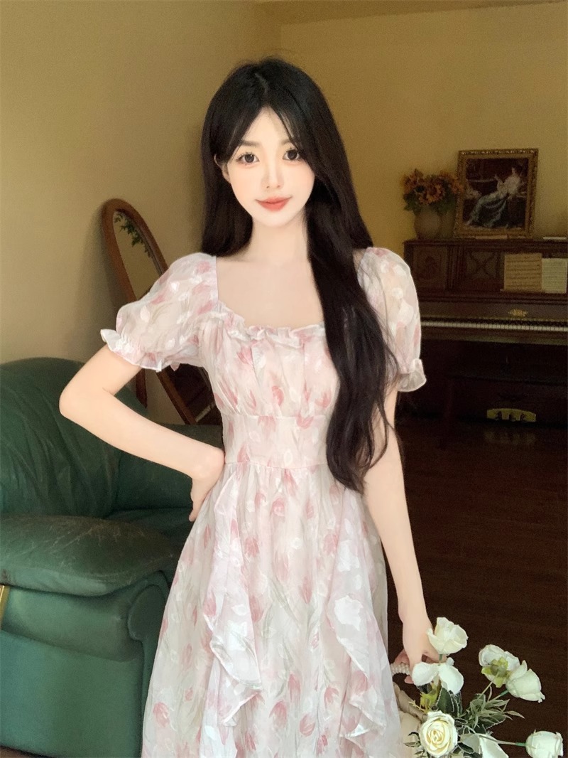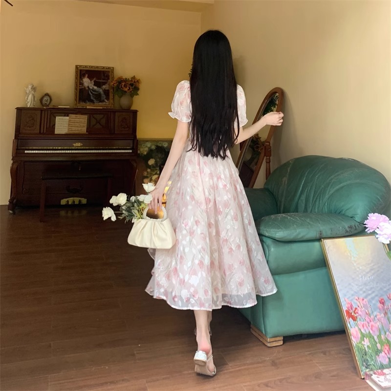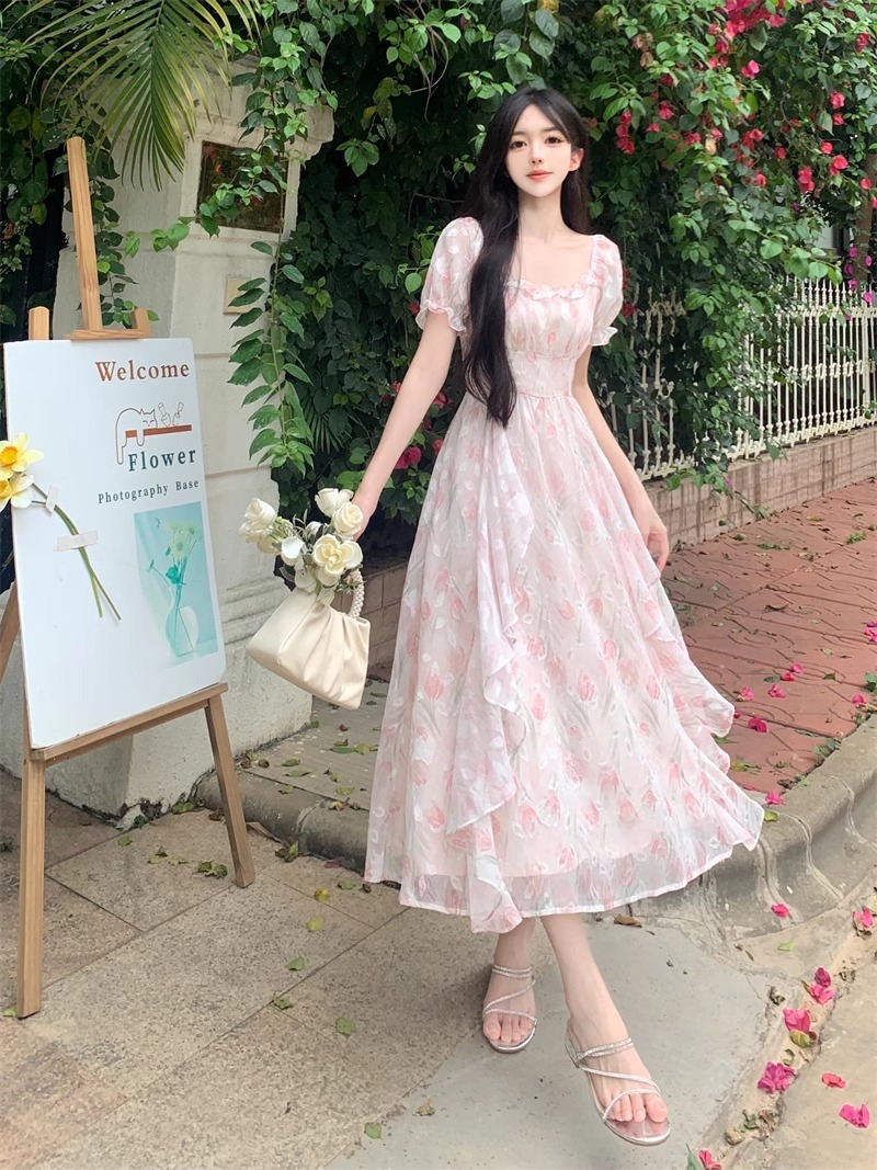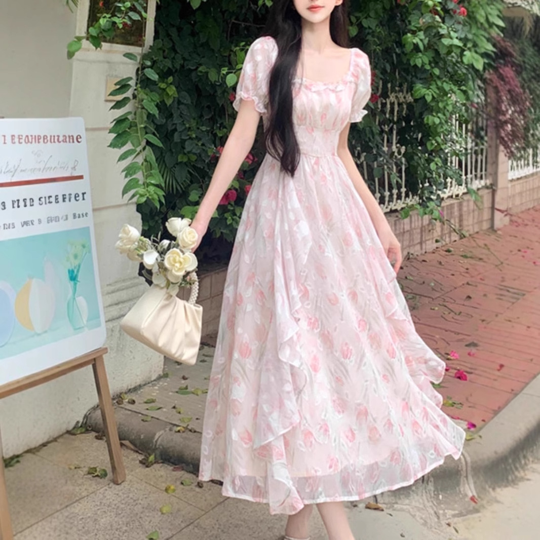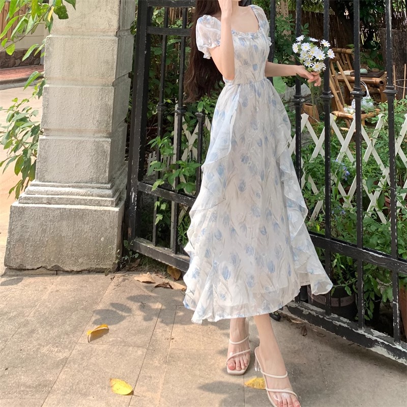 Первая любовь французский воротник романтический цветок платье из шелка женский летний темперамент толстая фея длинное платье