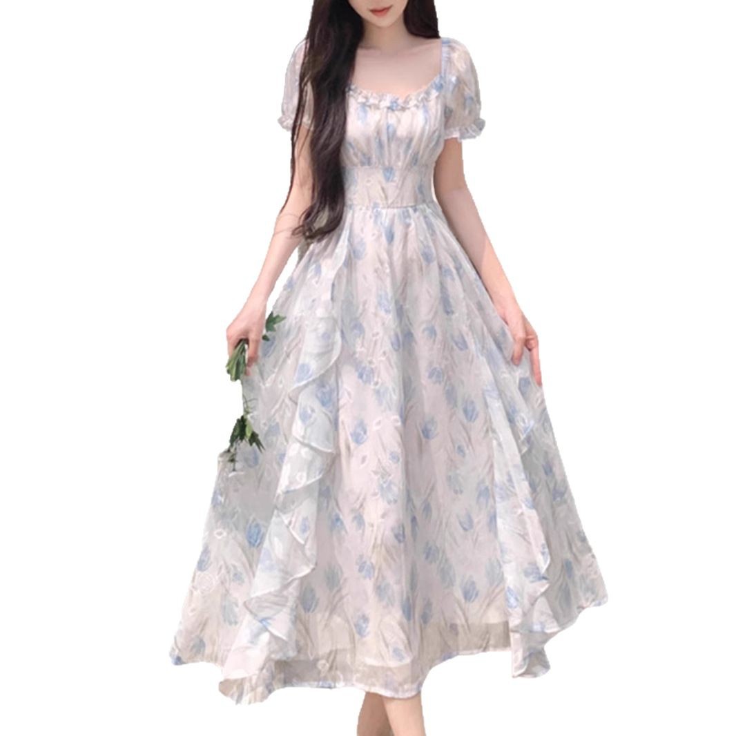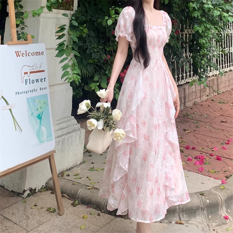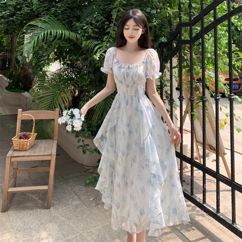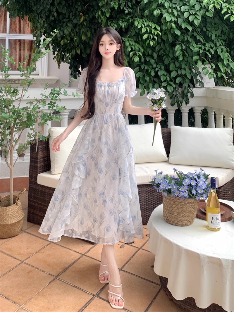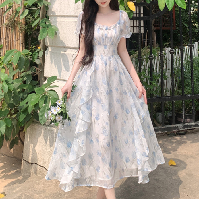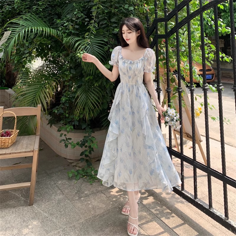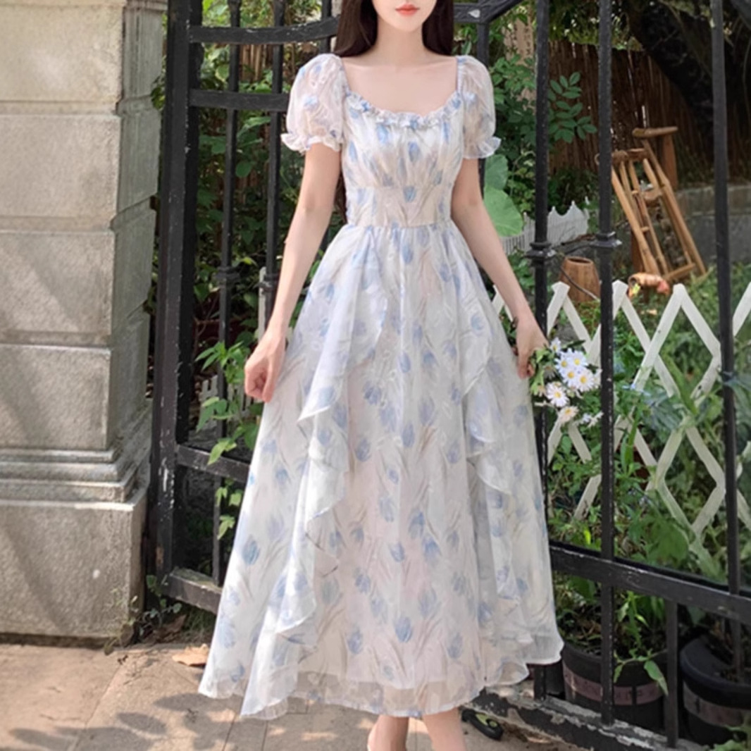 Первая любовь французский воротник романтический цветок платье из шелка женский летний темперамент толстая фея длинное платье
