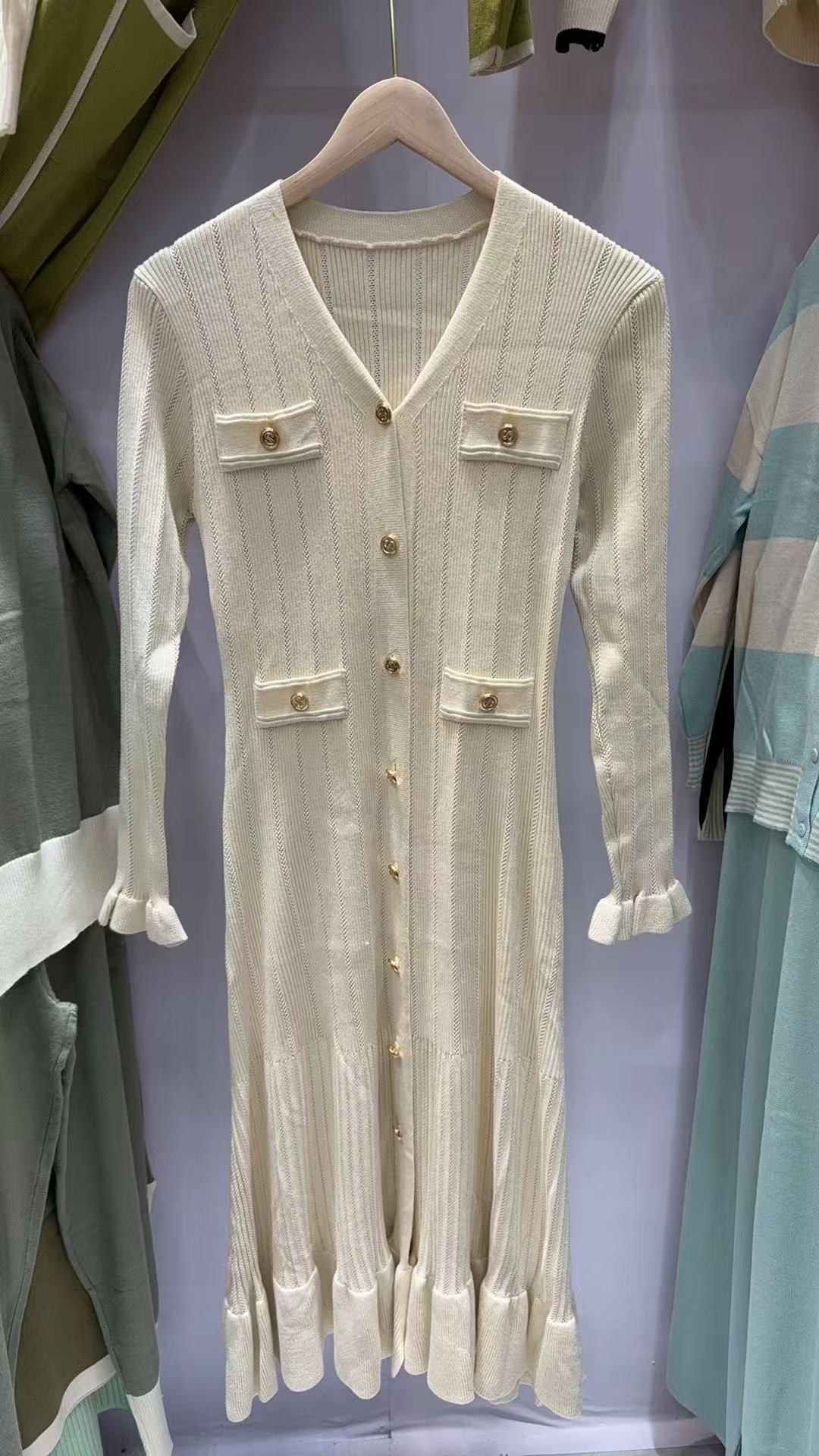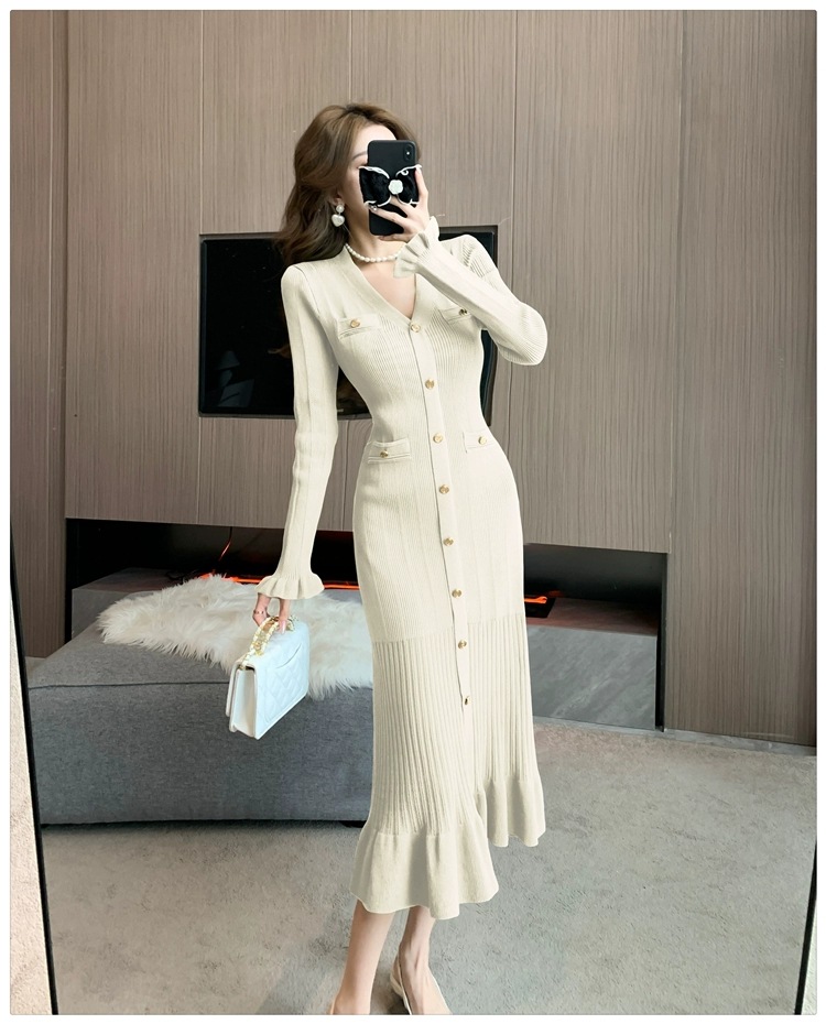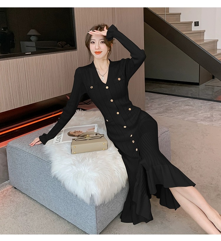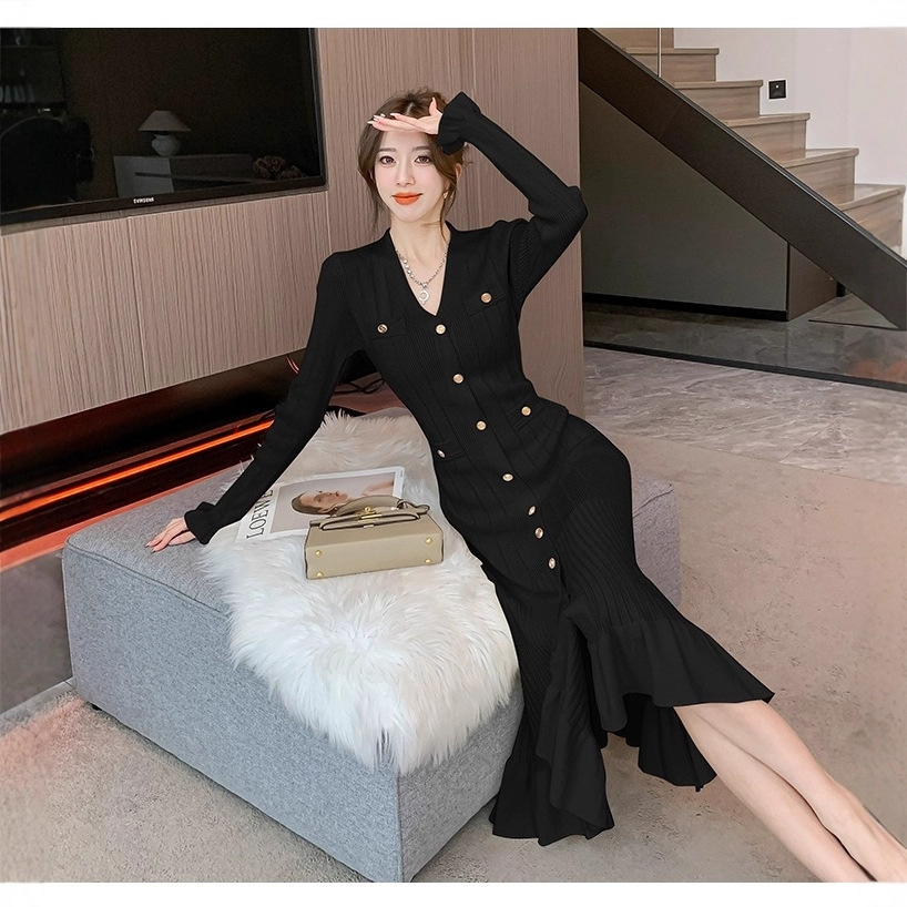 2025 Новая женская одежда черный V - воротник длинные юбки с длинным хвостом нарезанные юбки трикотажные юбки элегантные S - пуговицы платье