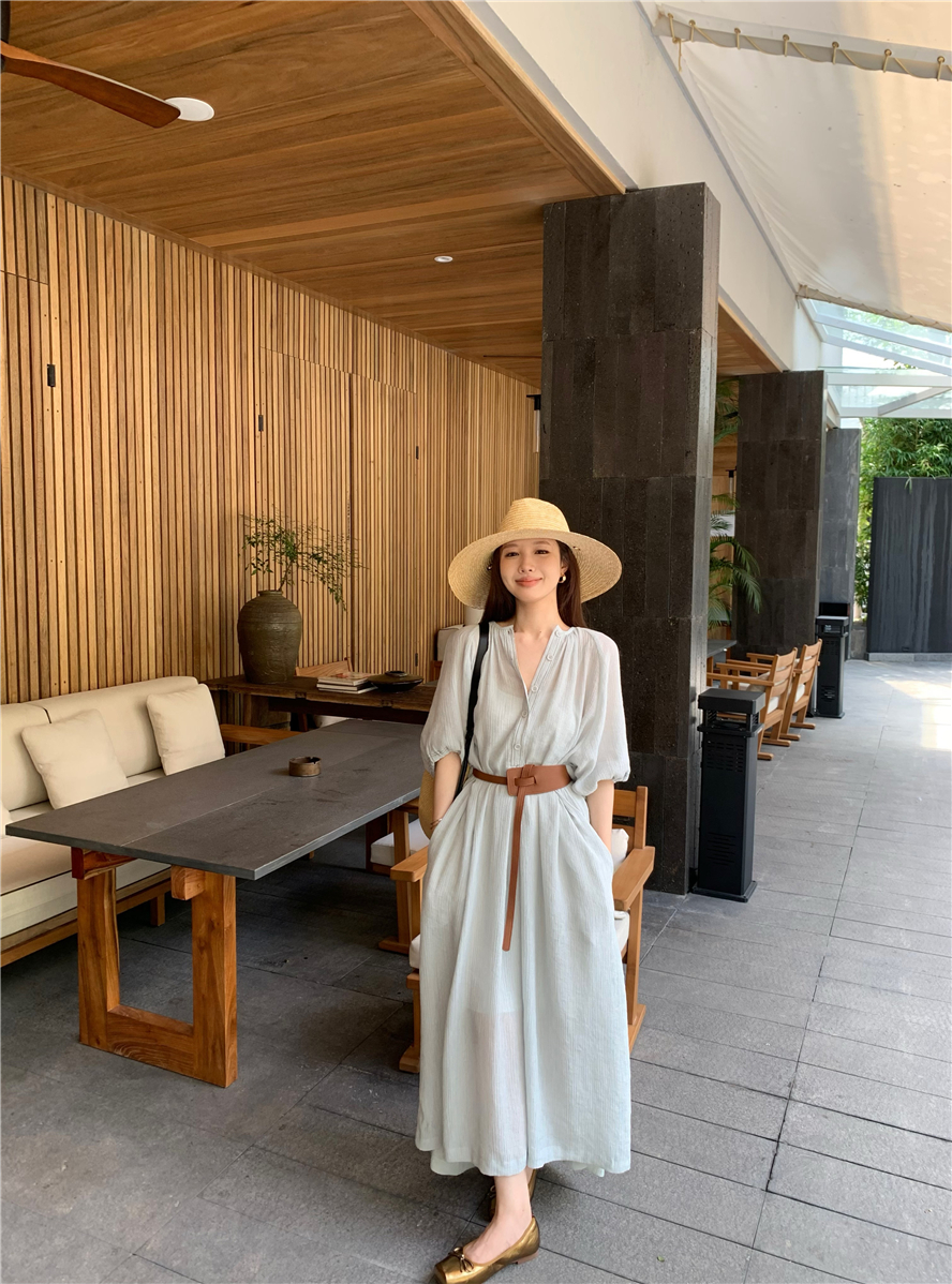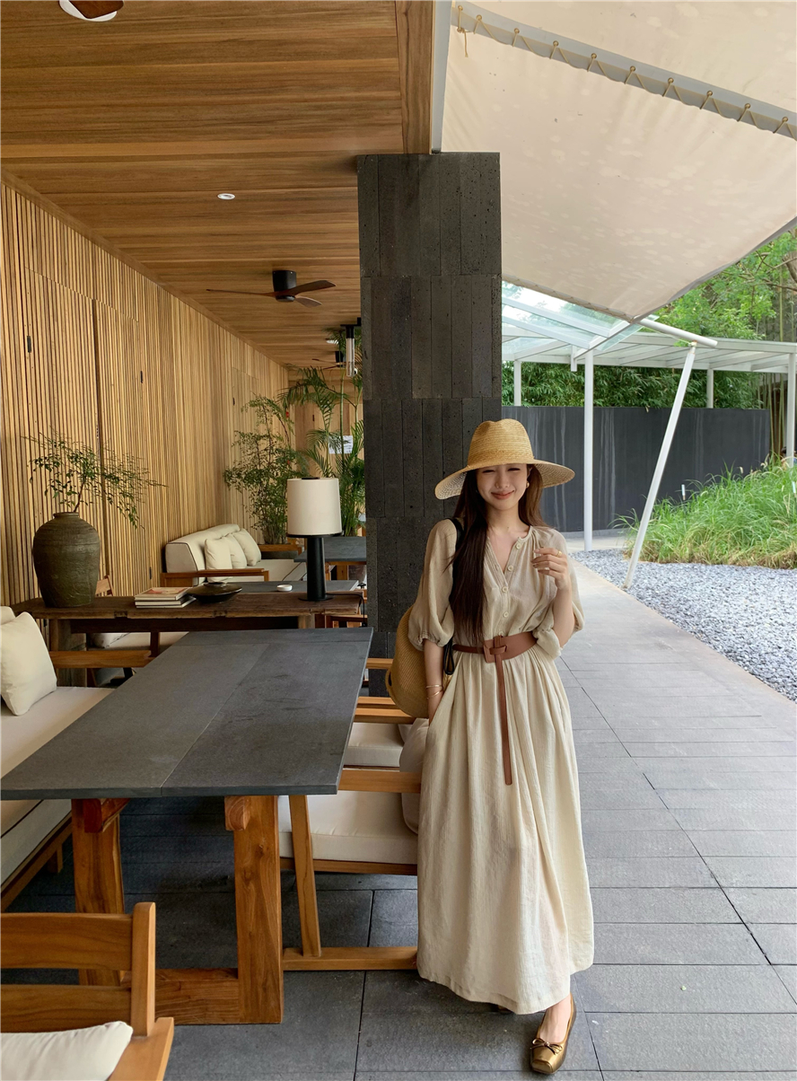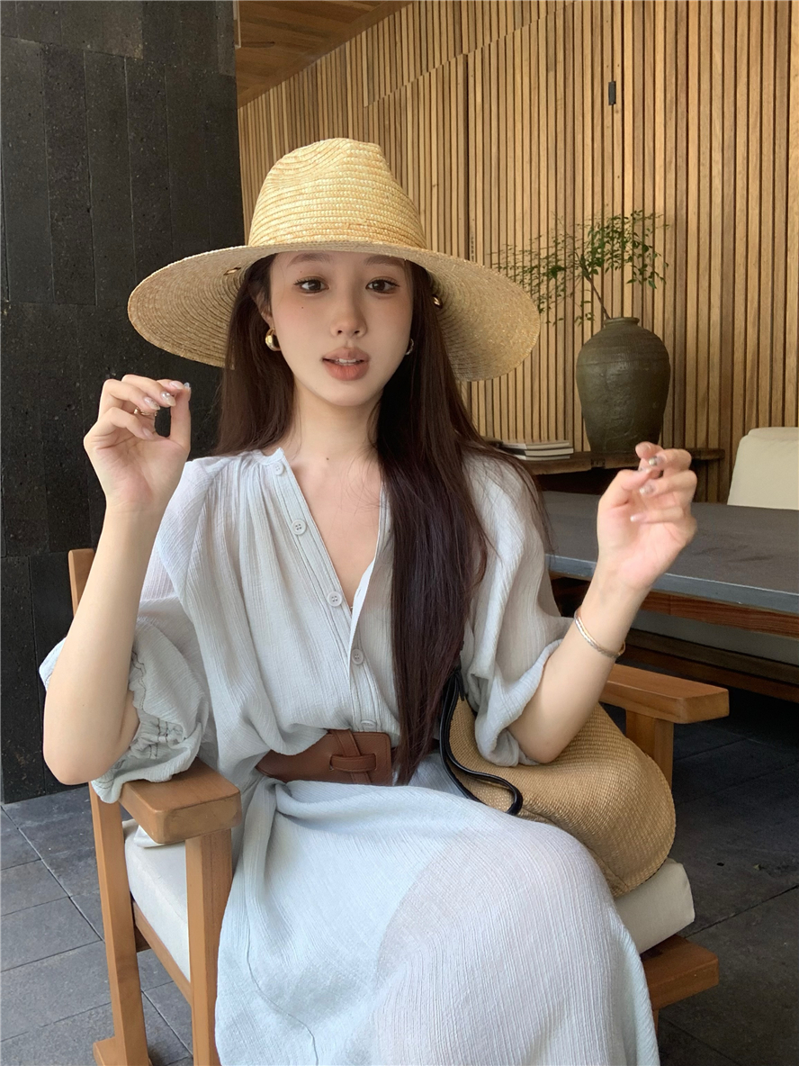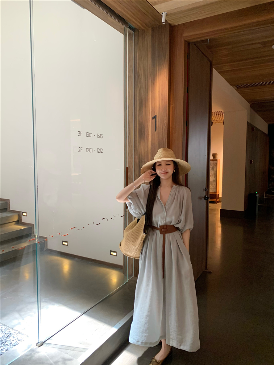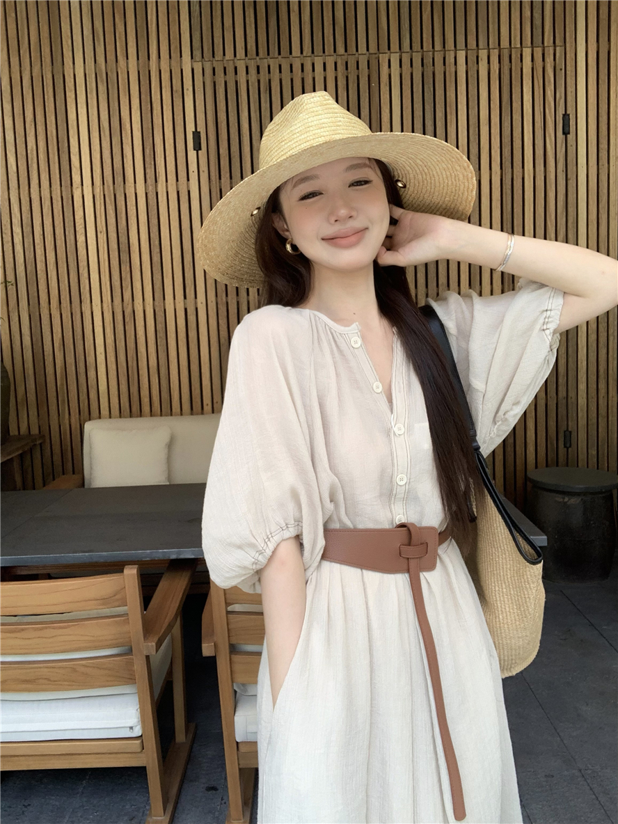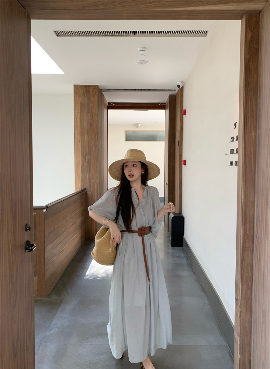 Large French style seaside dress for women in spring and summer, slightly overweight in mm, covering the belly to show off thinness, chiffon half sleeved long skirt