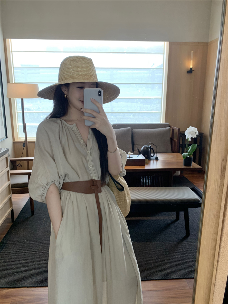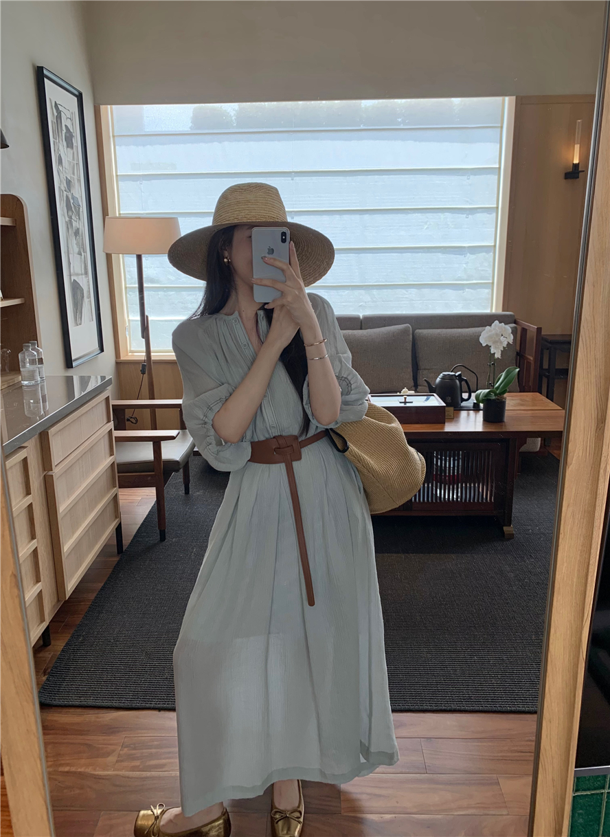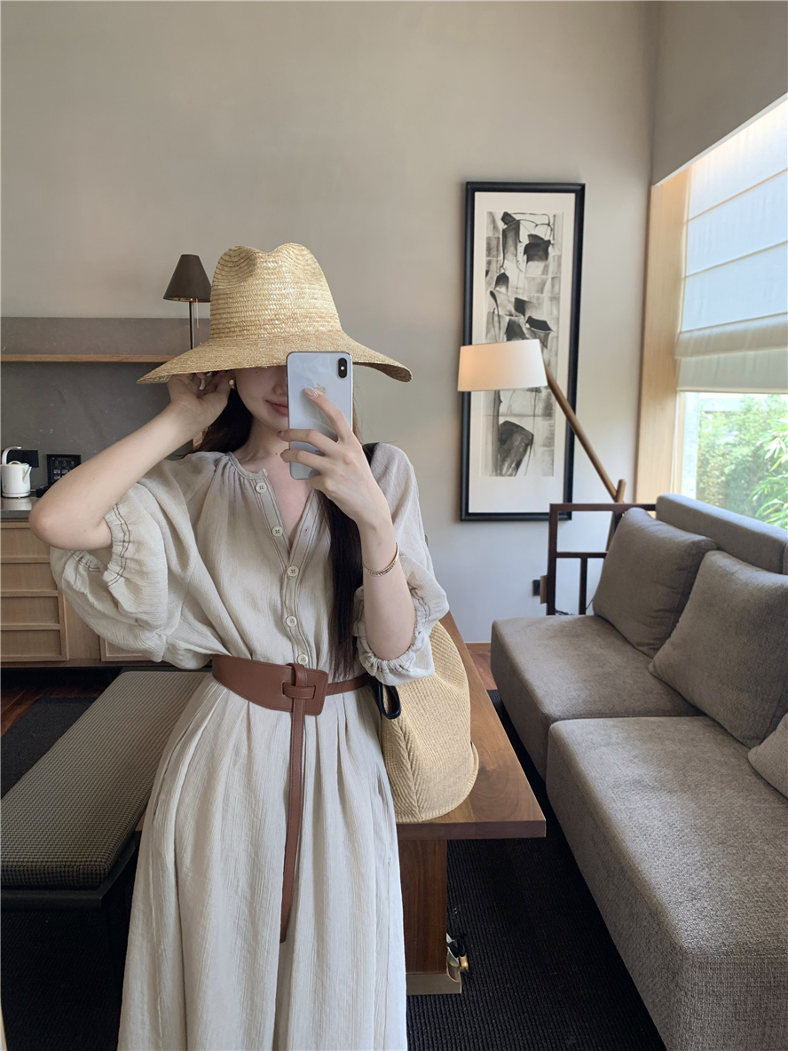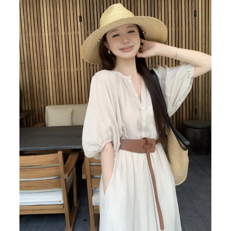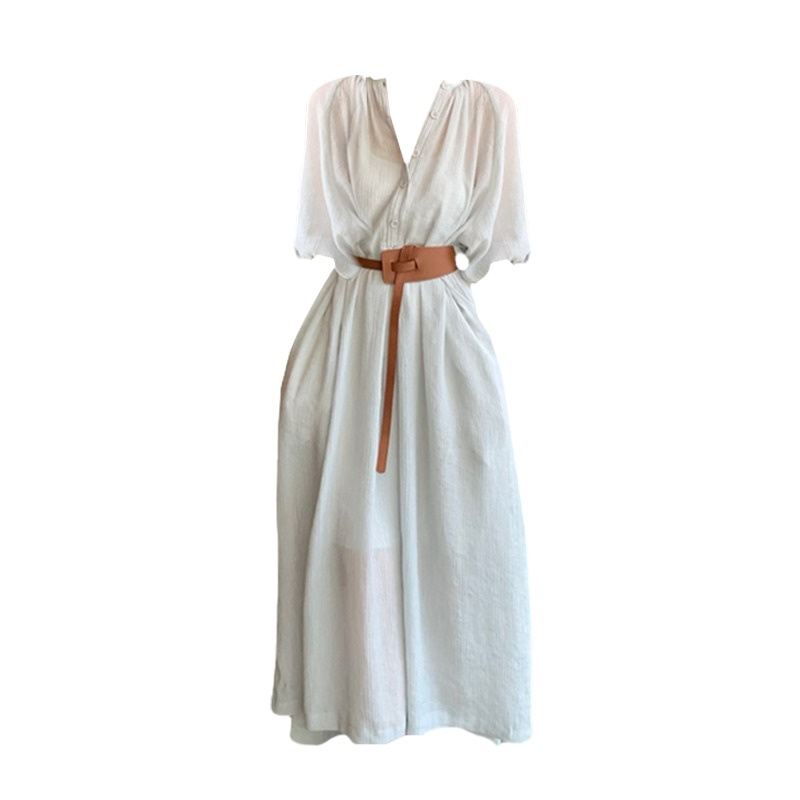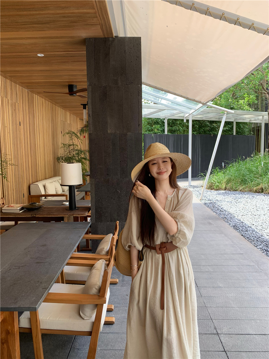 Large French style seaside dress for women in spring and summer, slightly overweight in mm, covering the belly to show off thinness, chiffon half sleeved long skirt
