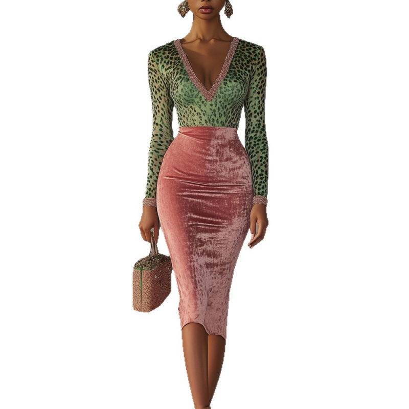 Amazon Europe America Cross border 2025 Autumn New Gold Velvet Splicing Elastic Slimming Bag Hip High Waist Dress for Women