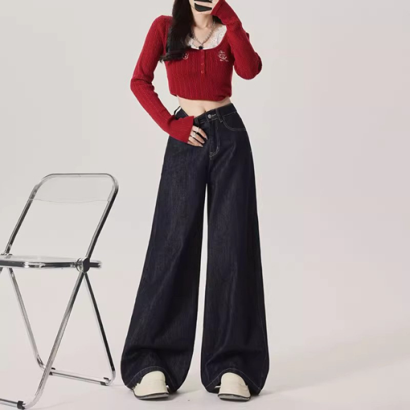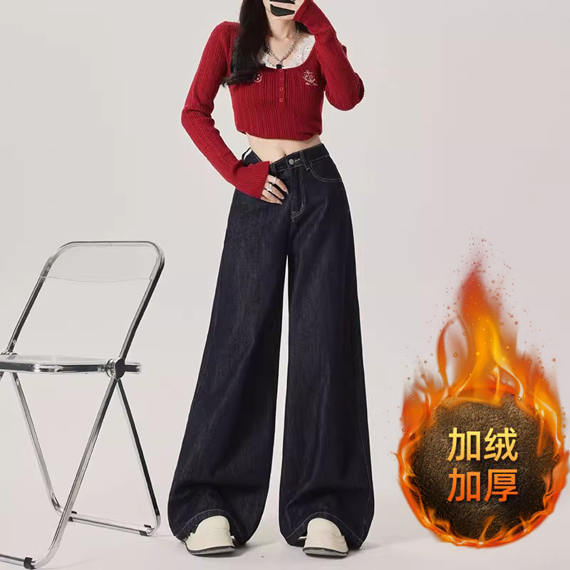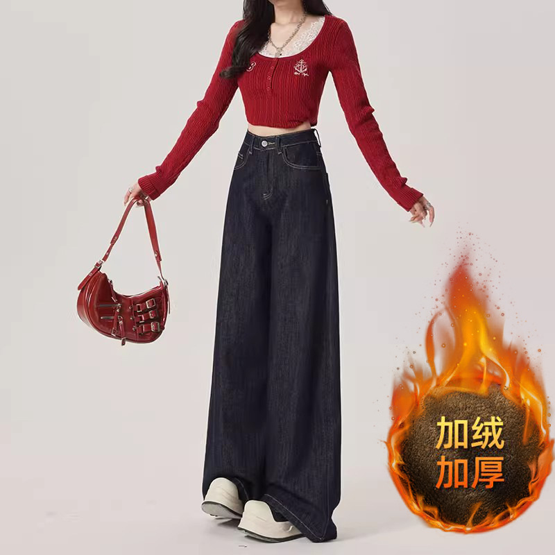 American retro plus plush thick wide leg jeans for women in autumn and winter, high waisted, loose fit, slimming and versatile pants