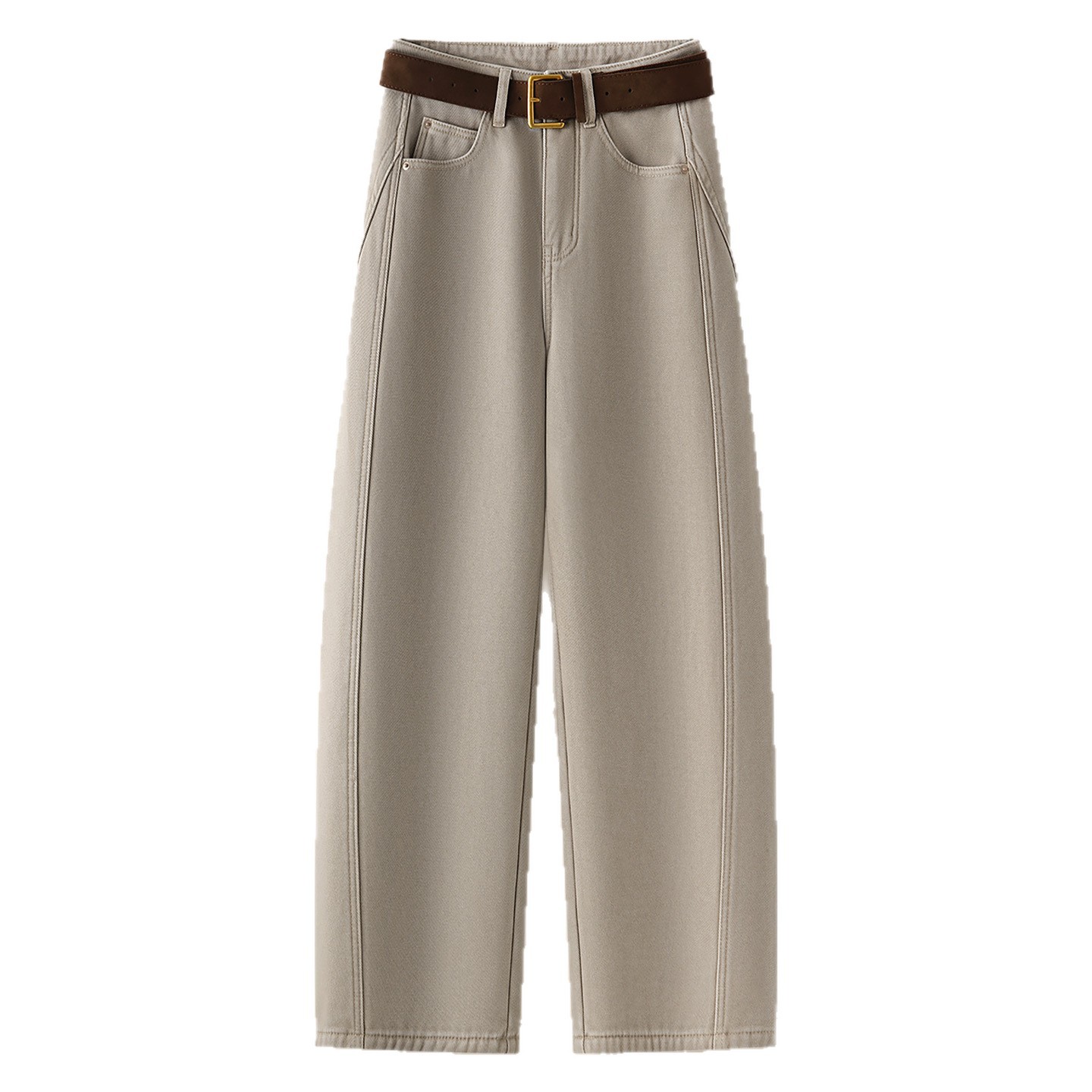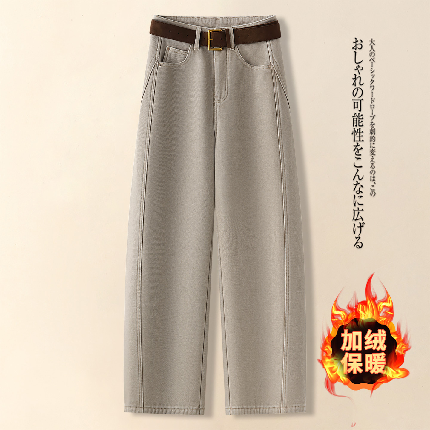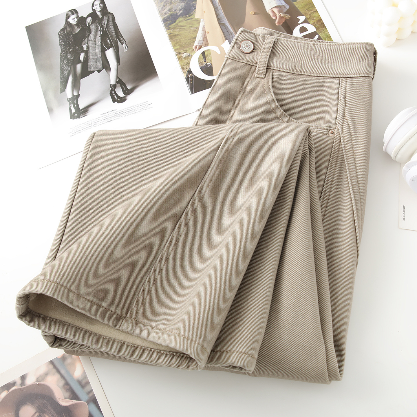 2025 autumn and winter plus velvet straight leg pants for women, high waisted curved knife wide leg jeans, khaki color, thickened and slimming