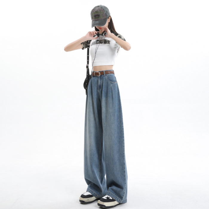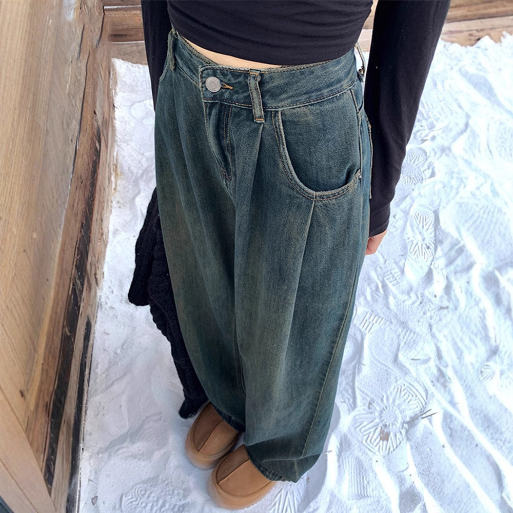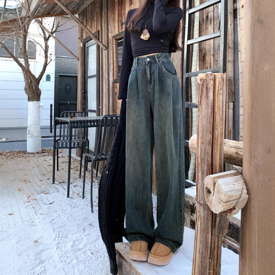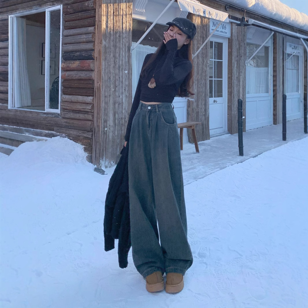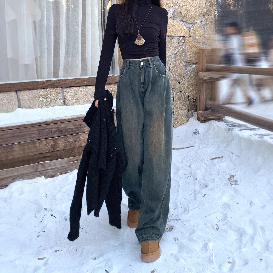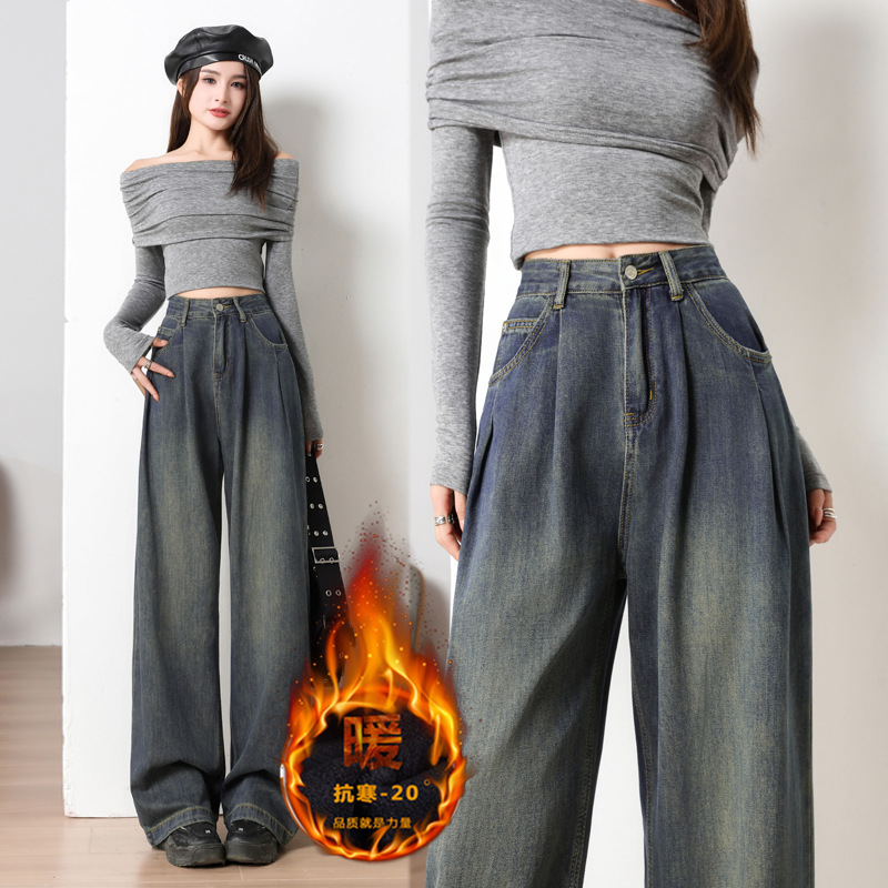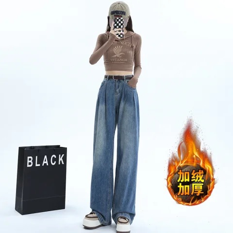 American style cement grey high waisted and fleece jeans for women, 2024 autumn and winter new style, loose and slim, hanging and wide leg pants