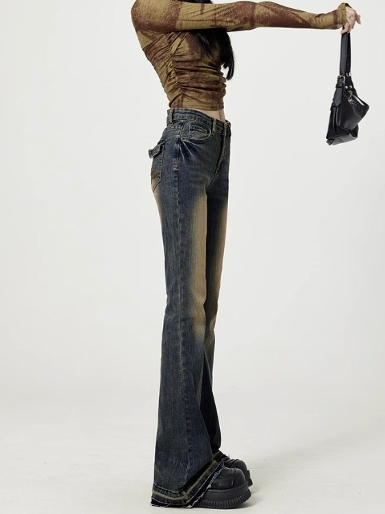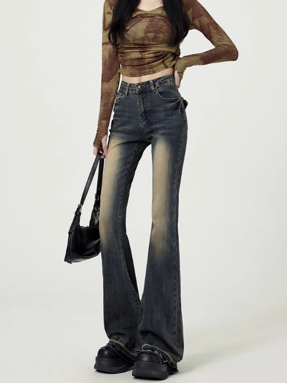 Американские ретро - тонкие пуховые джинсы женские зимние 2024 просто высокая талия тонкие рога подковы