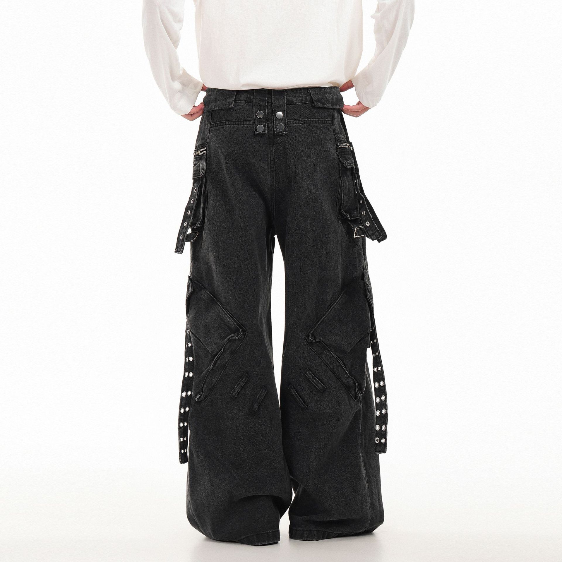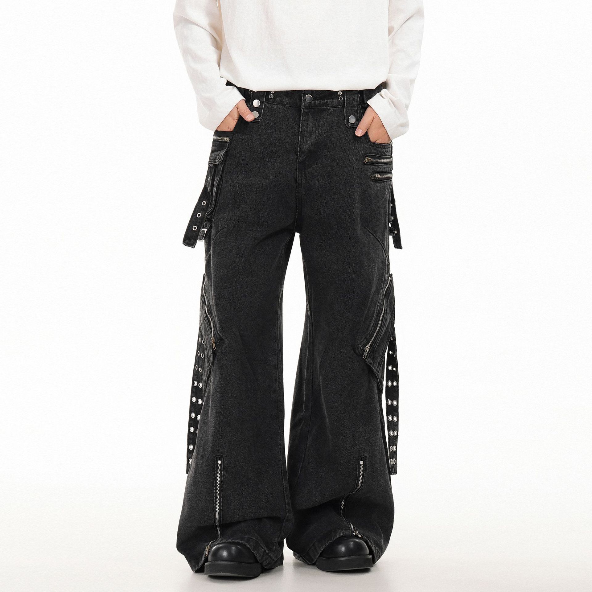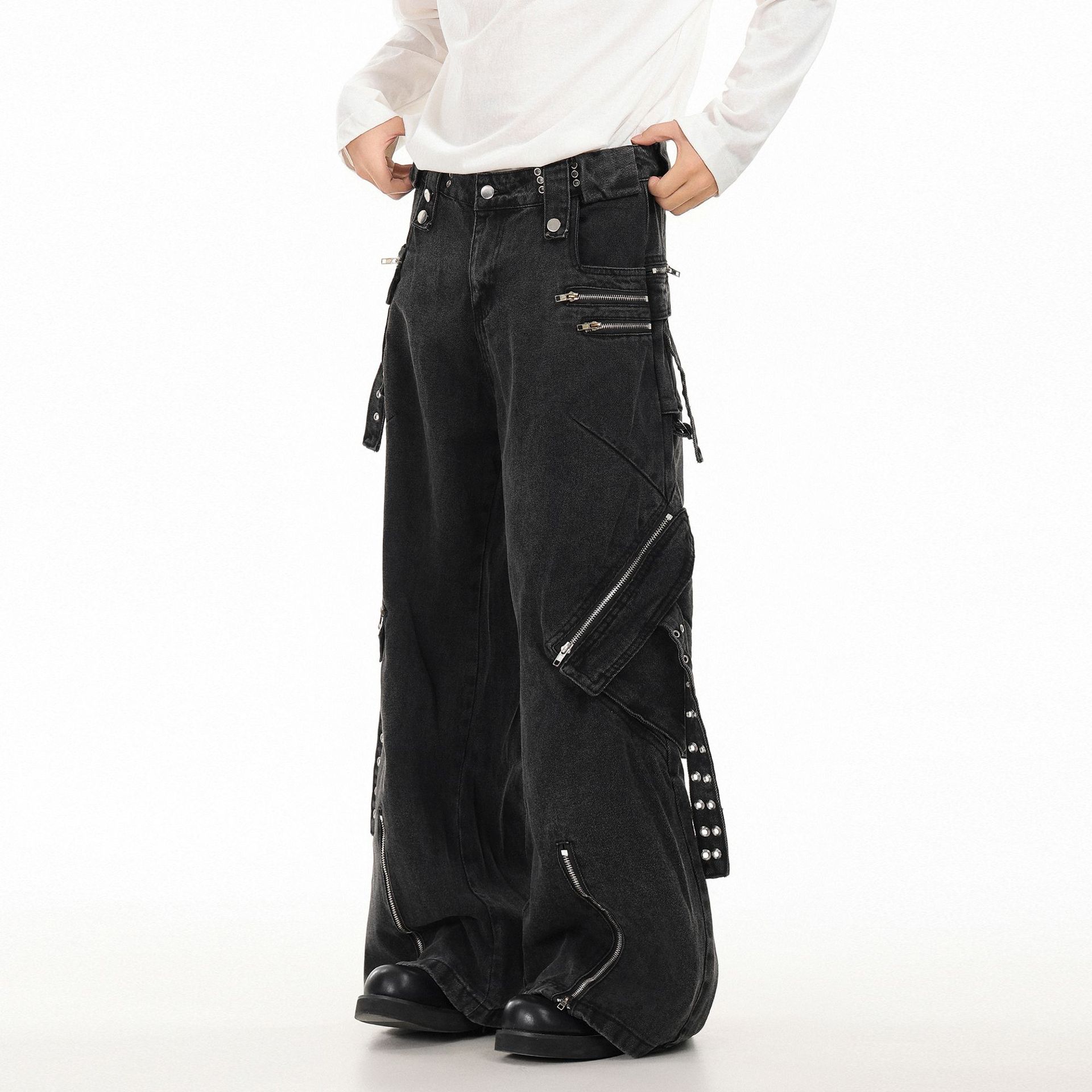 OREETA Американская тяжелая промышленность панк джинсы с несколькими карманами мужские и женские шнурки дизайн с широкими ногами