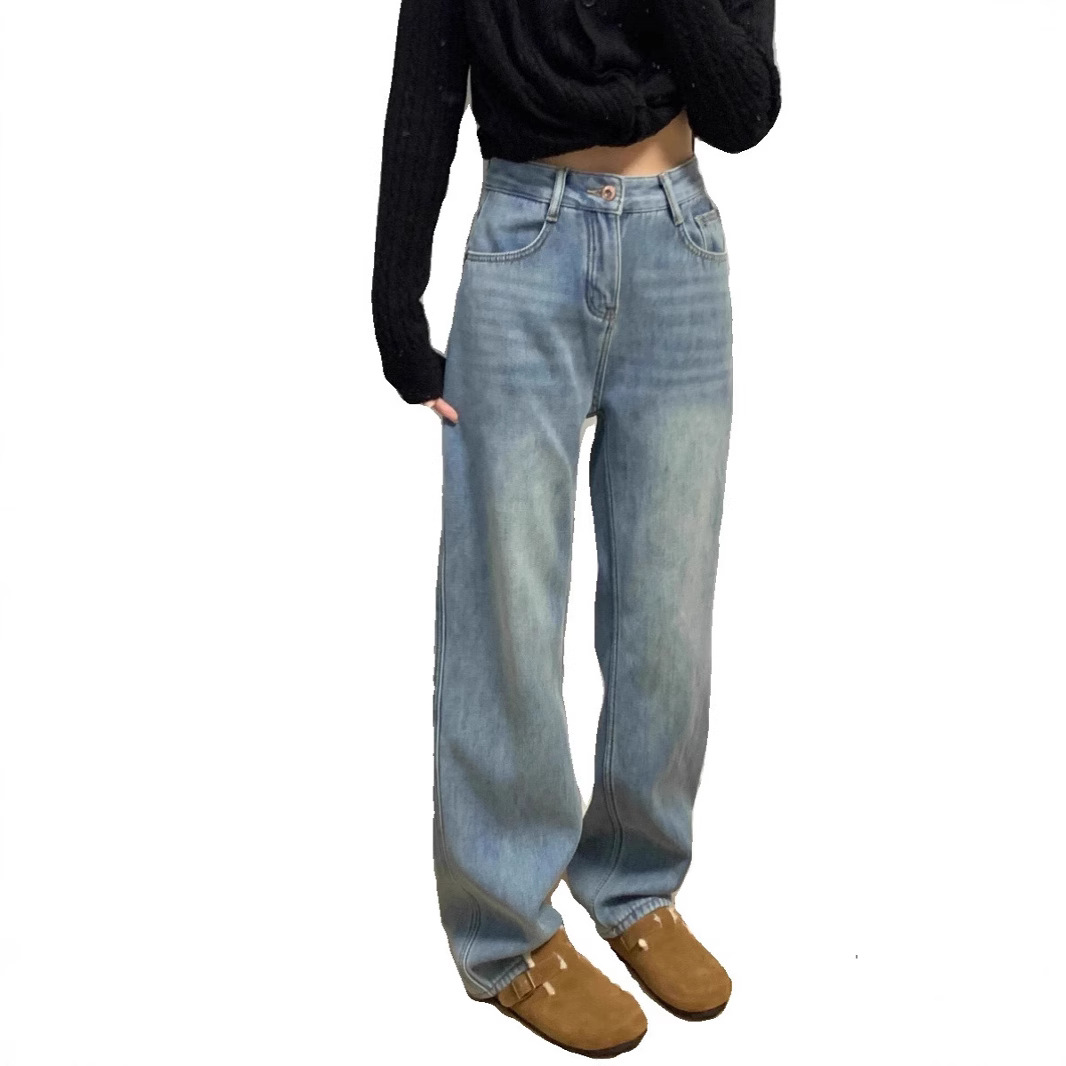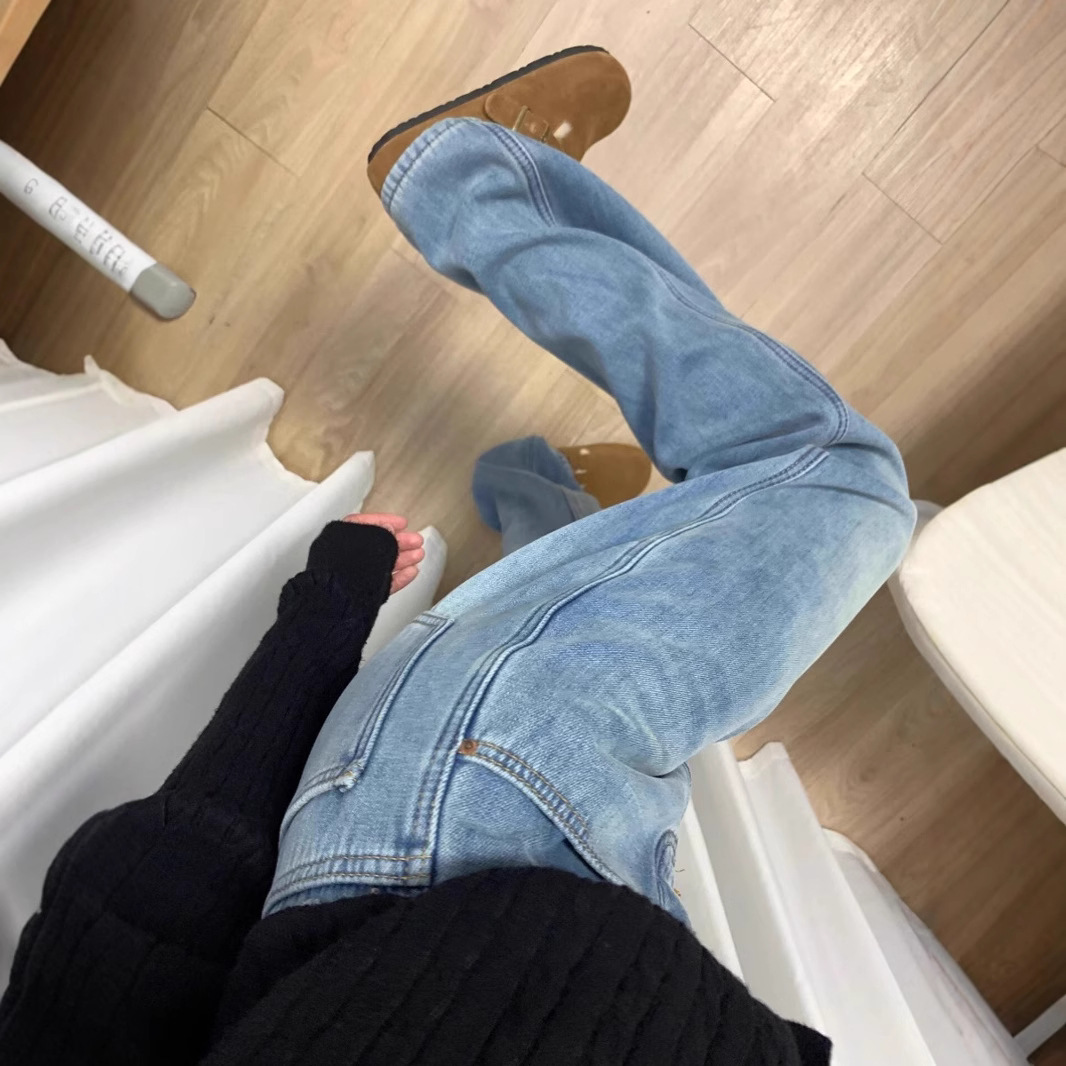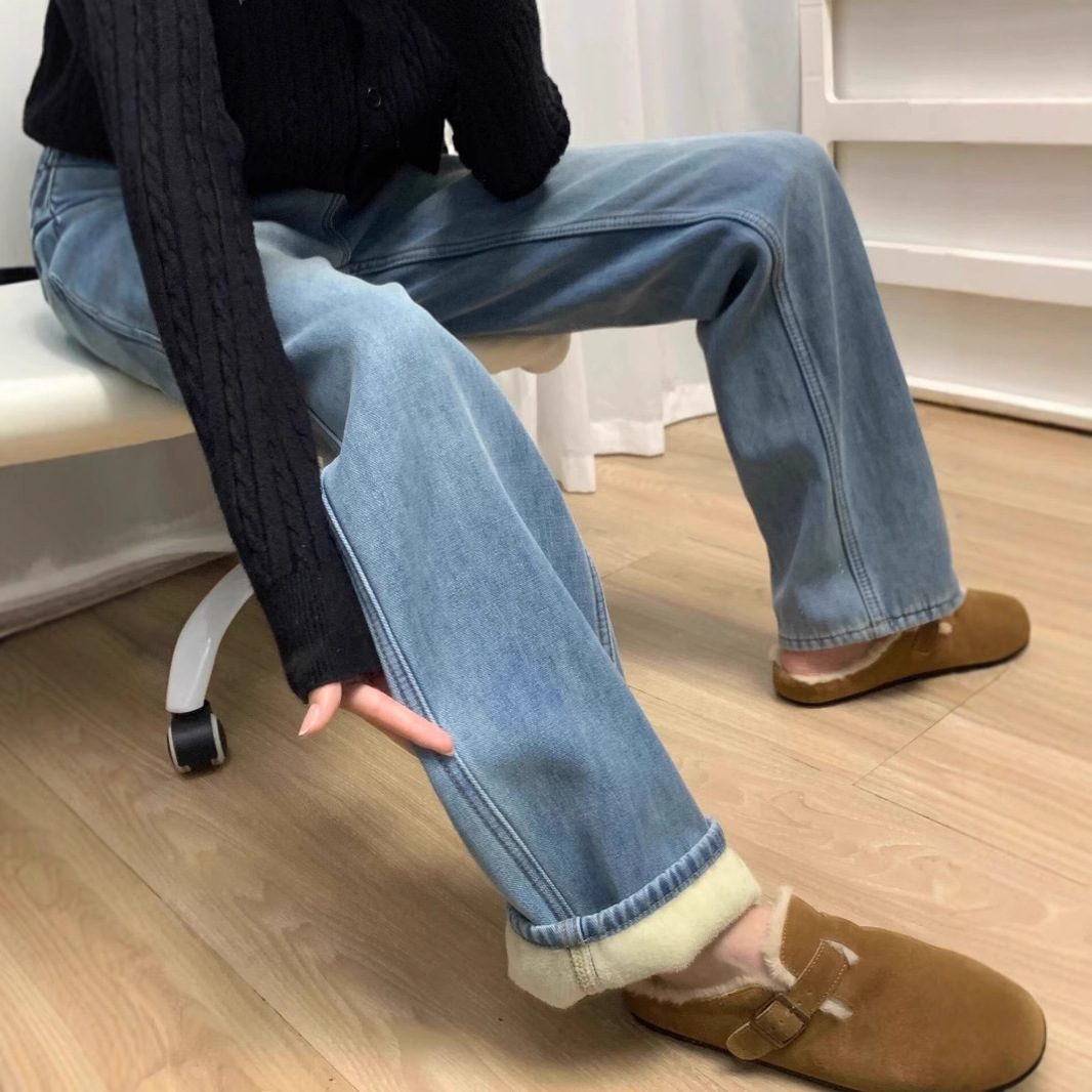 175 Tall Extended Edition 170 Winter Plush Thick Jeans Women's High Waist Look Thin Light Blue Straight Pants