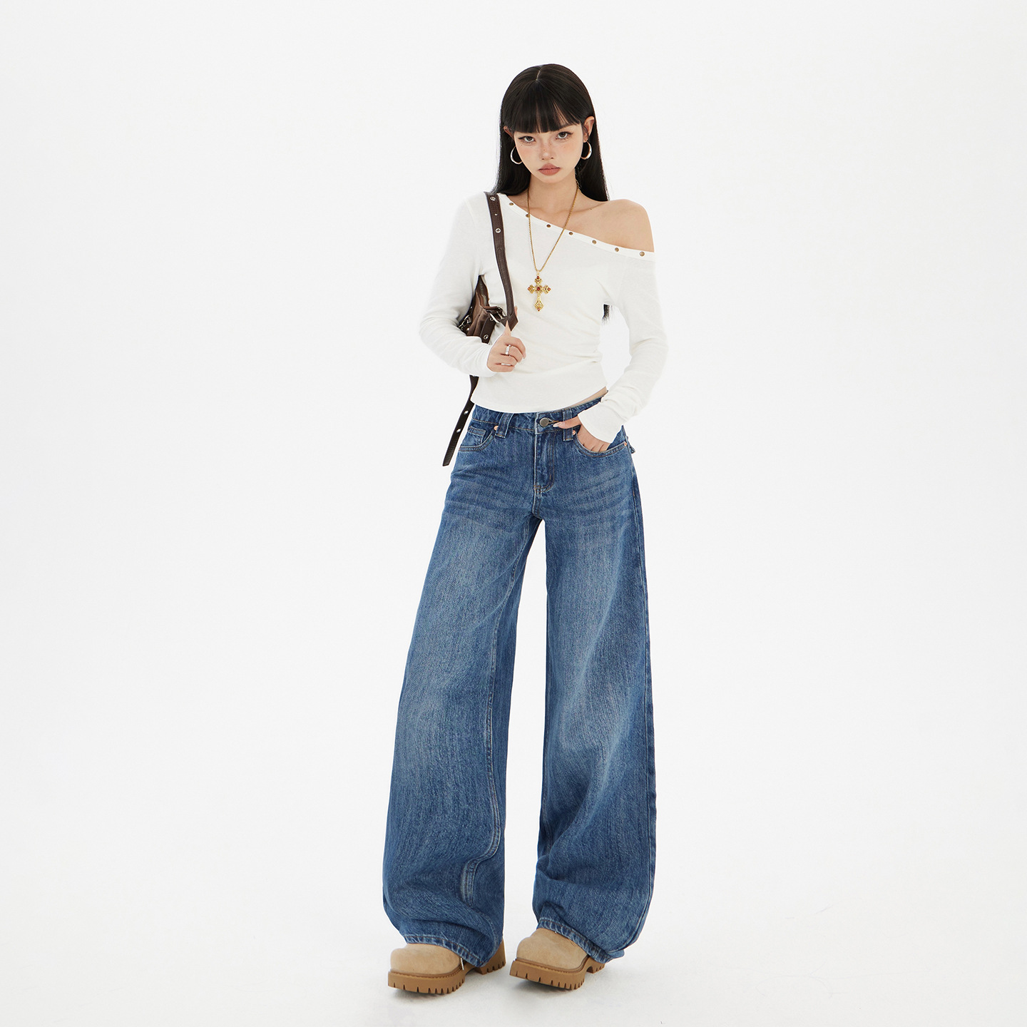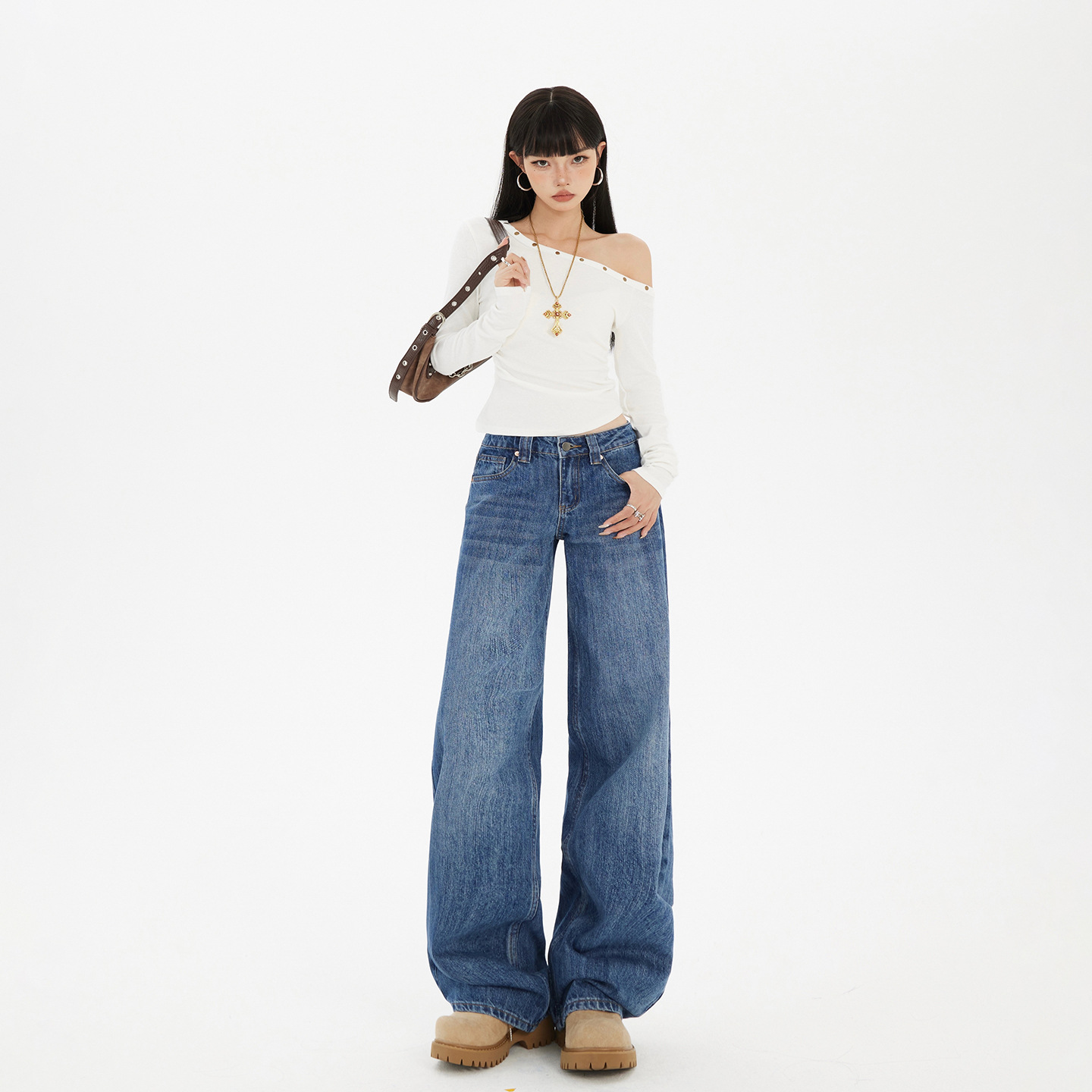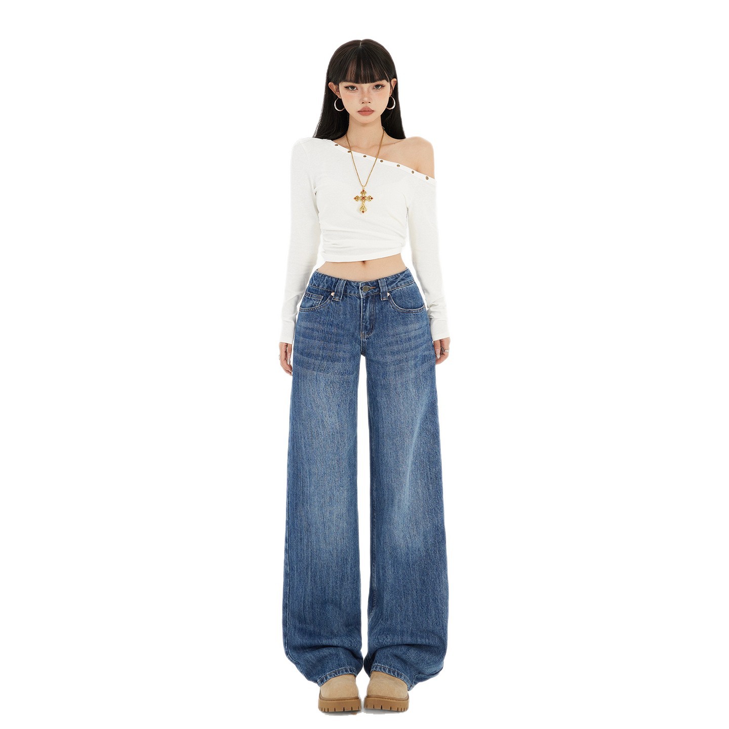 American retro low rise loose wide leg jeans for women, versatile for autumn and winter 2025, ins slimming straight leg mop pants