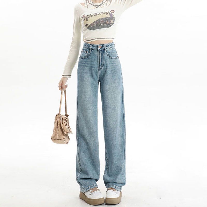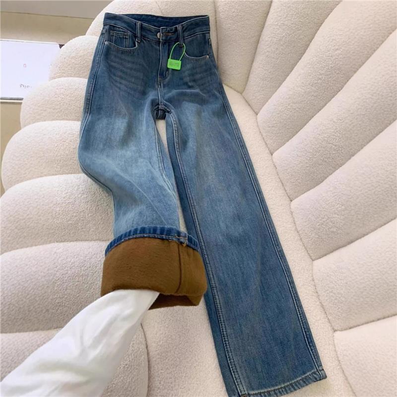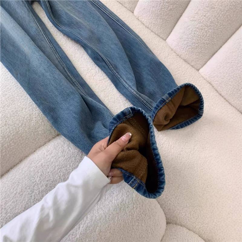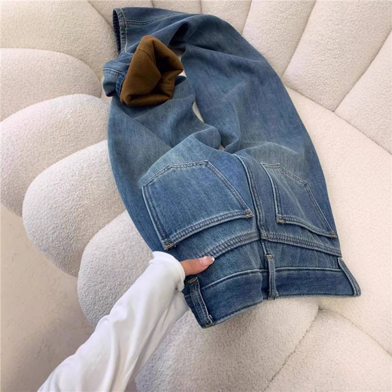 Retro blue narrow version with plush and thick straight leg jeans for women's 2025 autumn and winter new high waist slimming wide leg pants