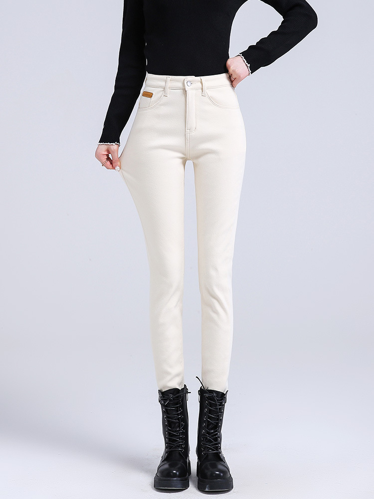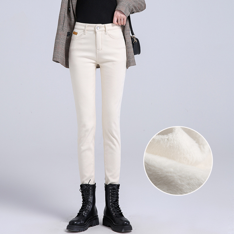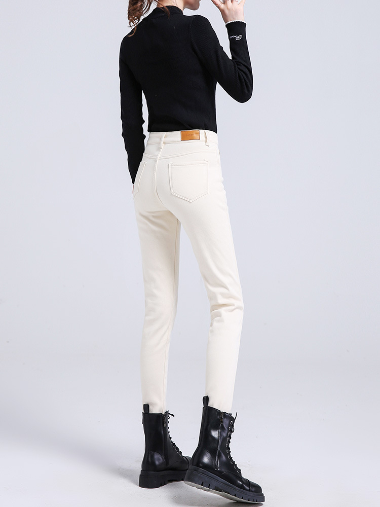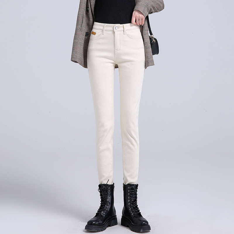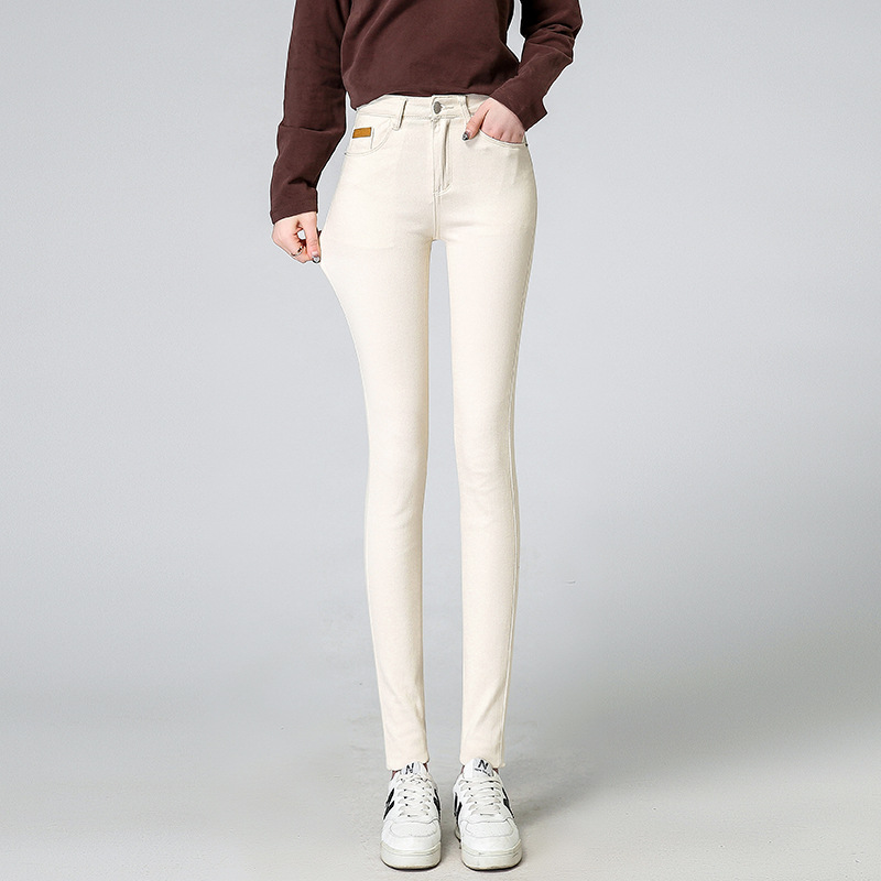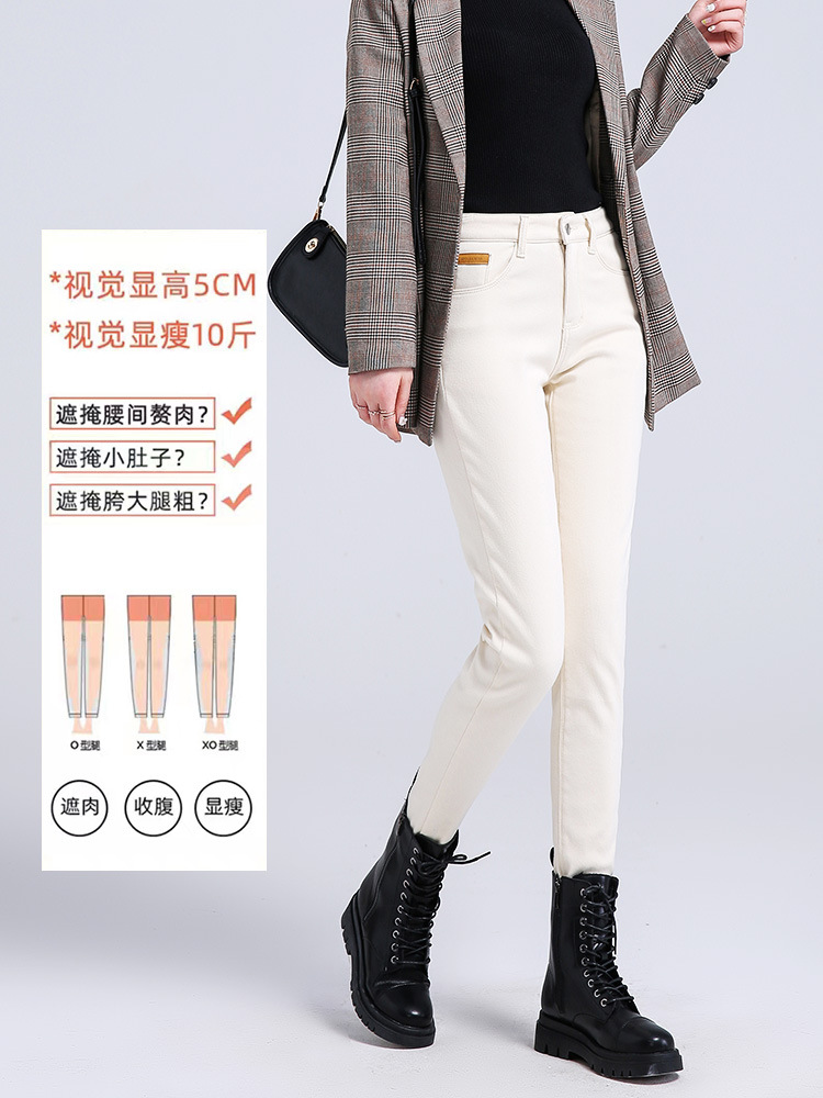 米白色加绒牛仔裤女小脚秋冬高腰显瘦弹力加长女裤休闲九分铅笔裤