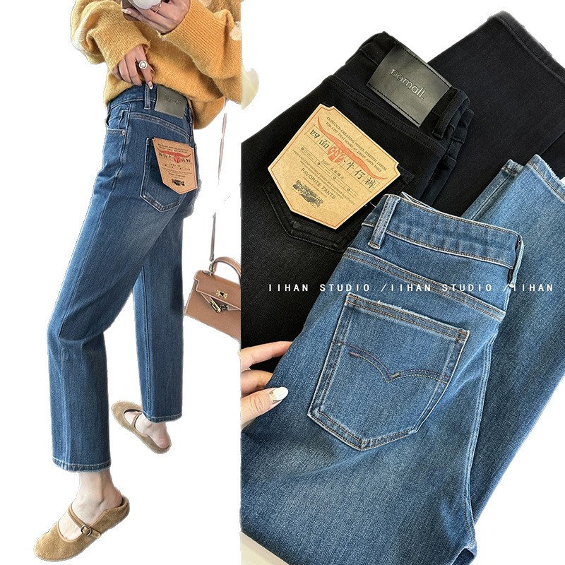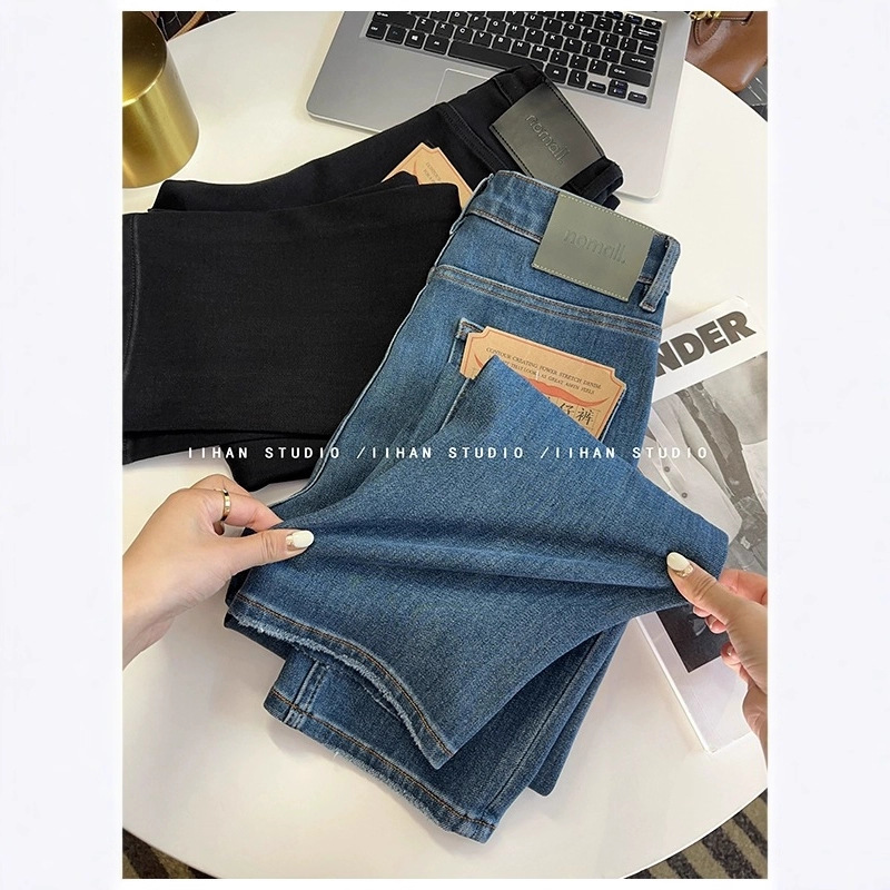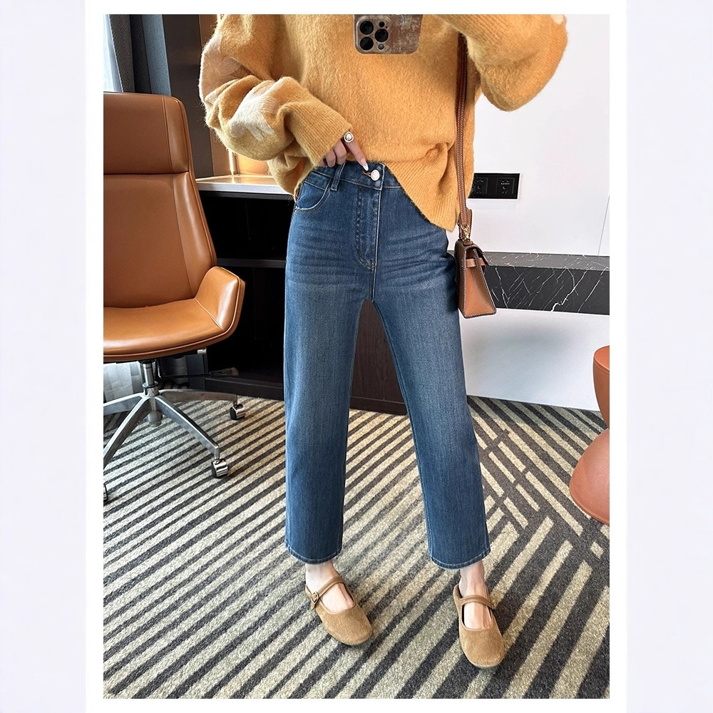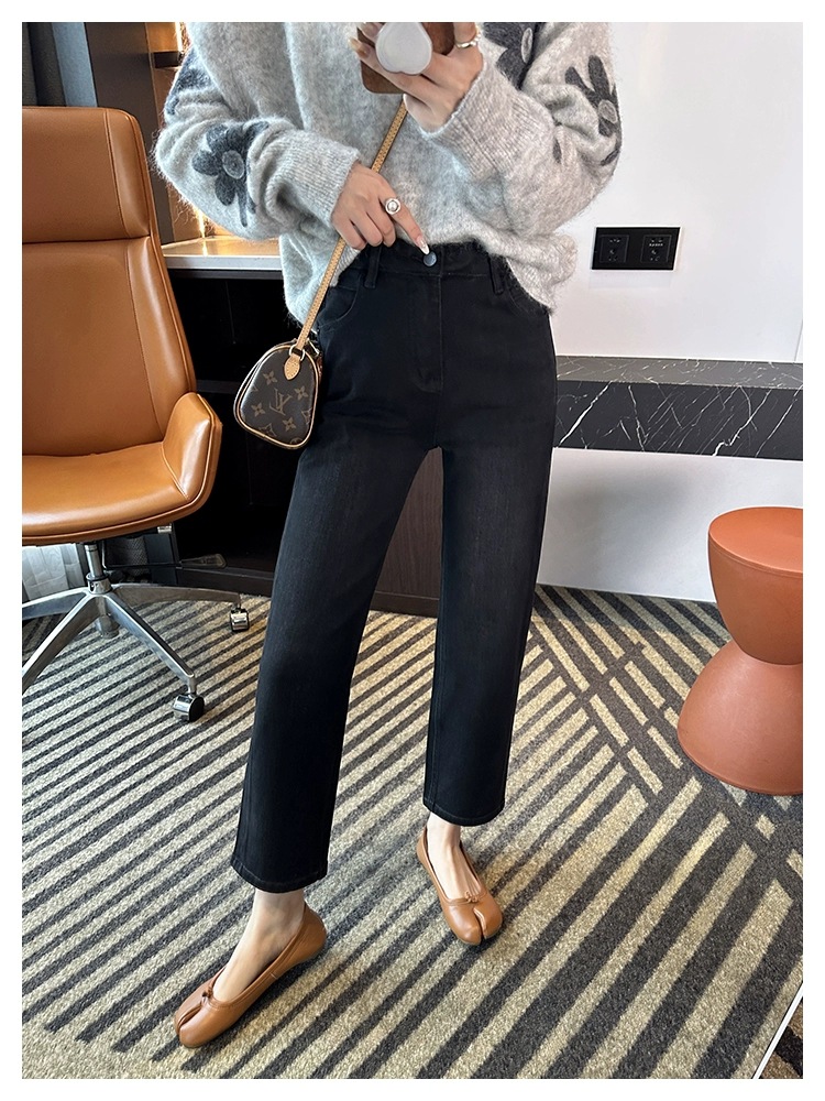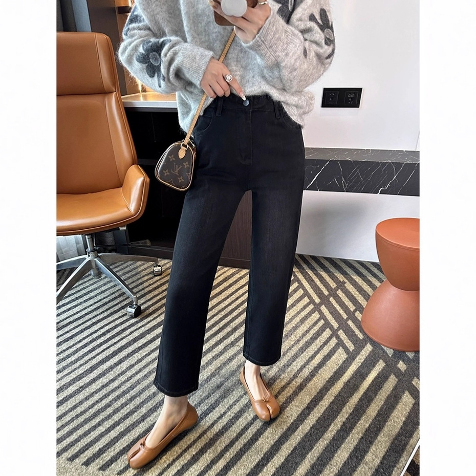 Winter velvet straight leg short nine point baggy pants with four side bounce, high waist, narrow cut straight leg denim pants for women