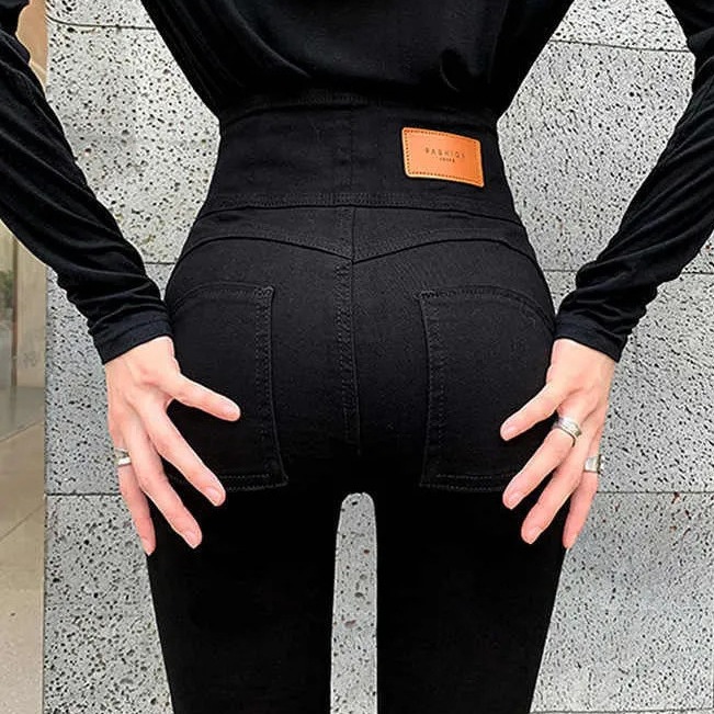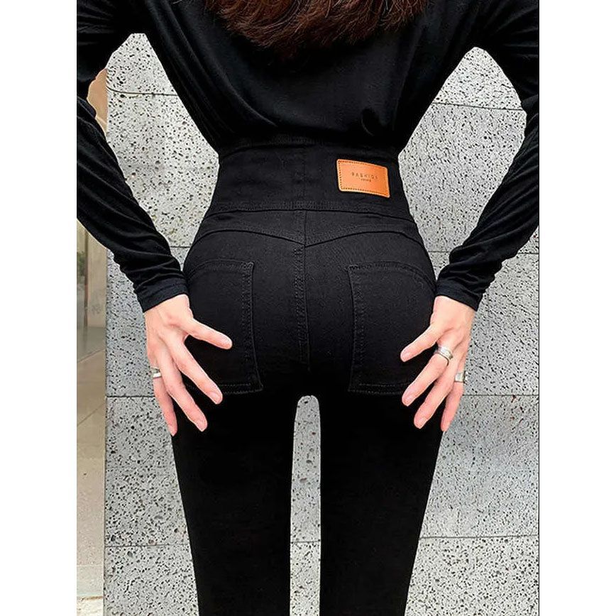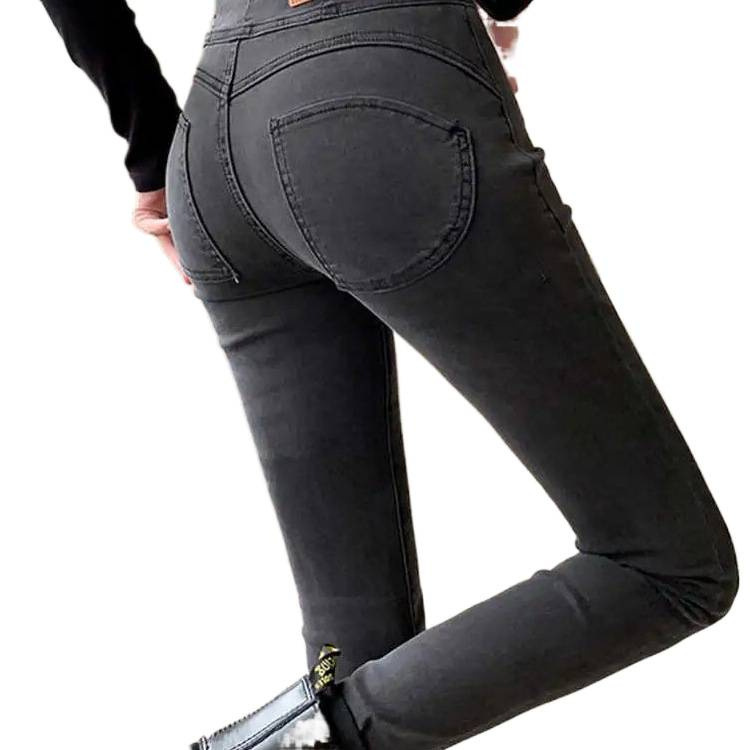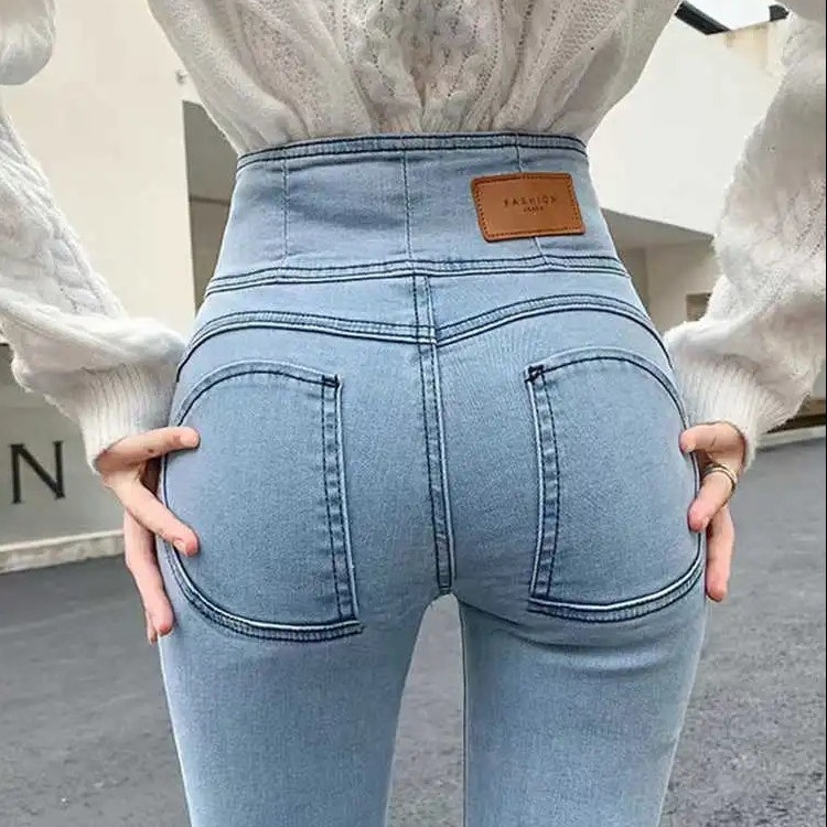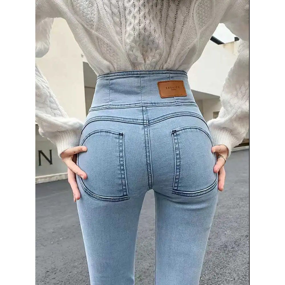 Large peach hip cinched jeans for women in autumn and winter, high waisted elastic slimming and plush tight fitting pencil pants with small feet