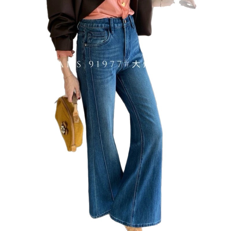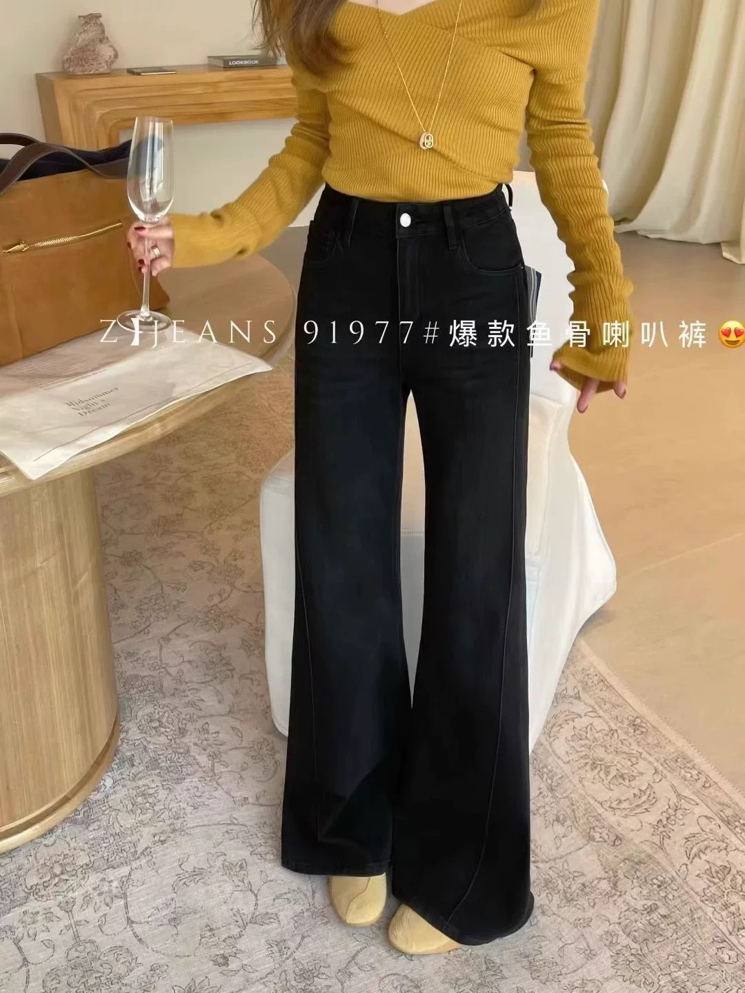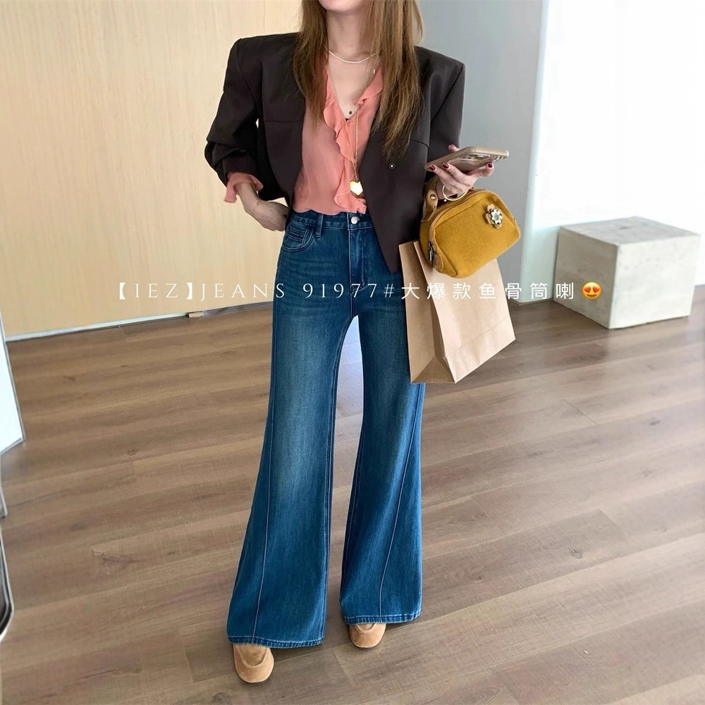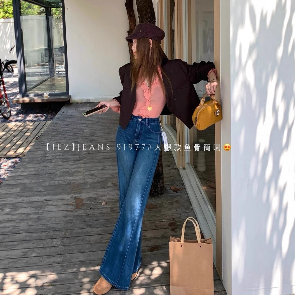 IEZ black straight flared pants for women in autumn 2025, with four sided elastic fishbone edges and loose denim floor pants that do not stick to the legs
