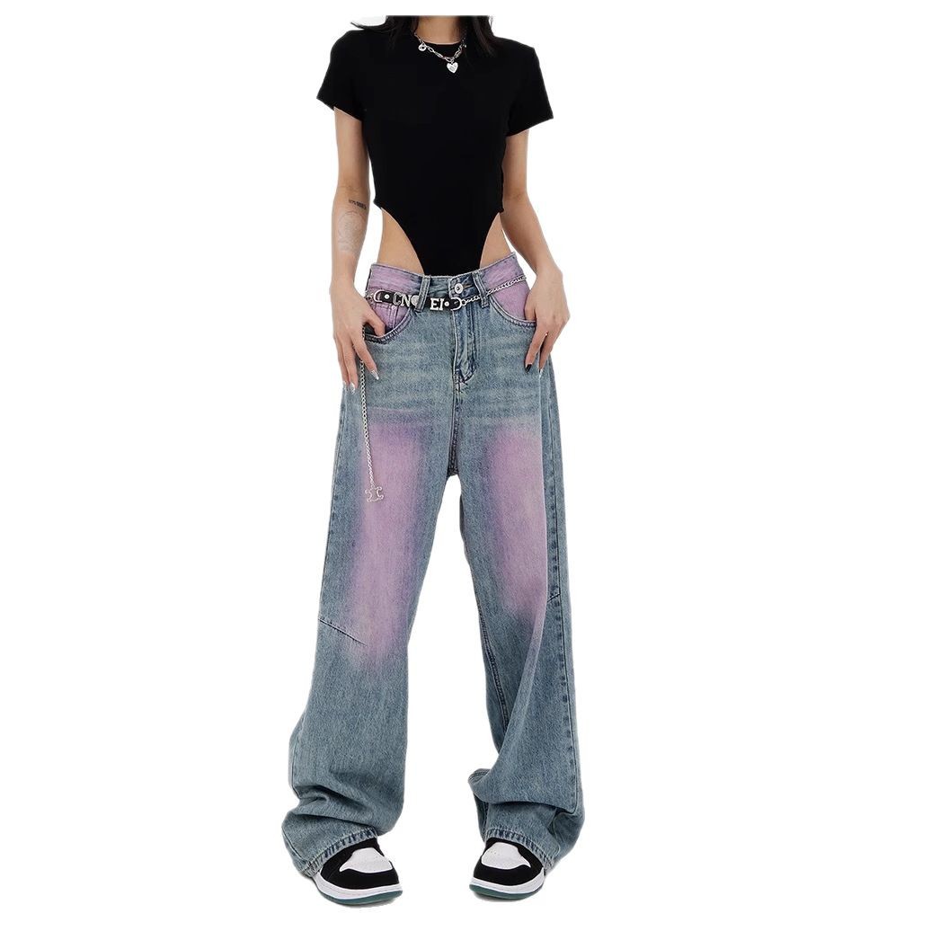 Personalized blue purple contrasting casual jeans for women's summer, high waist, loose fit, slimming straight leg, versatile wide leg floor pants