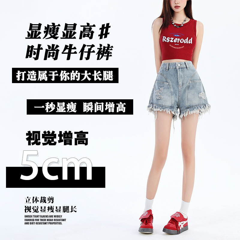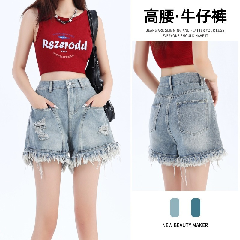 Oversized retro high waisted fashionable tassel fringed denim shorts for women's summer new style spicy girl slimming A-line wide leg pants