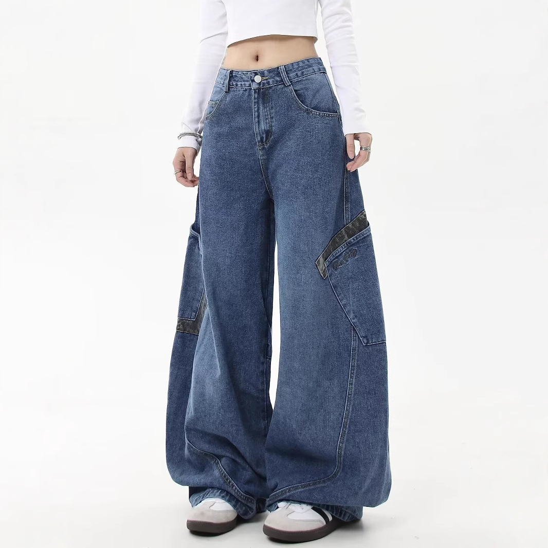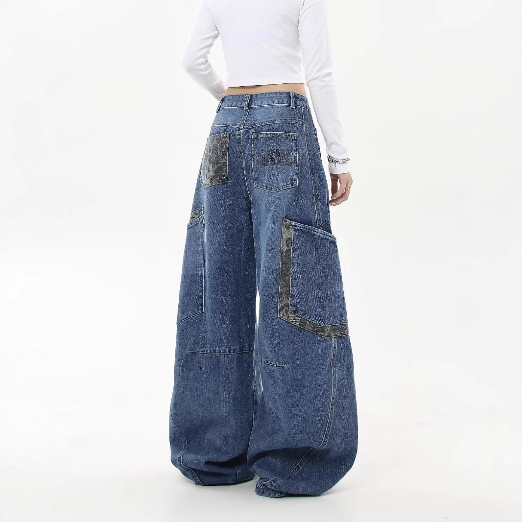 Американские ретро - люди делают старые джинсы с широкими ногами, женские осенне - зимние новые свободные, тонкие леопардовые сшитые брюки с мачете