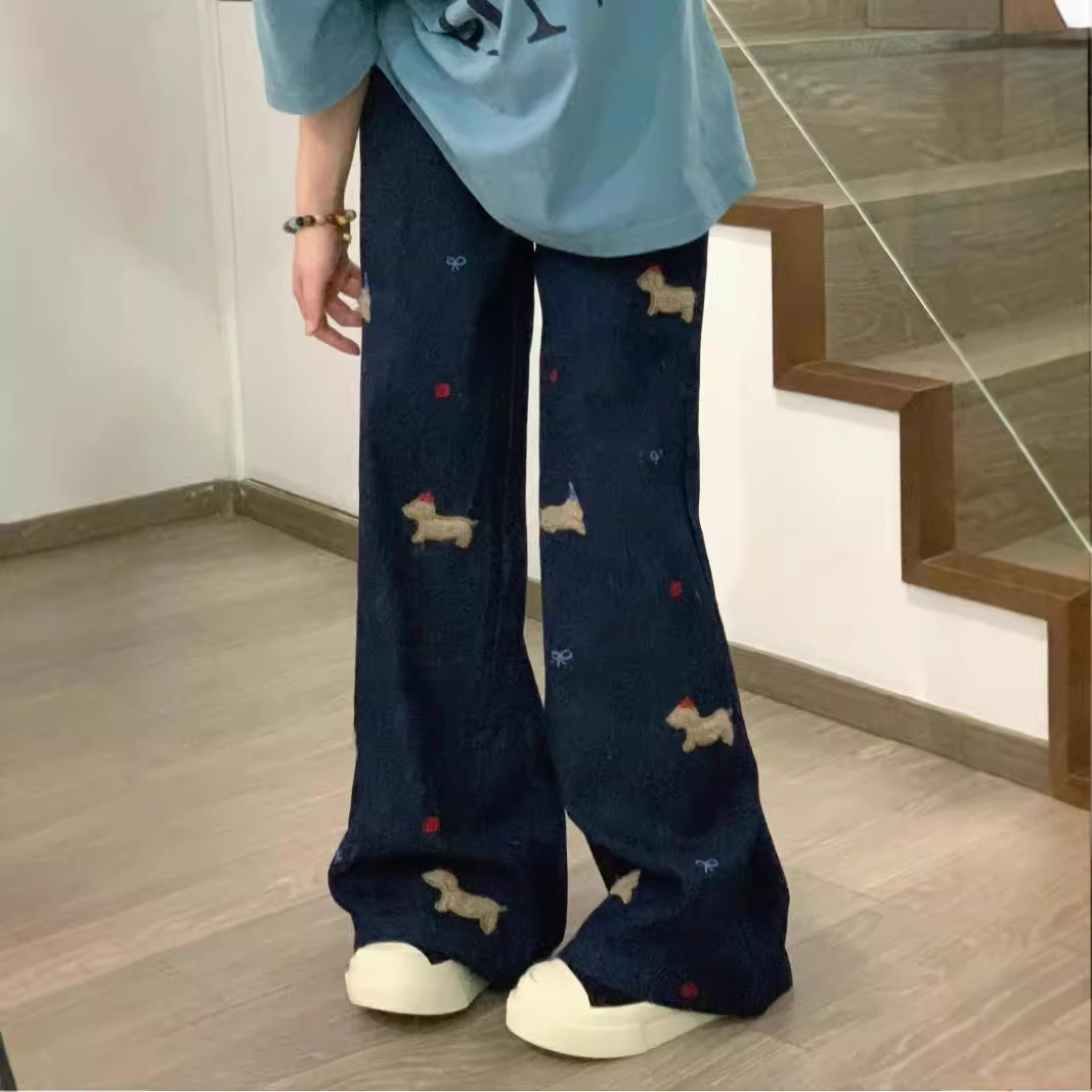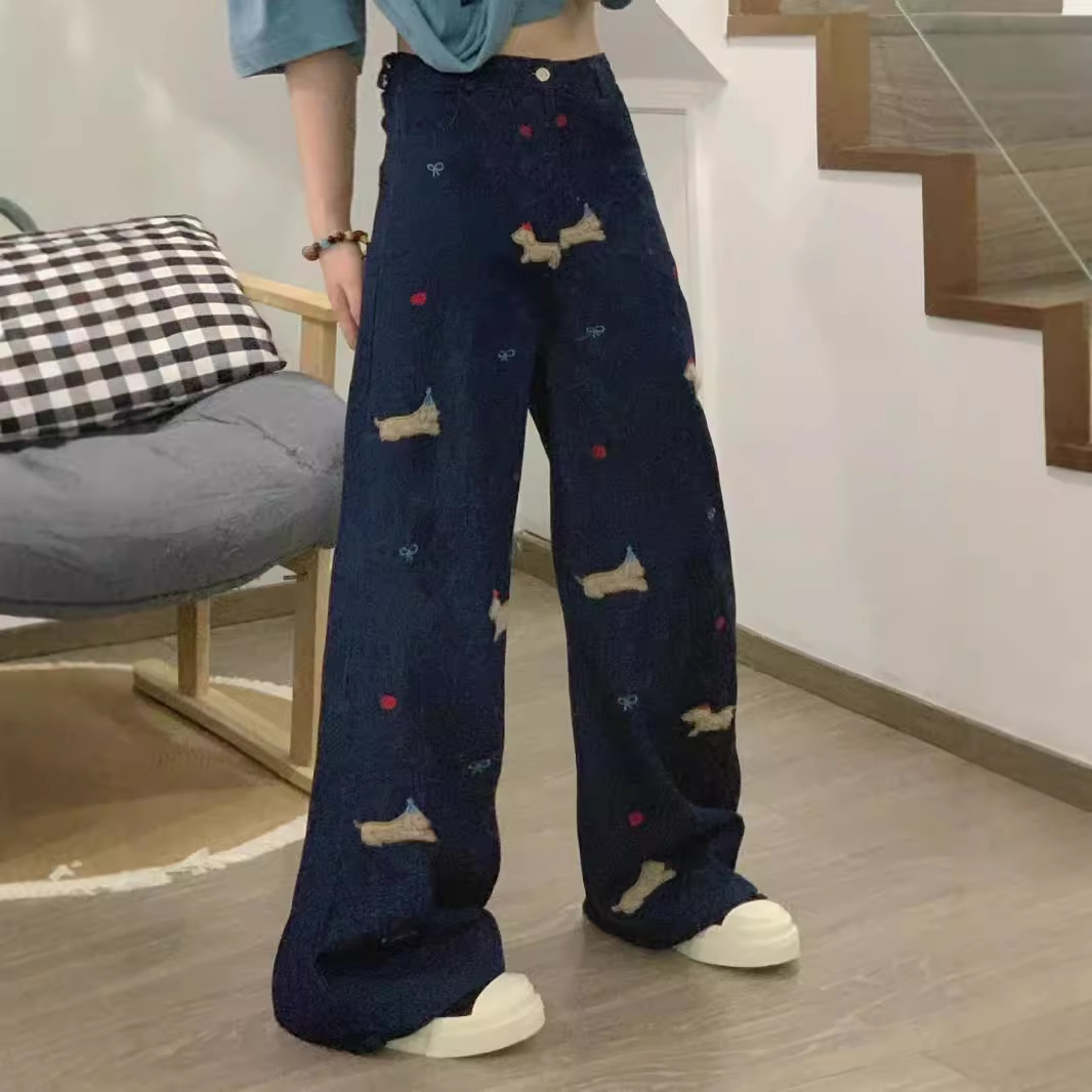American retro creative cartoon high waisted jeans for women in spring and autumn, loose and wide leg design, casual and versatile pants, trendy