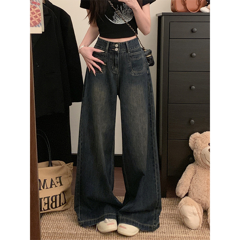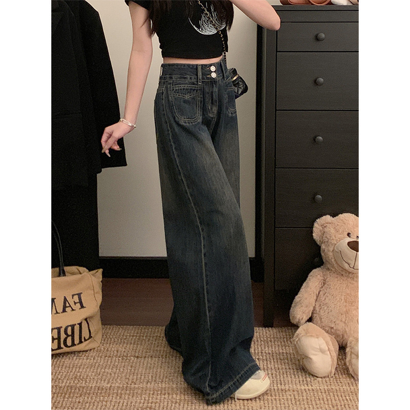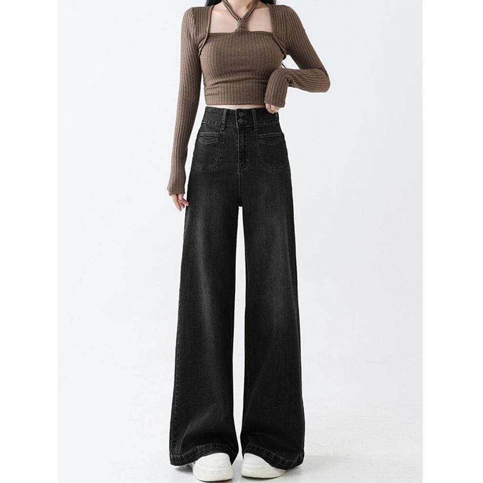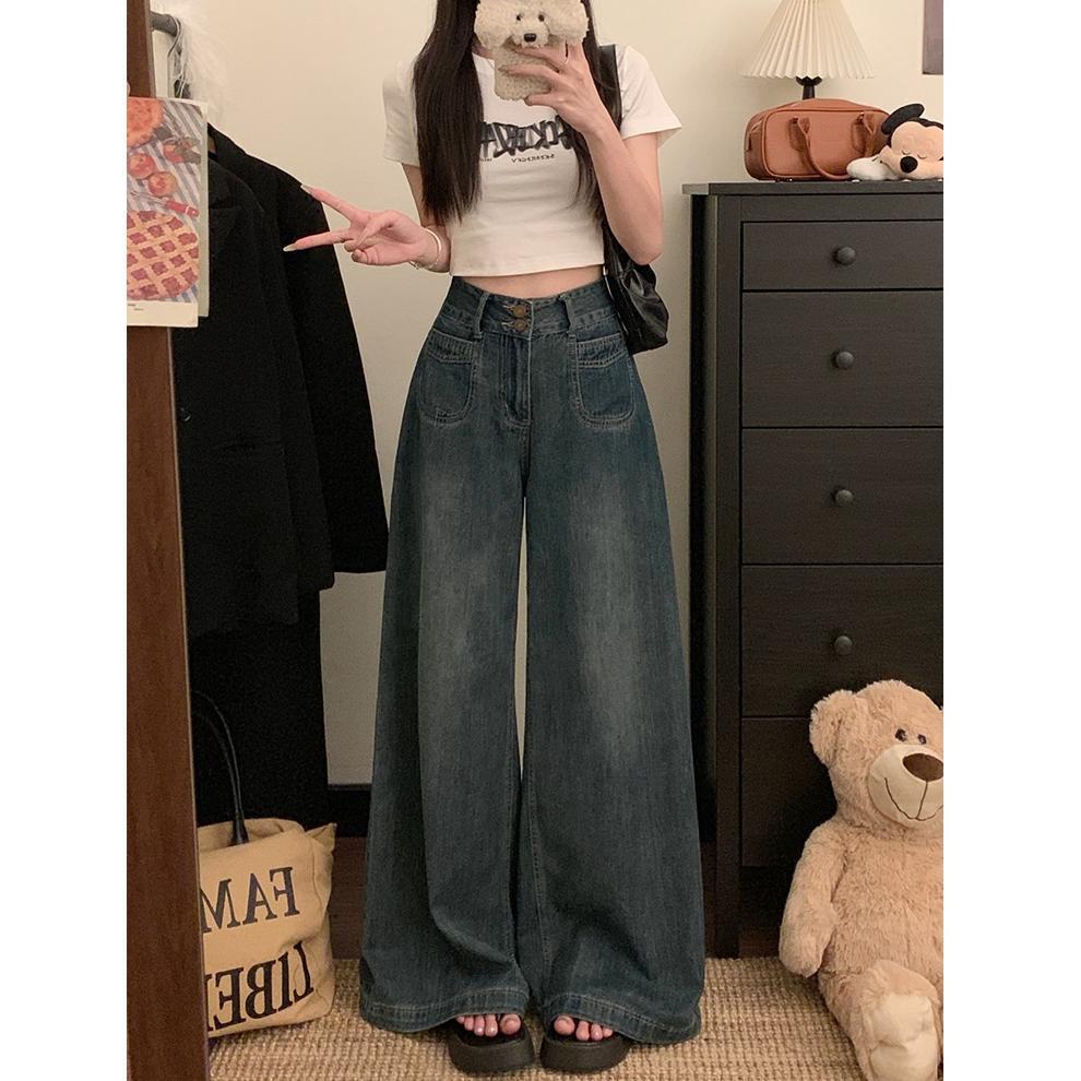 Цементные серые джинсы с широкими ногами женские летом 2025 Тонкие двойные пряжки с высокой талией, свободный прямой цилиндр, тонкие брюки