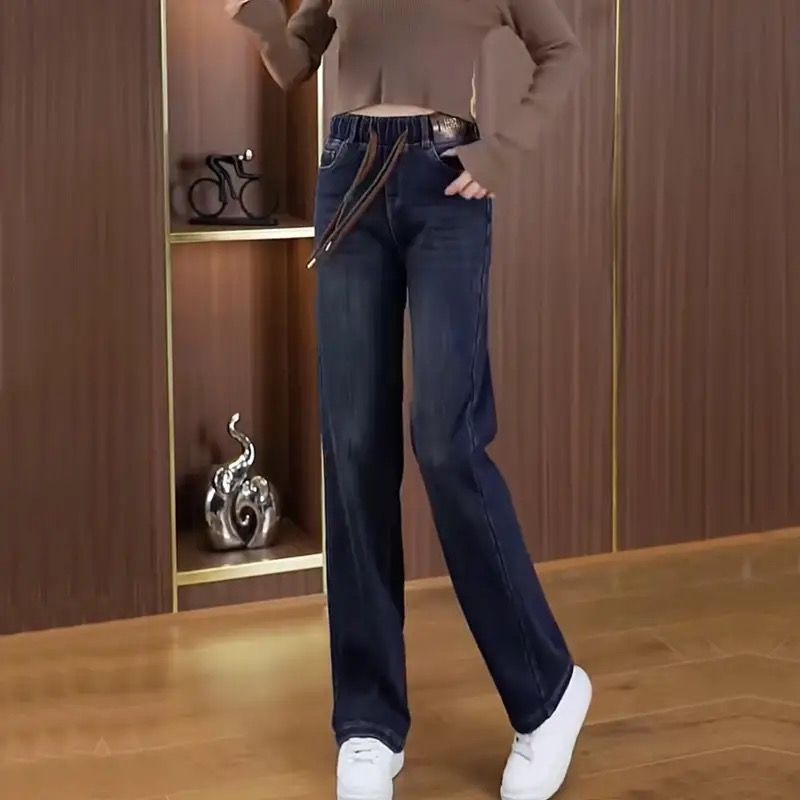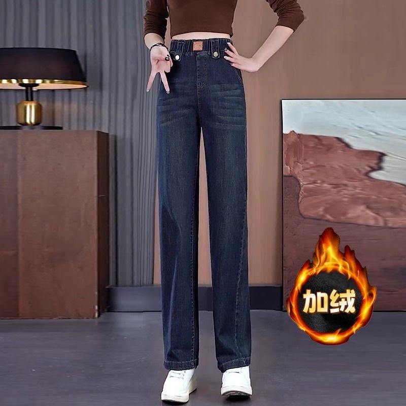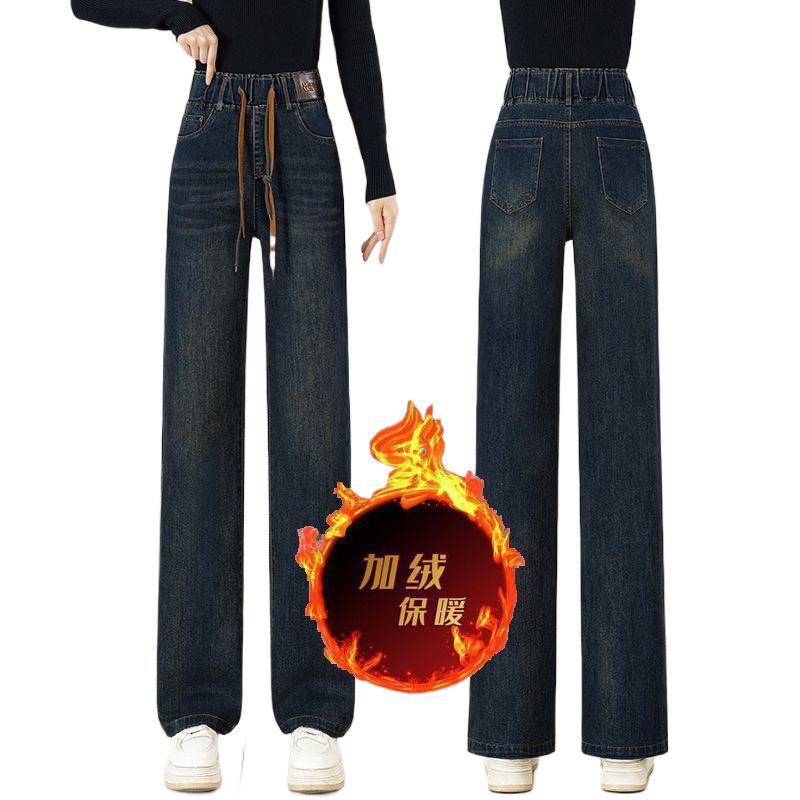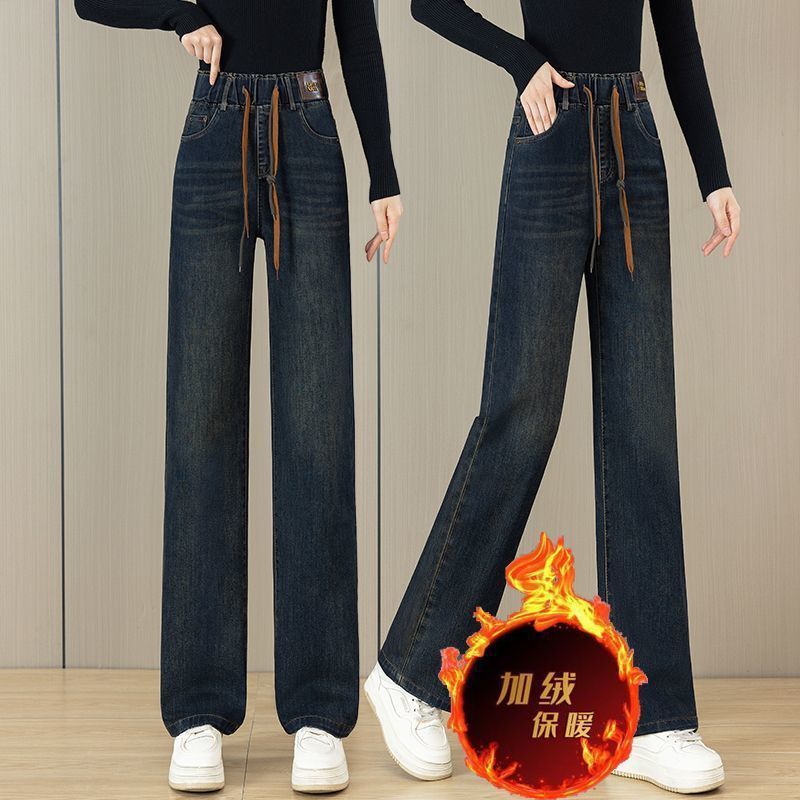 Cowboy wide leg pants for women in the autumn and winter of 2025, new elastic waistband with plush and thickened narrow version, slimming straight leg pants