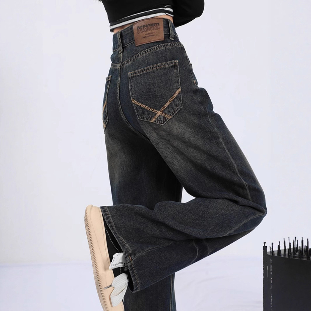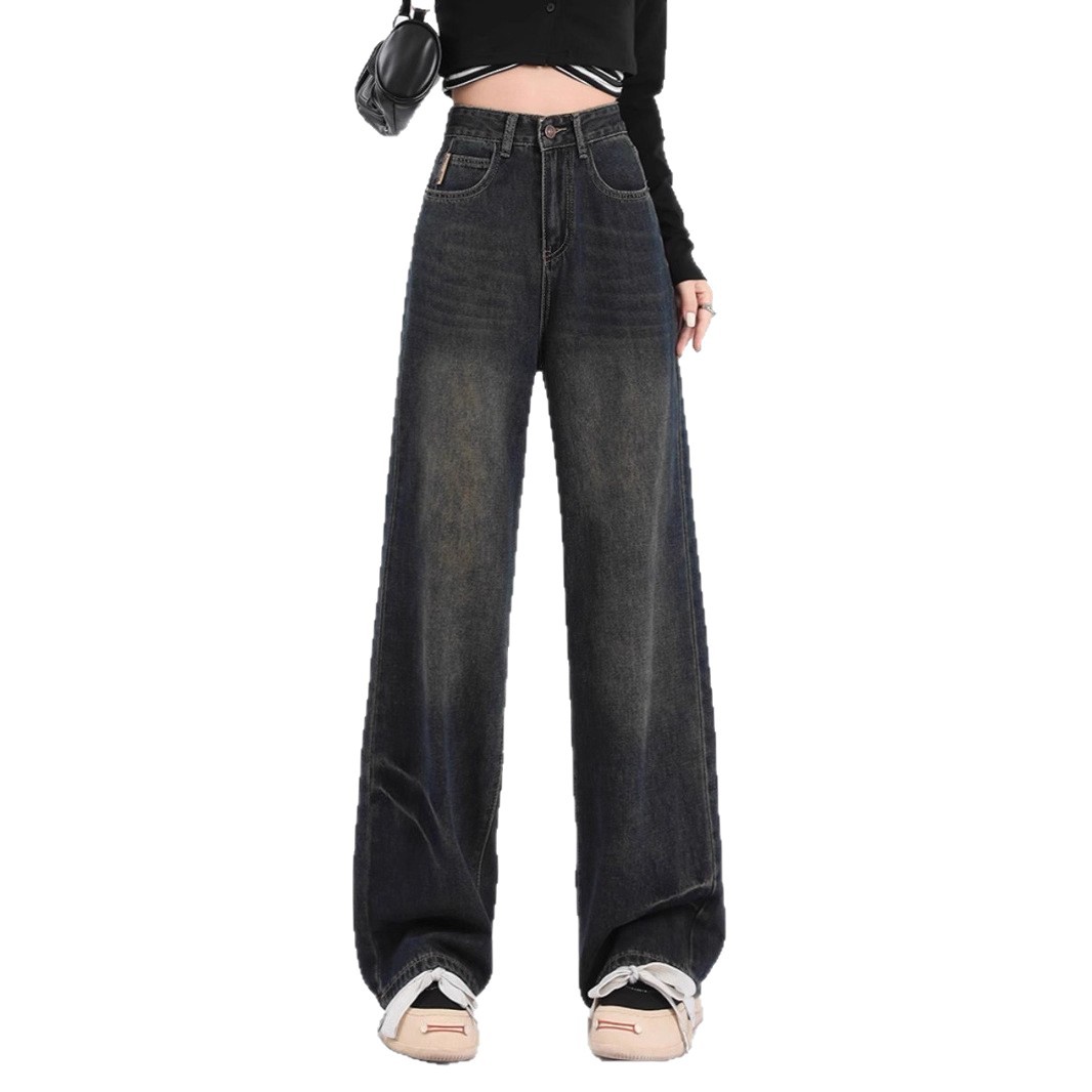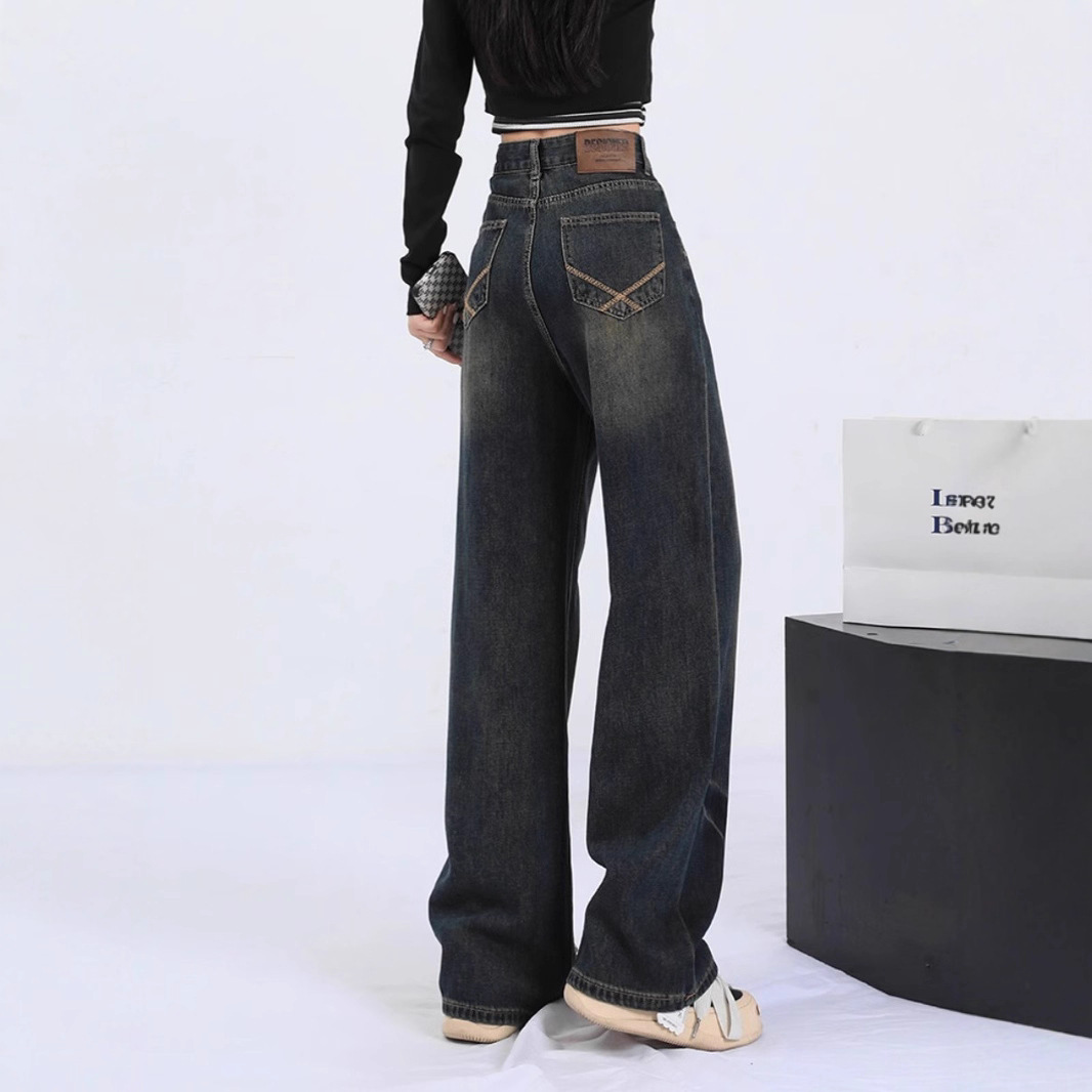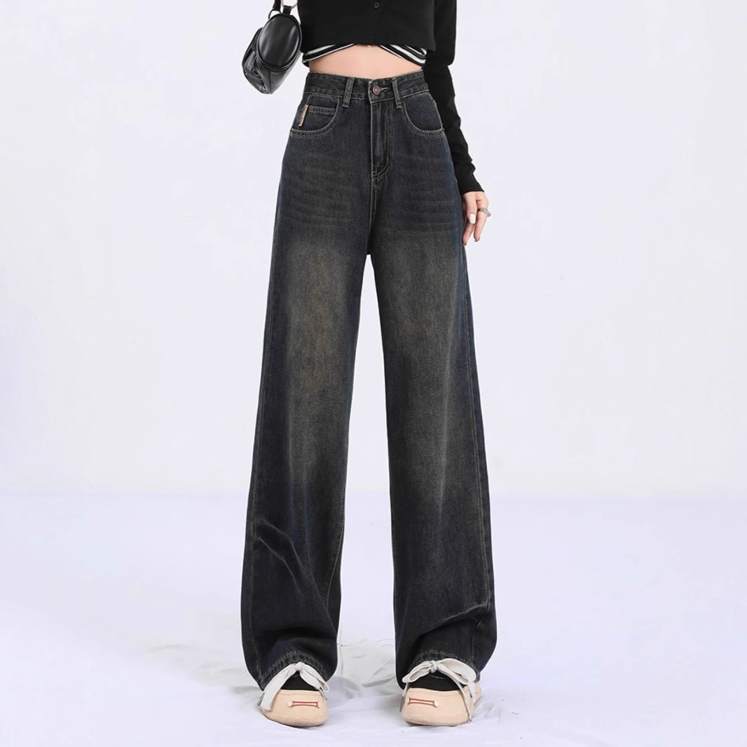 American retro dark regular pants zipper washed wide leg jeans women's fat mm plus casual straight leg pants trendy