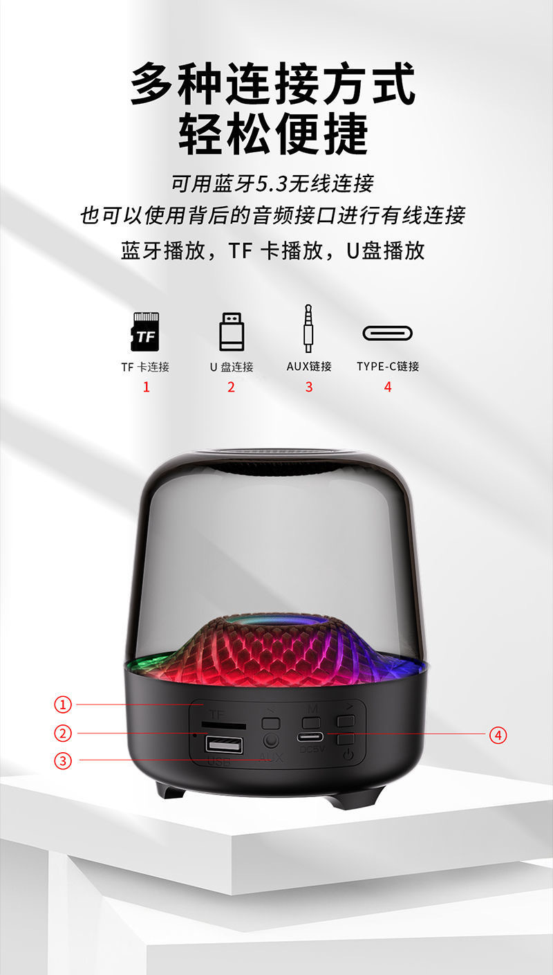 连接方式TF卡 USB AUX 3.5MM音频插口 蓝牙连接