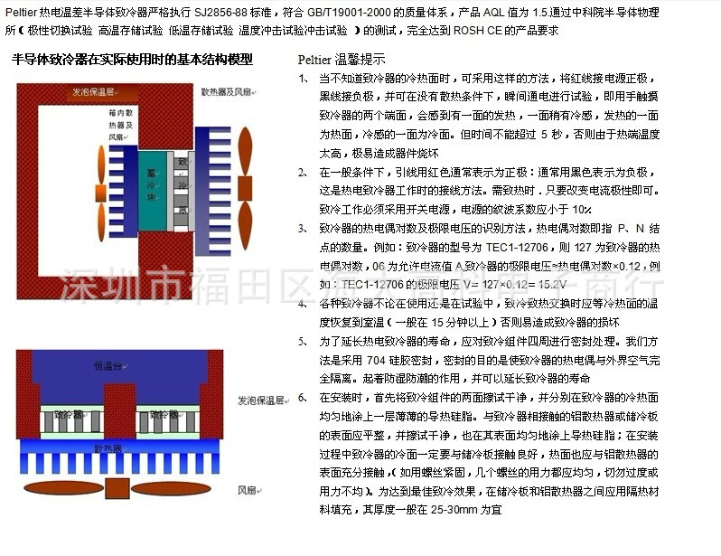 4.致冷片是由两面陶瓷面板和半导体材料通过低熔点焊料组合而成,强度都不高,属于易碎材料,在使用者务必请轻拿轻放,切勿磕碰,更不能从高空摔下,要避免因陶瓷面板破裂而造成损坏。
