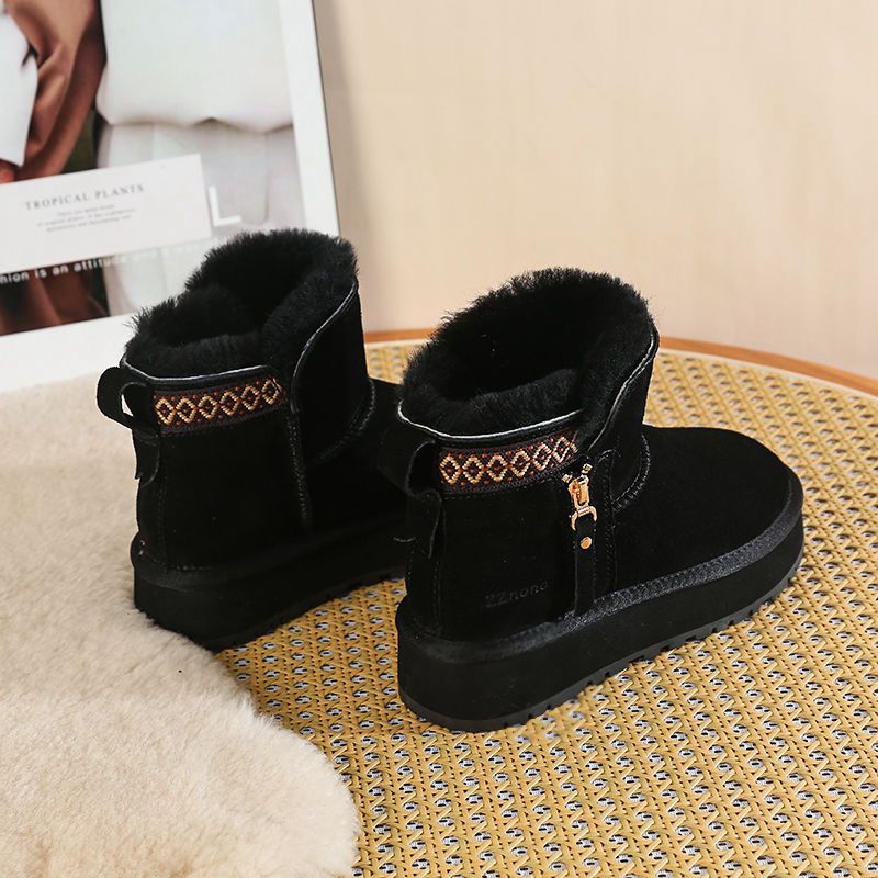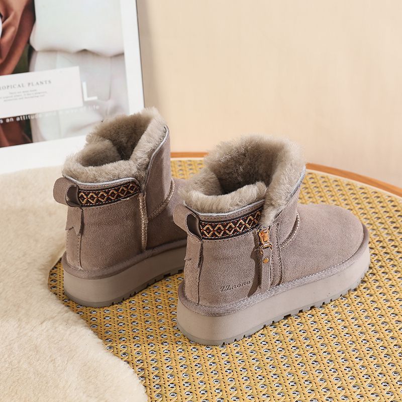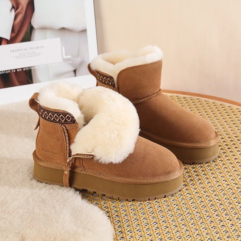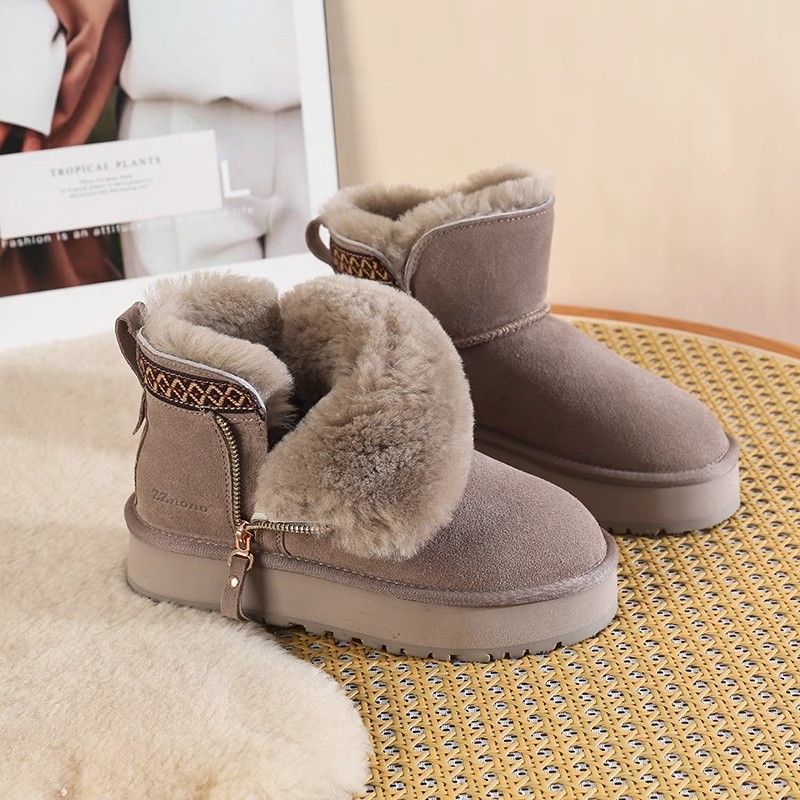 Wool snow boots, women's fur integrated 2025 new model, thick soled side zipper short boots with plush anti slip cotton shoes, chestnut color