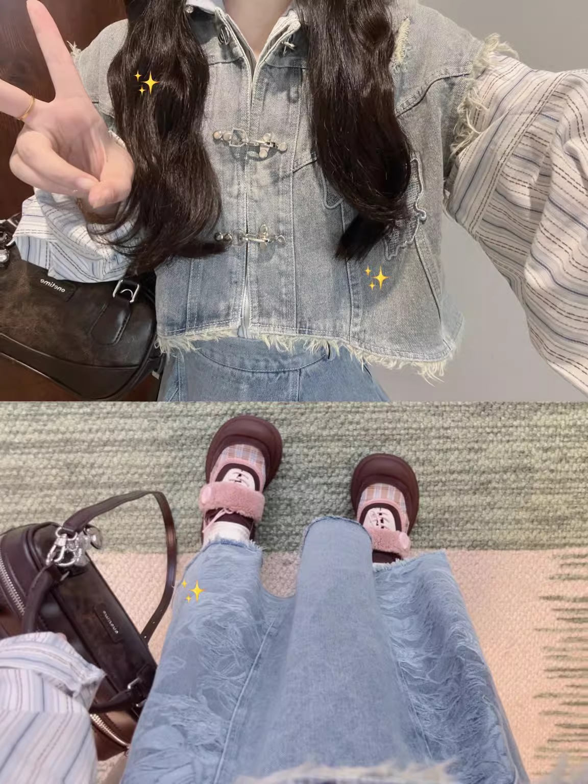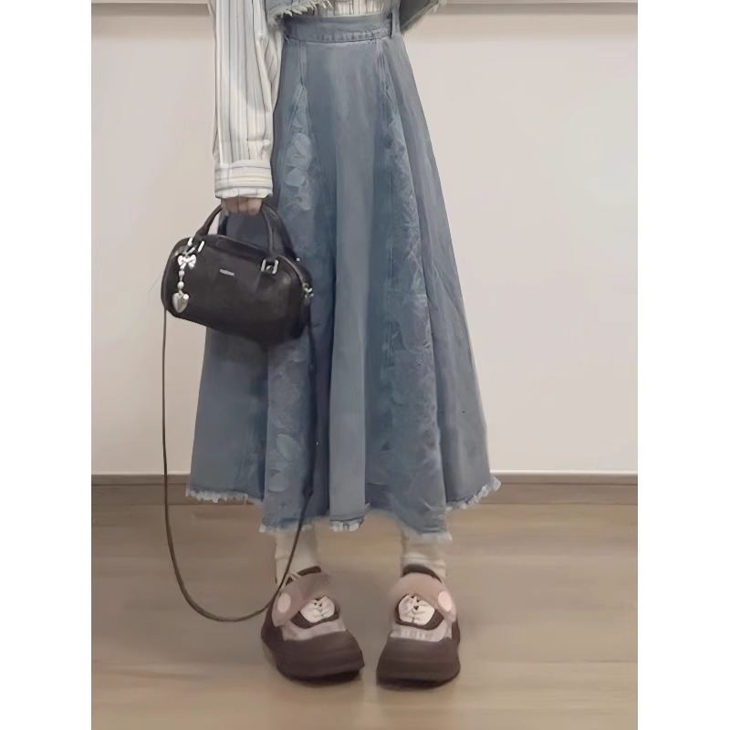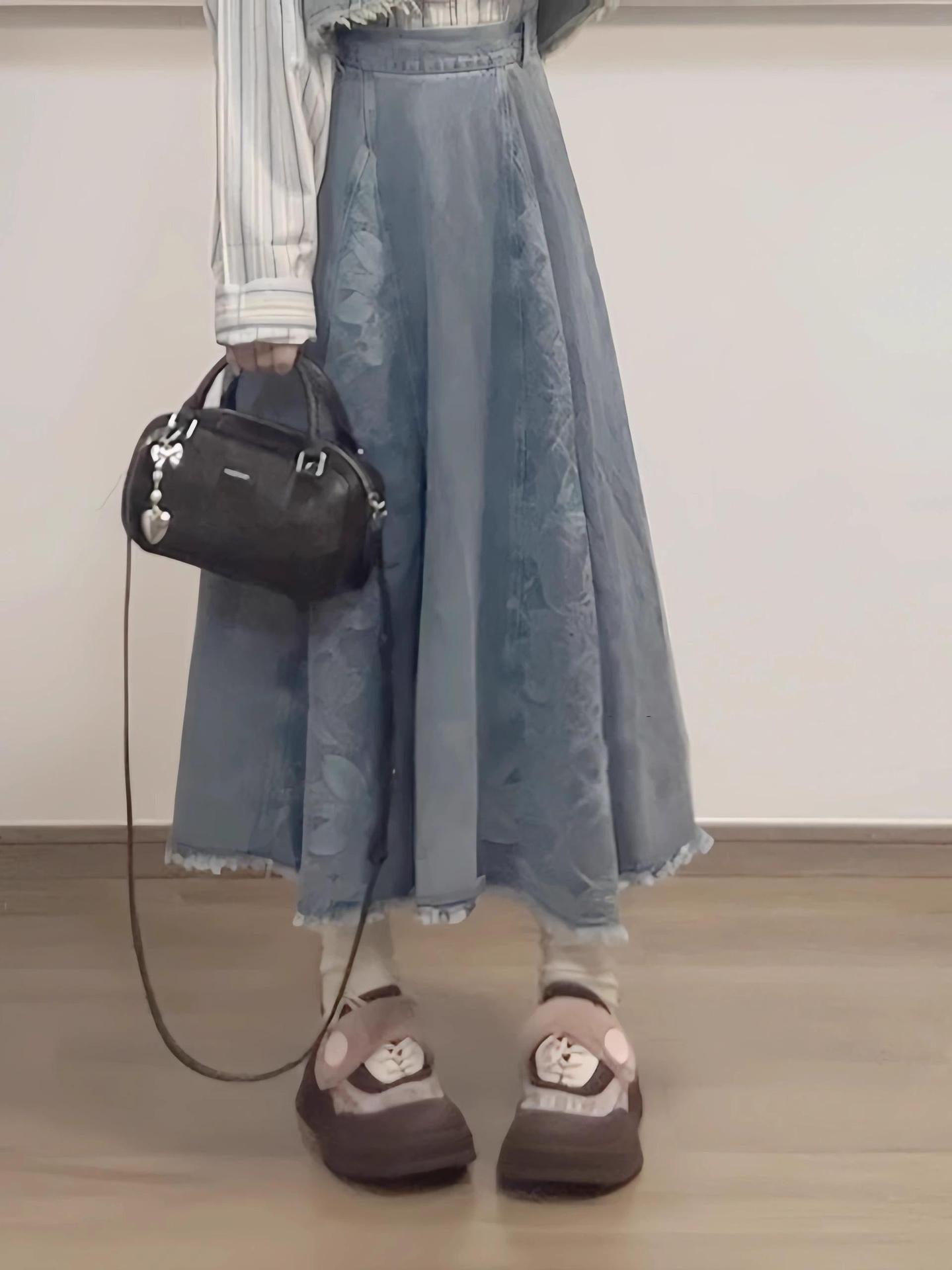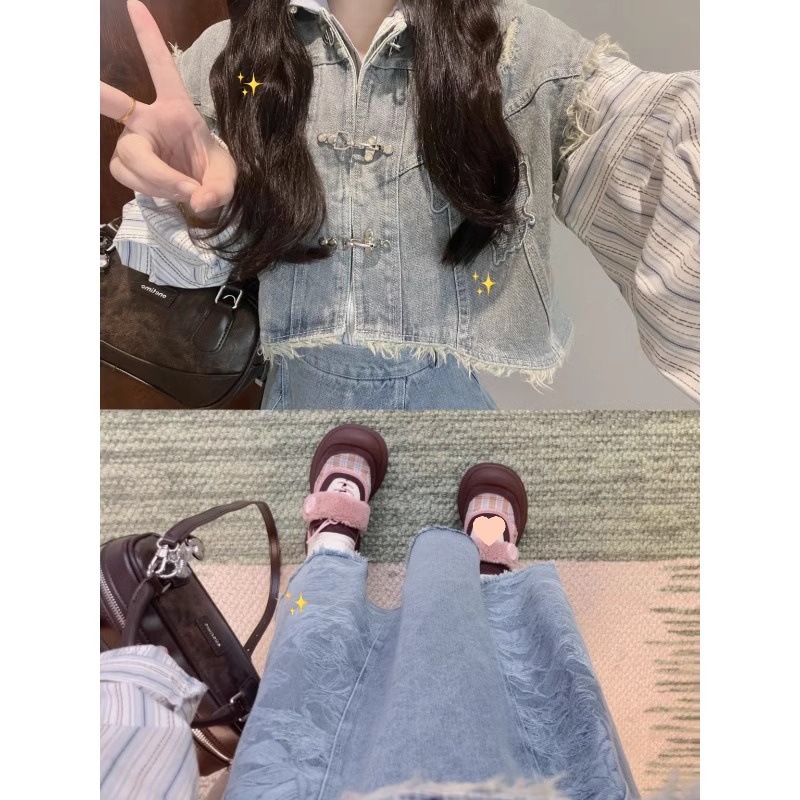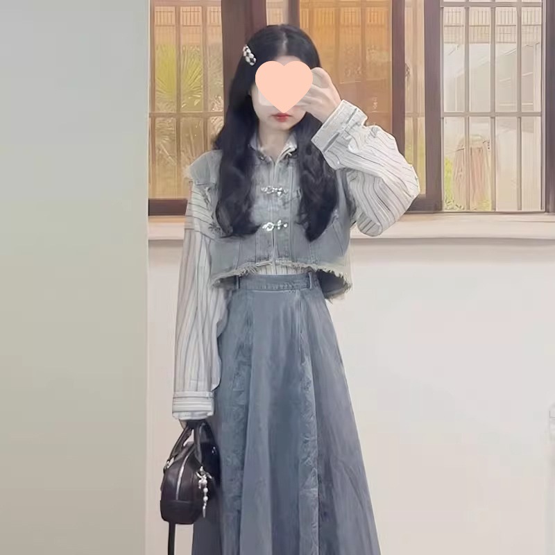 新中式牛仔汉服套装女秋冬新款短款毛边马甲叠穿衬衫半身裙三件套