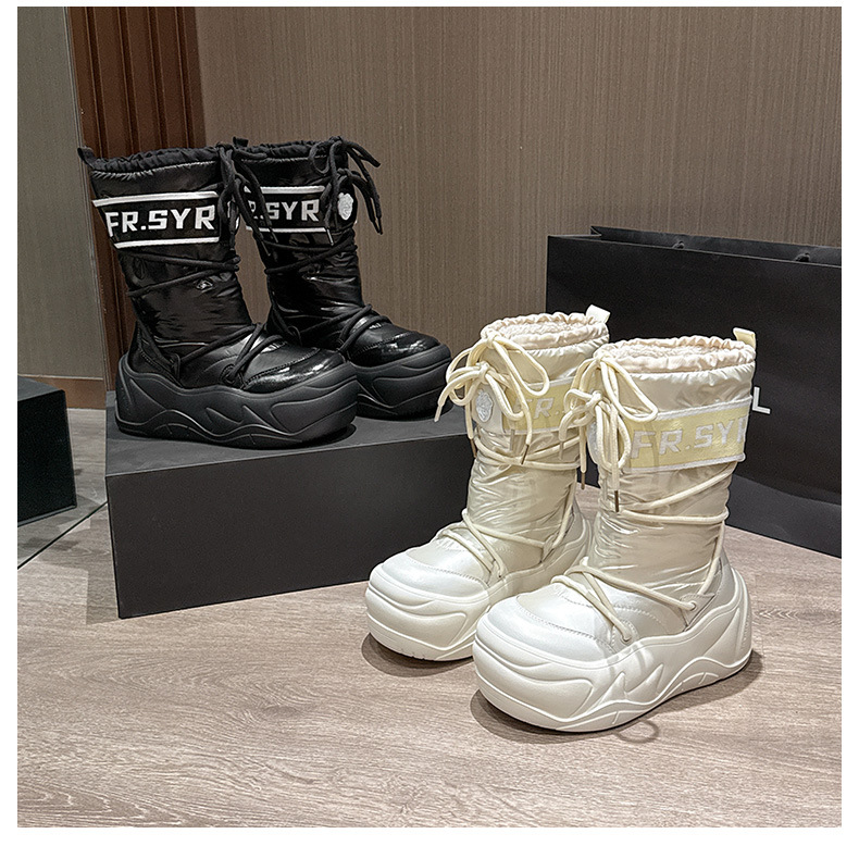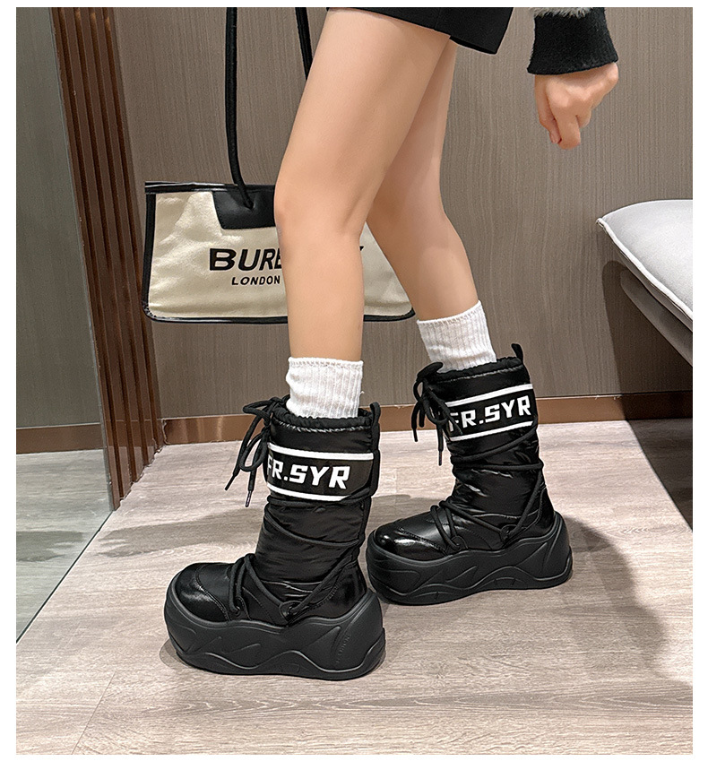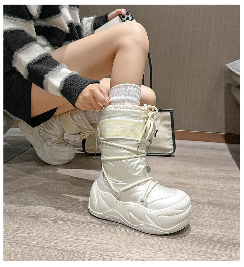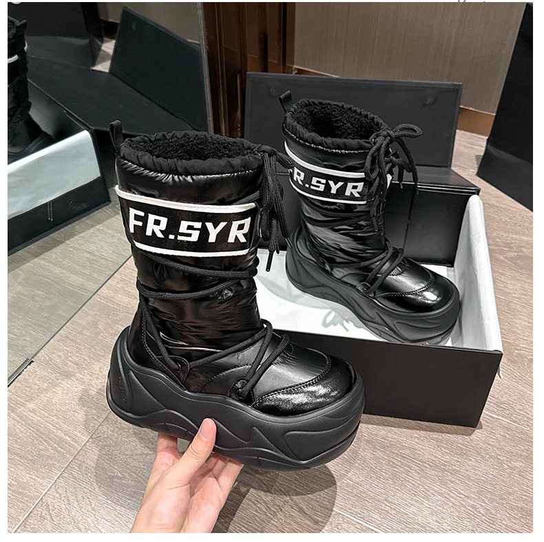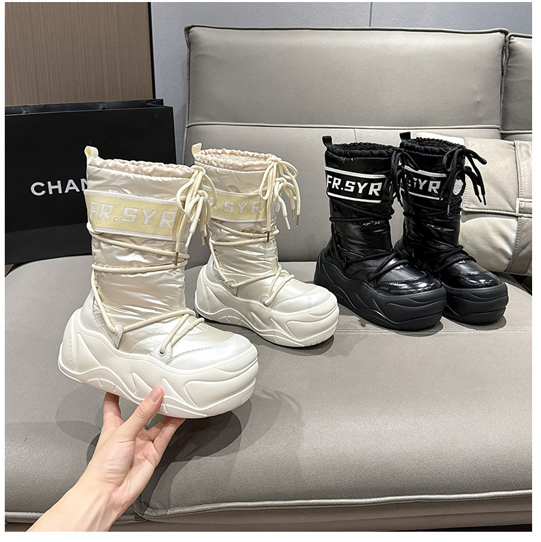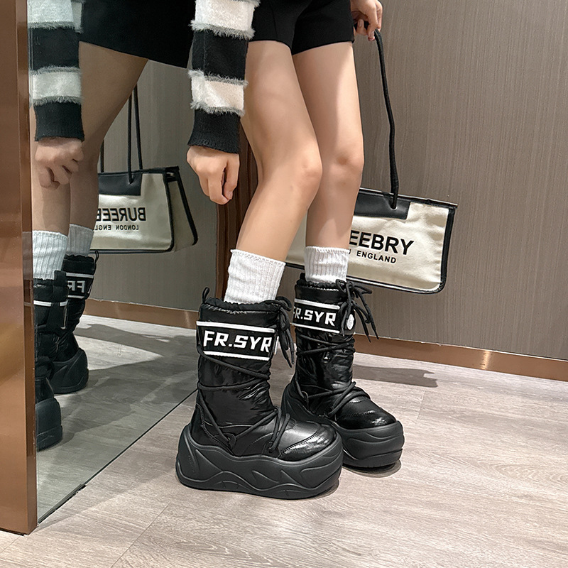 7CM thick soled warm snow boots for children, 2025 autumn and winter new style, mid tube with plush, ugly and cute moon boots, lace up cotton boots
