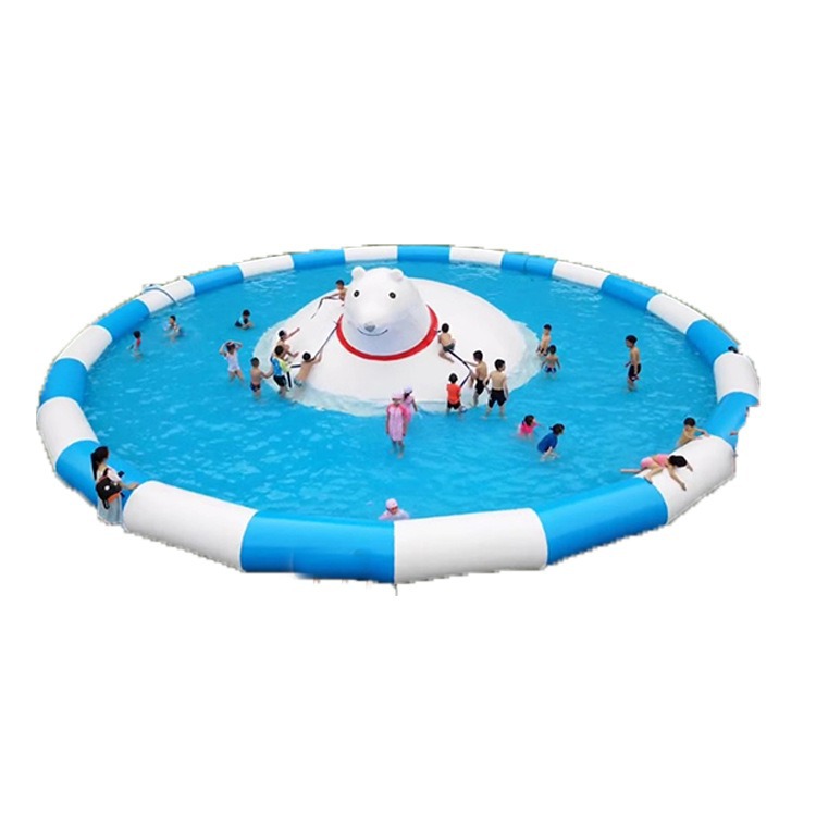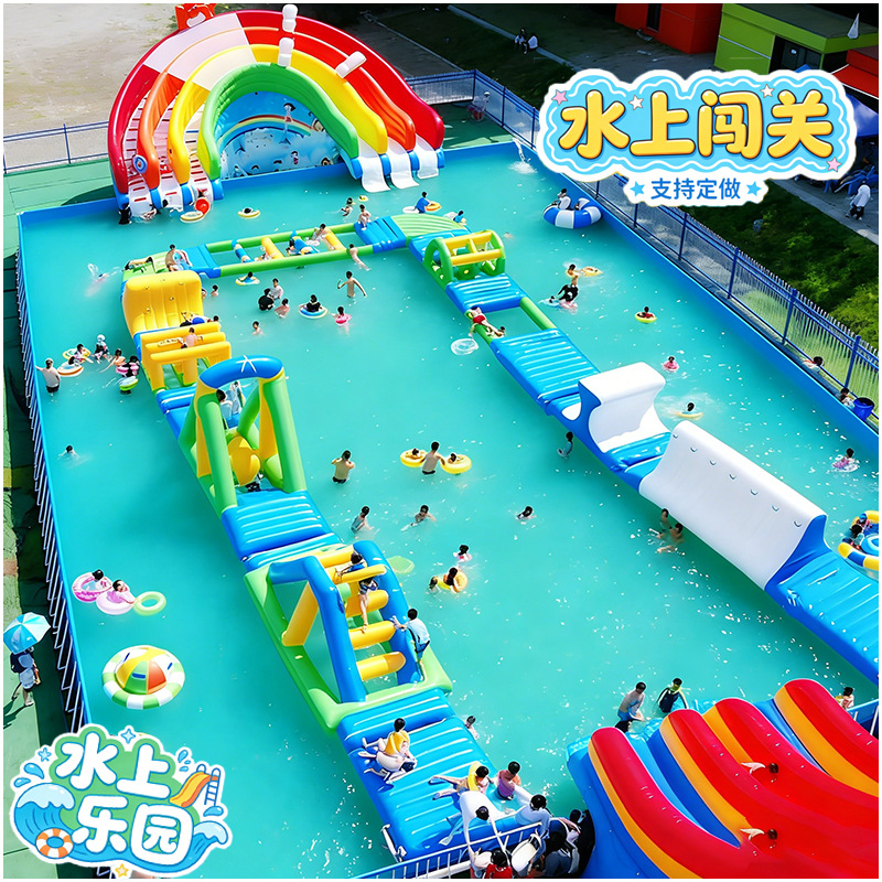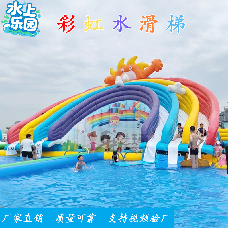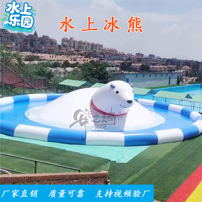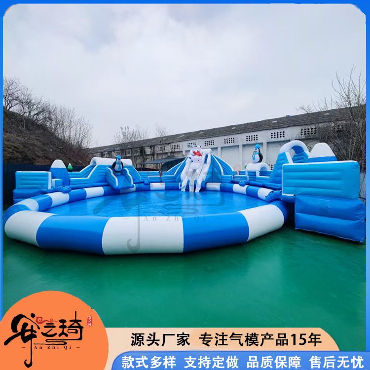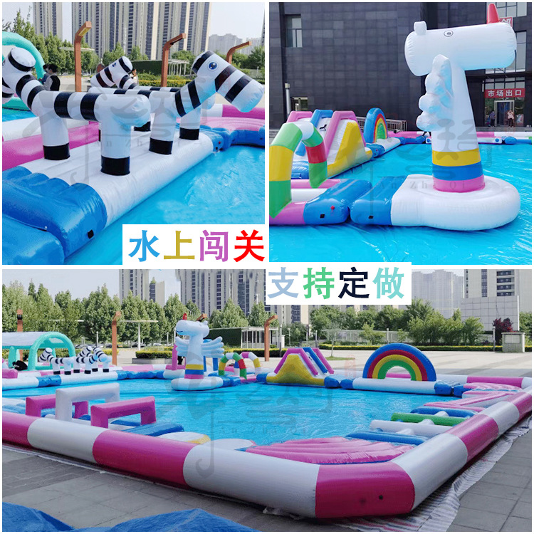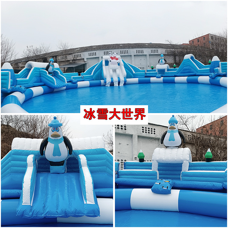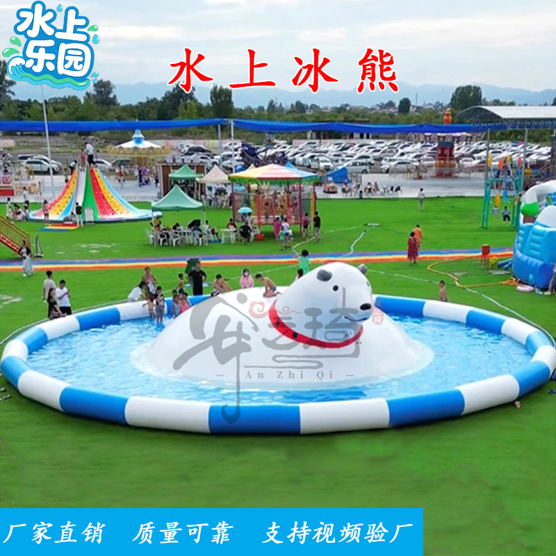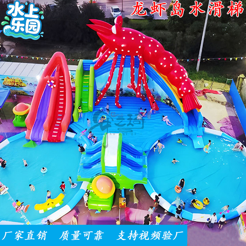 Большой аквапарк, парк развлечений на открытом воздухе, водные горки единорогов, дети, надувные омары, водные ледяные медведи на острове