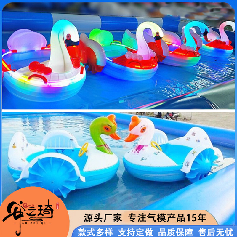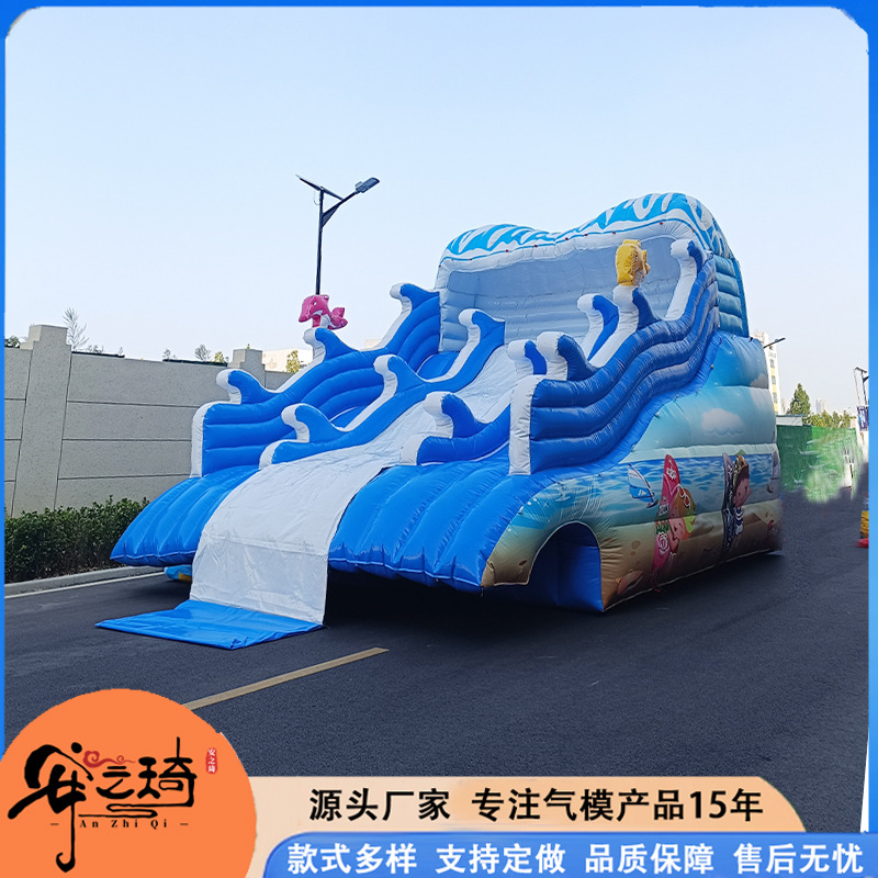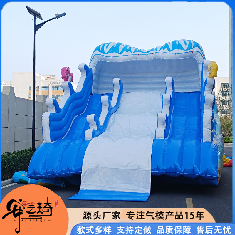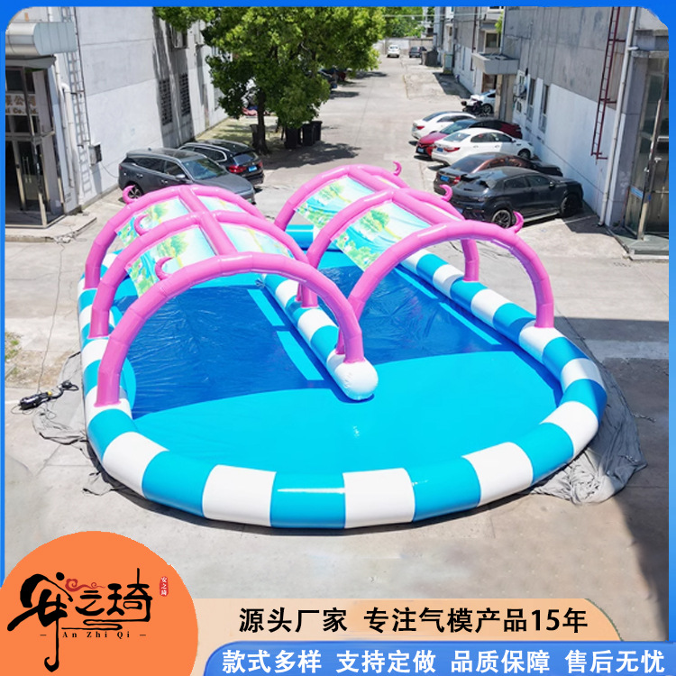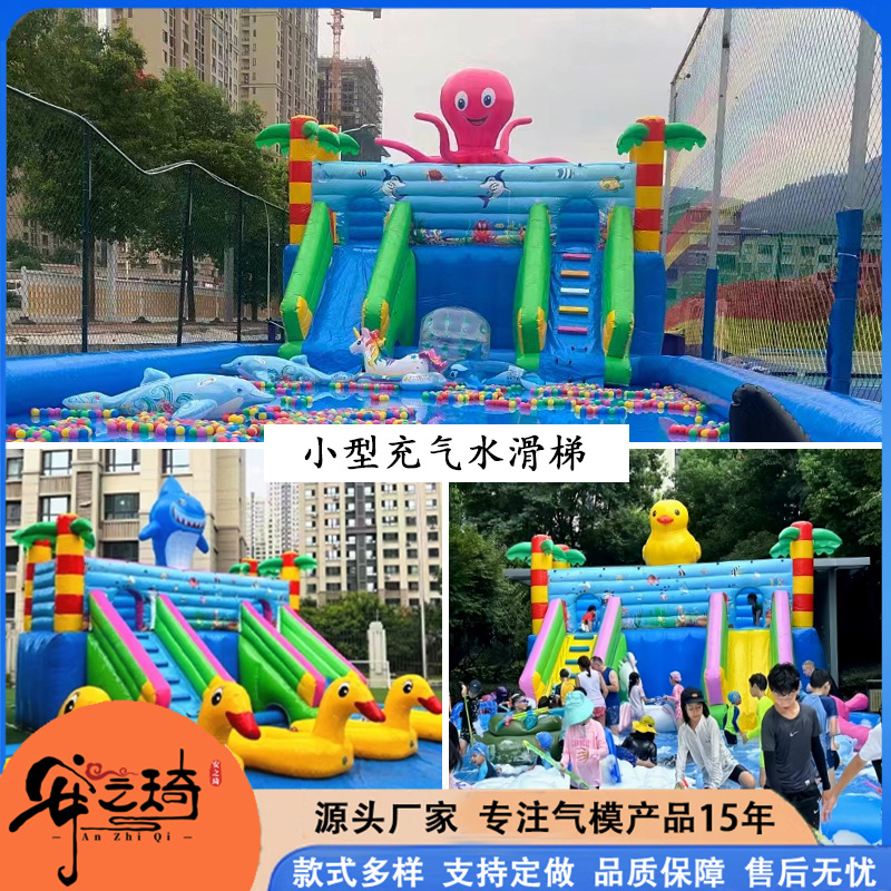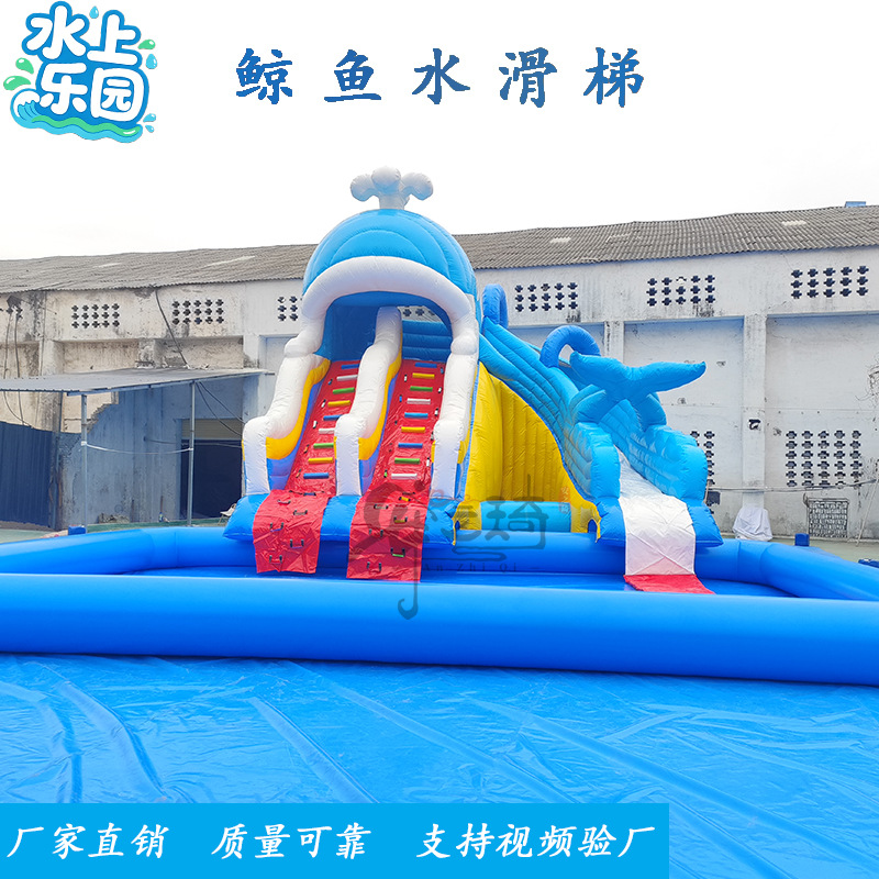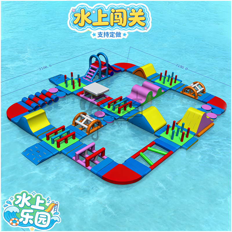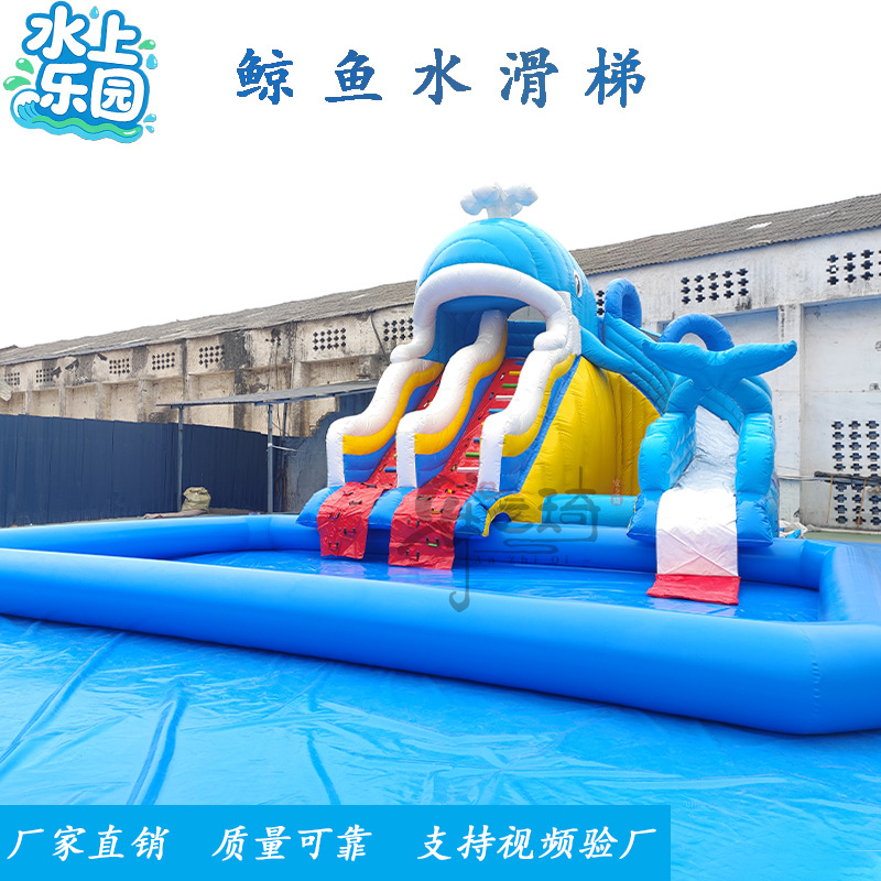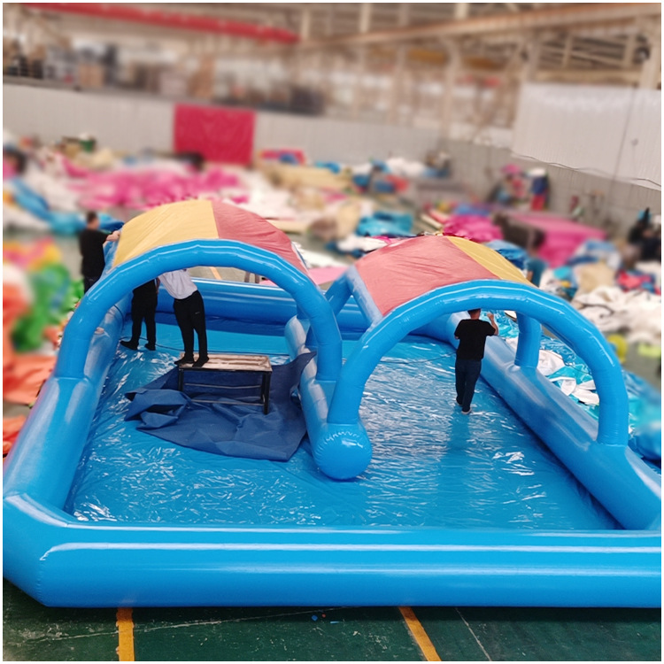 Большой аквапарк, парк развлечений на открытом воздухе, водные горки единорогов, дети, надувные омары, водные ледяные медведи на острове