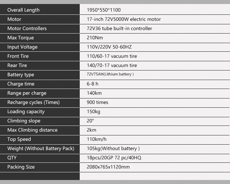 | название продукта | 100 км / ч190 - 65 - 110Свинцовокислый 72V20AH - 72V32AH / литиевый аккумулятор 72V20AH - 72V100AH |