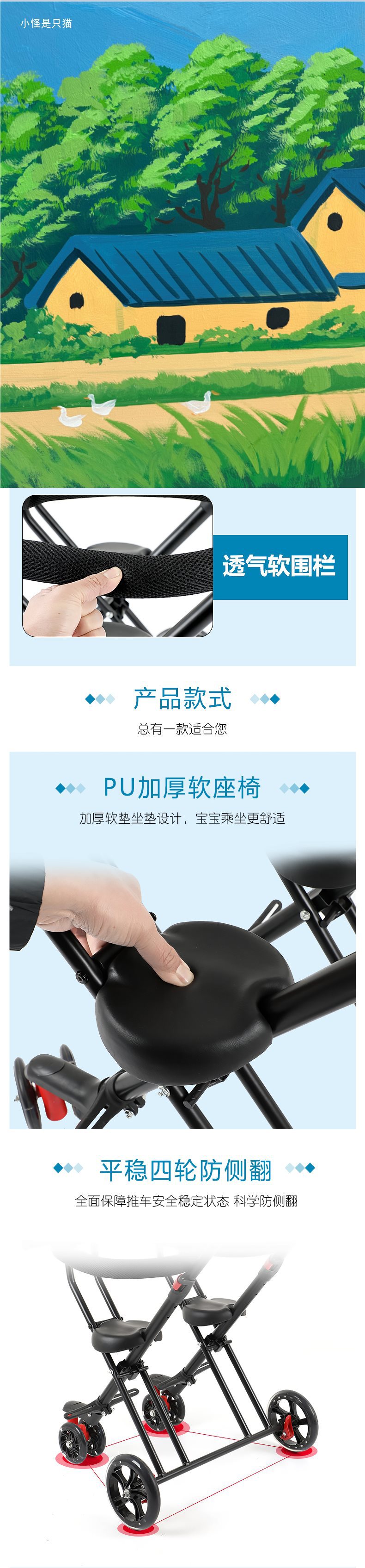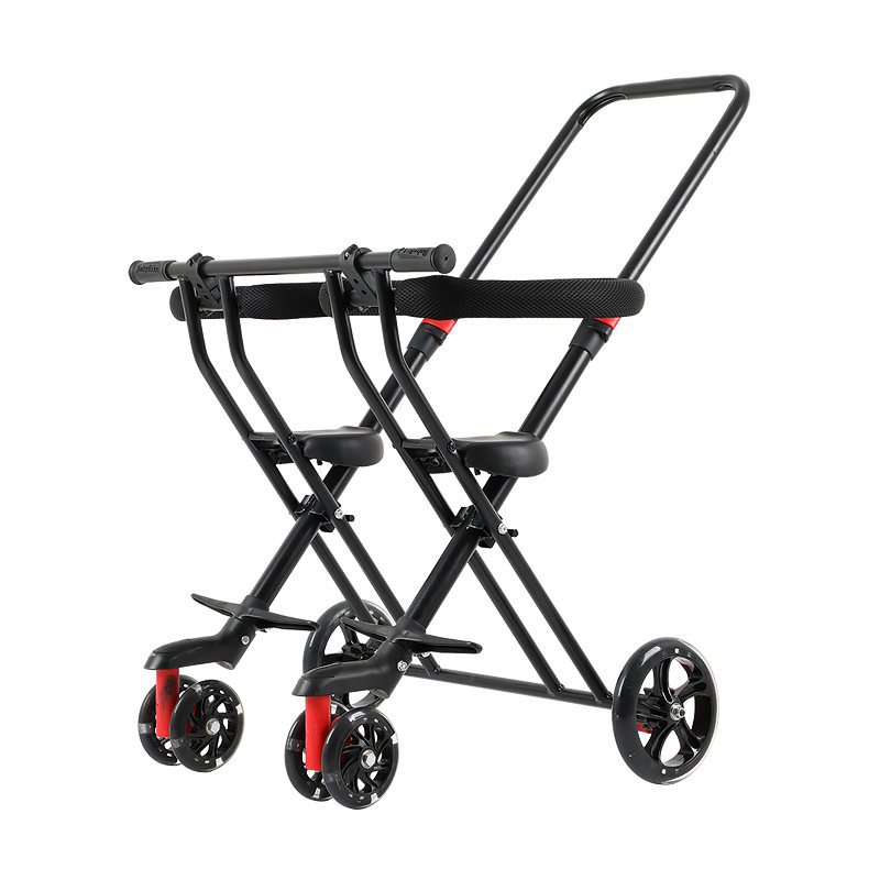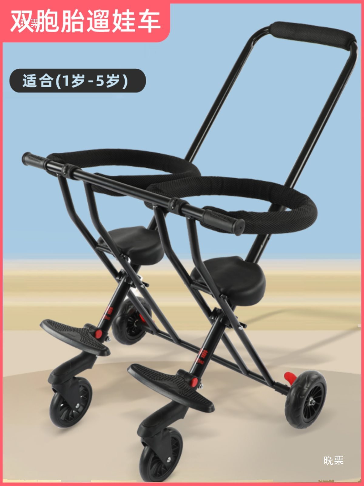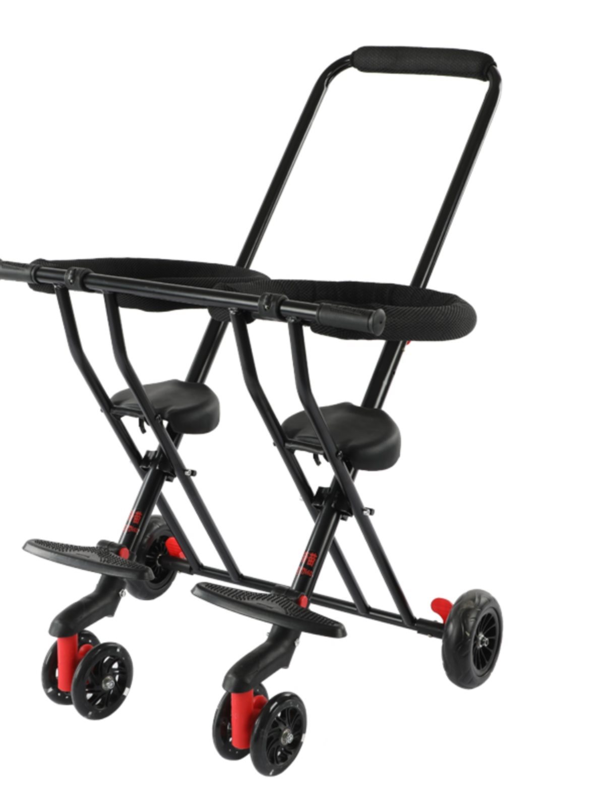 Трехколесный велосипед для детей - близнецов, двойная тележка, сложенная детская тележка, и дети выходят из дома.