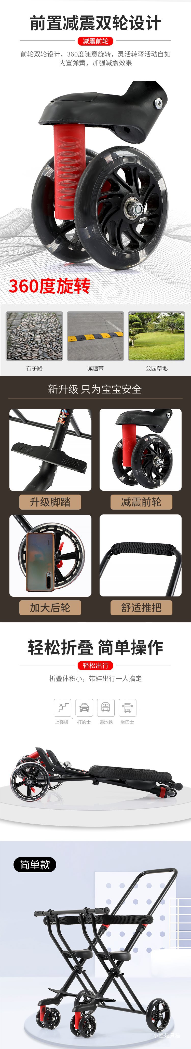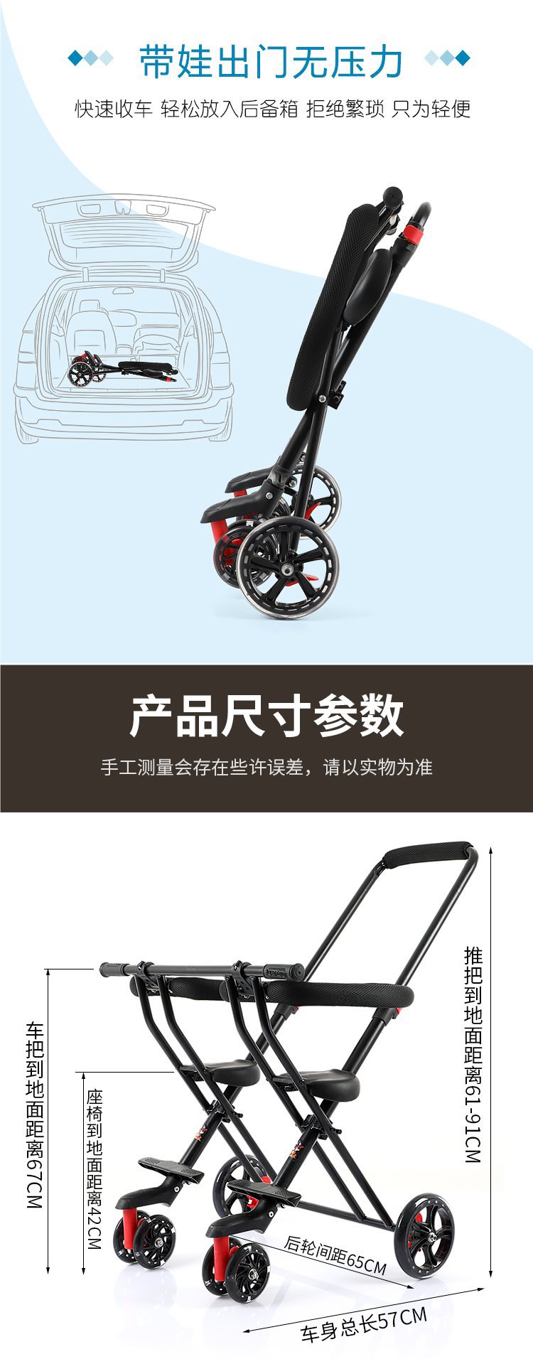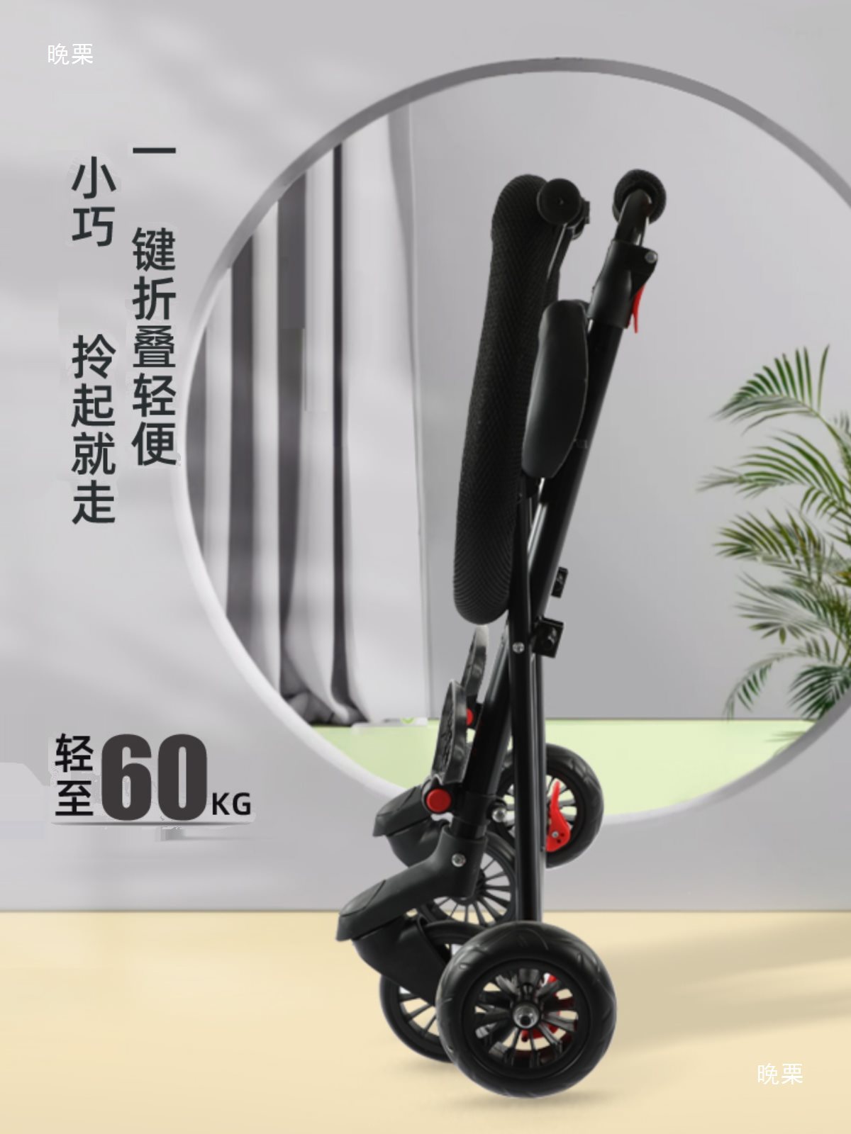 Трехколесный велосипед для детей - близнецов, двойная тележка, сложенная детская тележка, и дети выходят из дома.