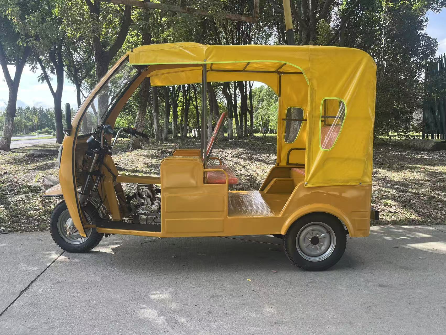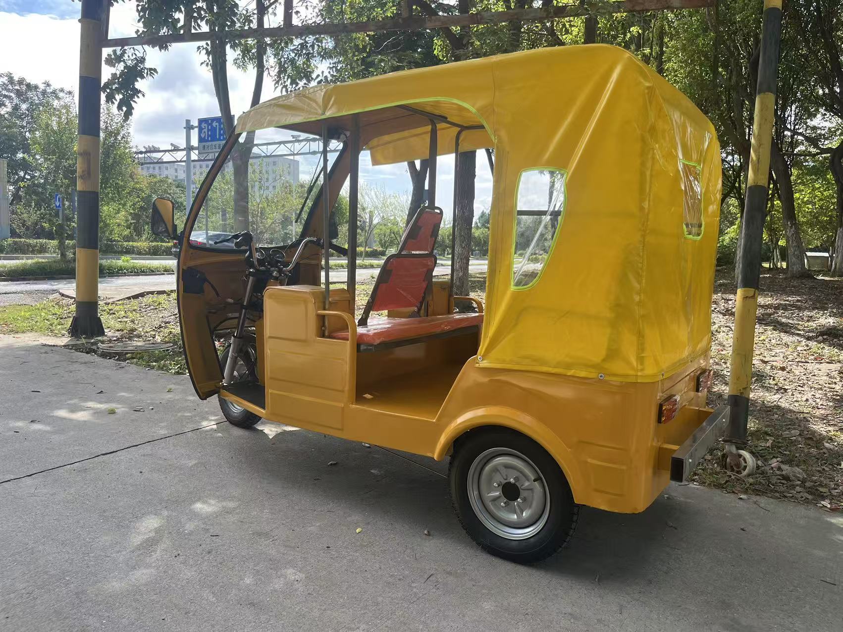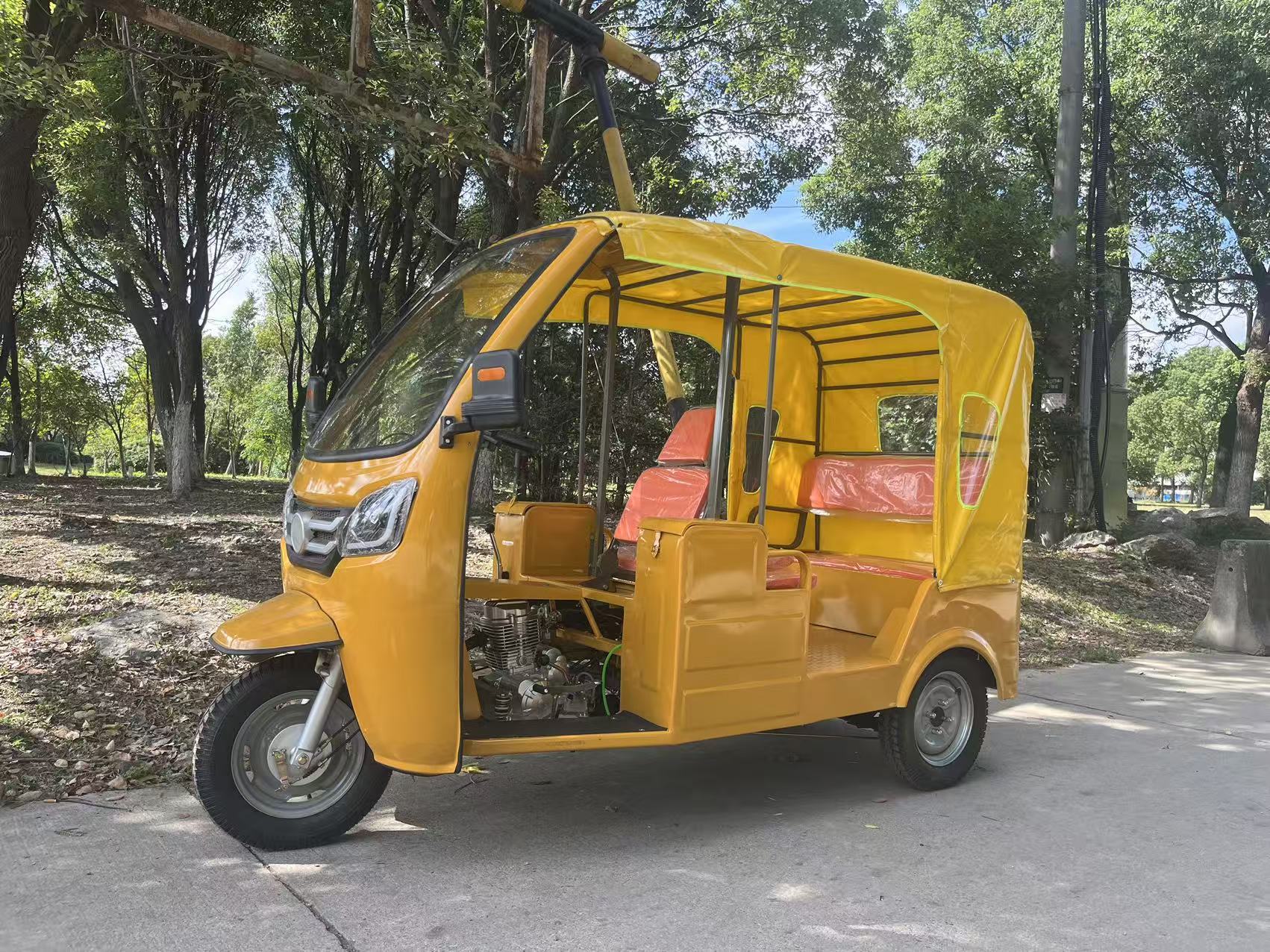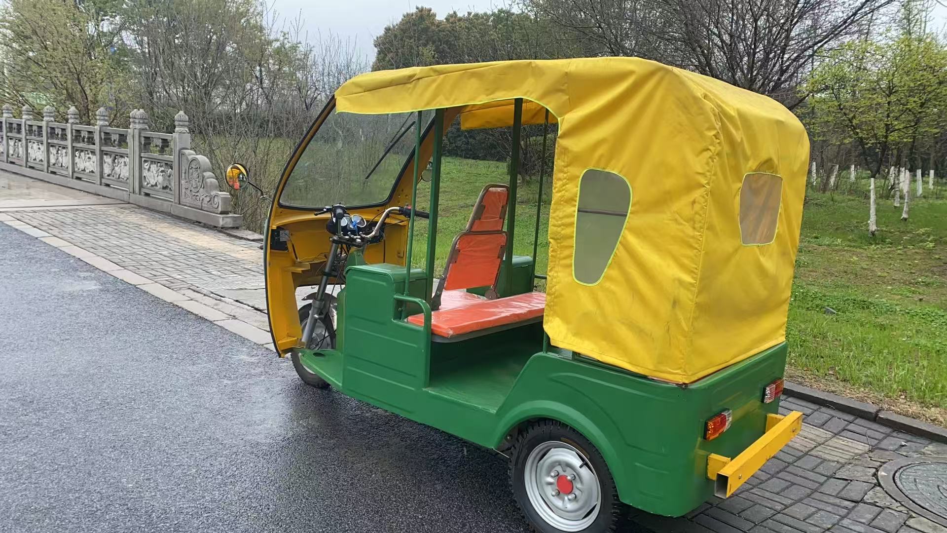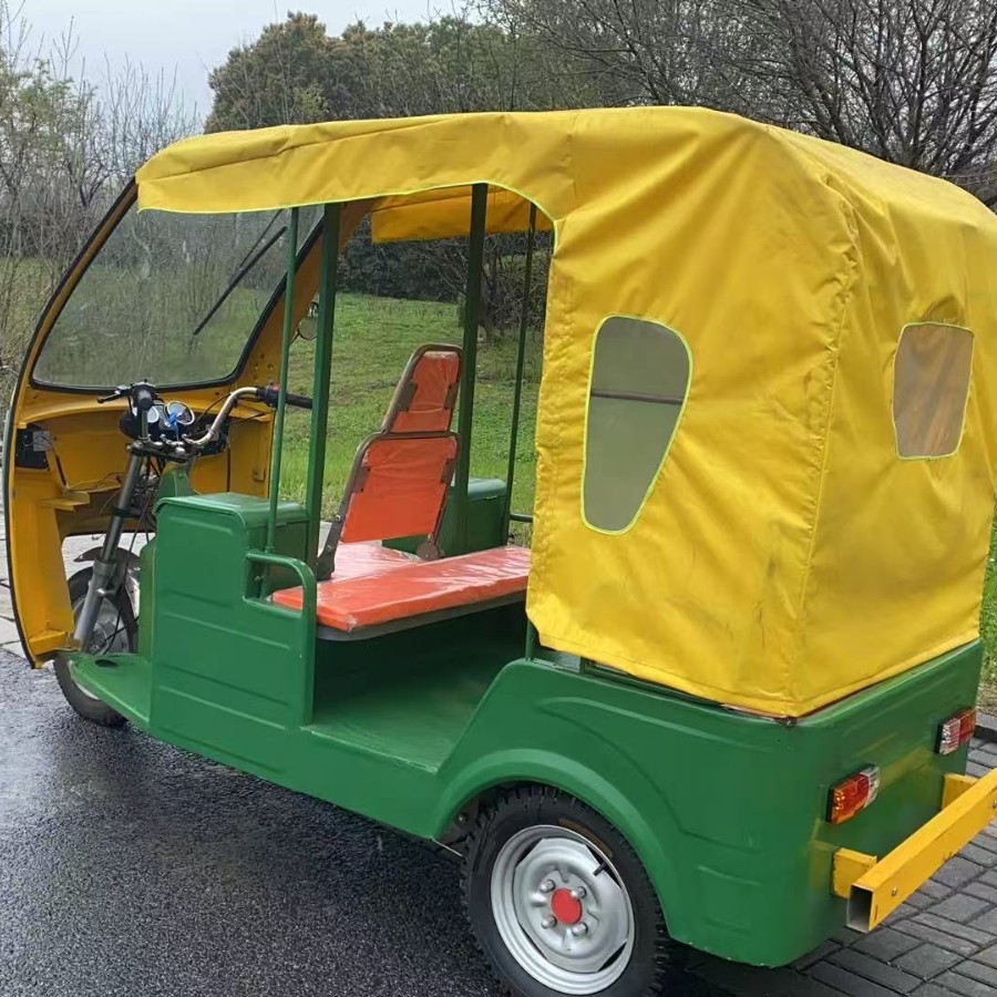 Трехколесный велосипед с передним навесом, мягким навесом, двухрядные сиденья.