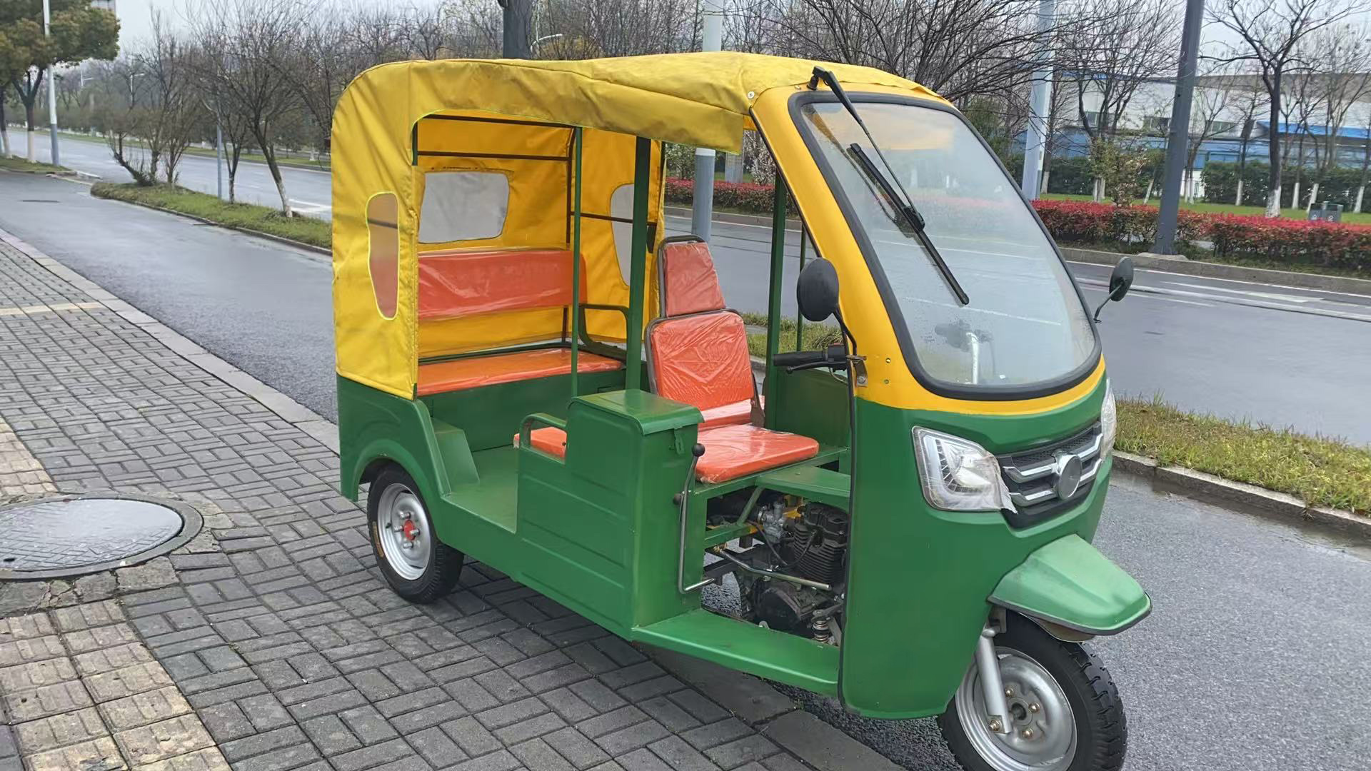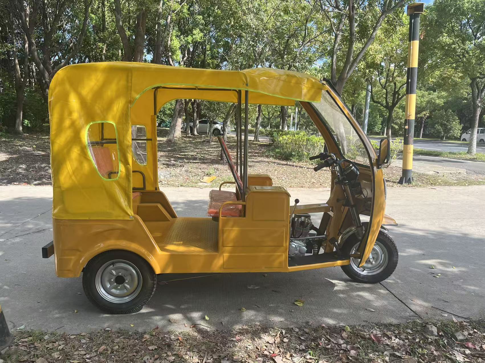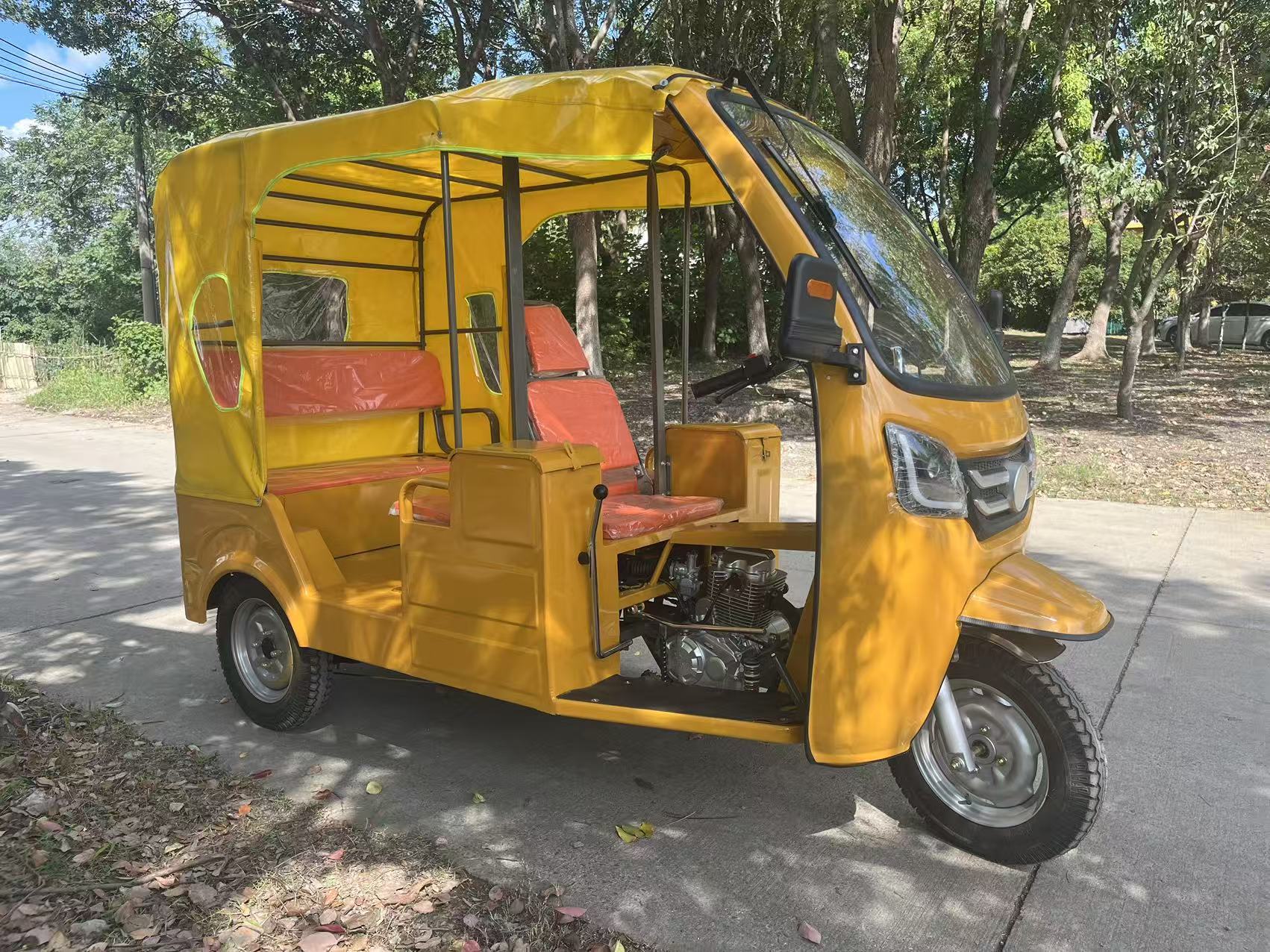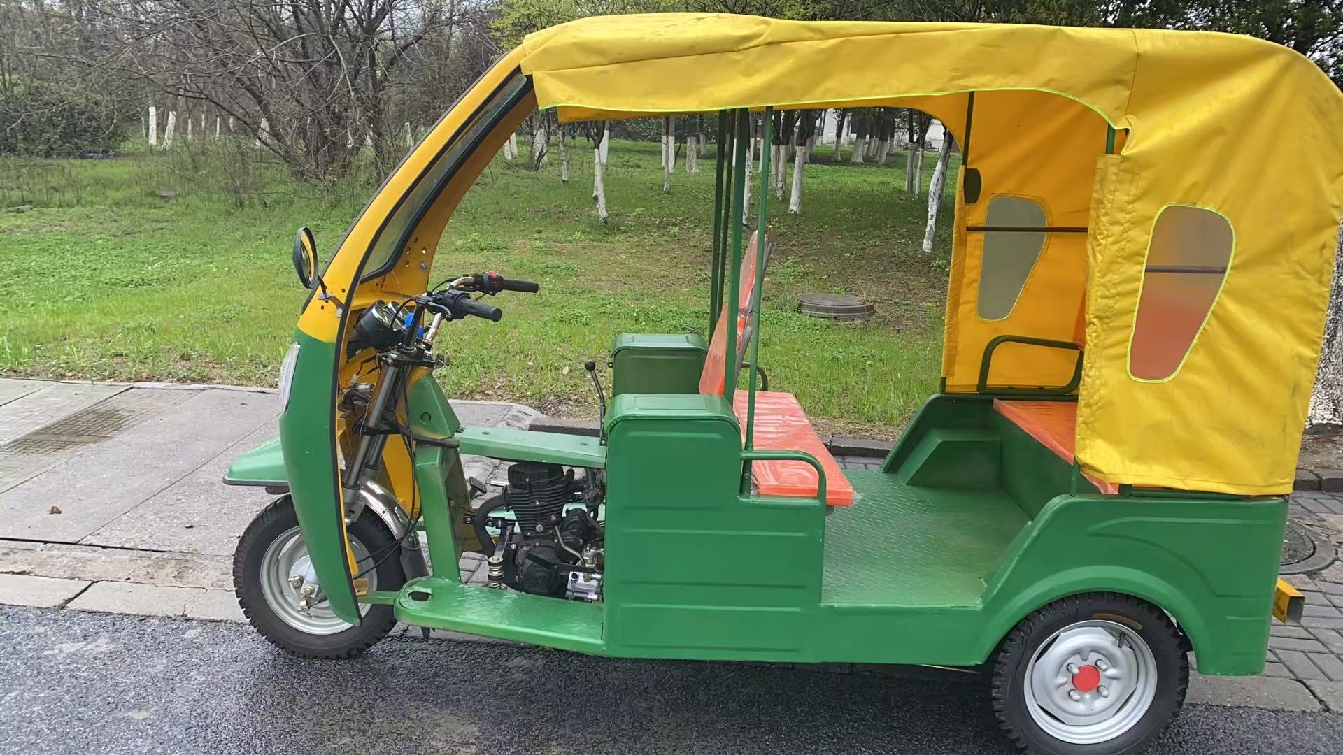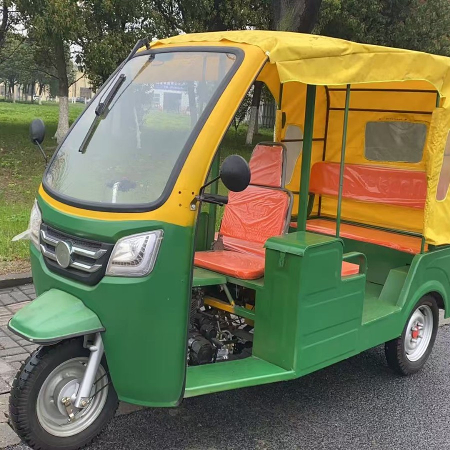 Трехколесный велосипед с передним навесом, мягким навесом, двухрядные сиденья.